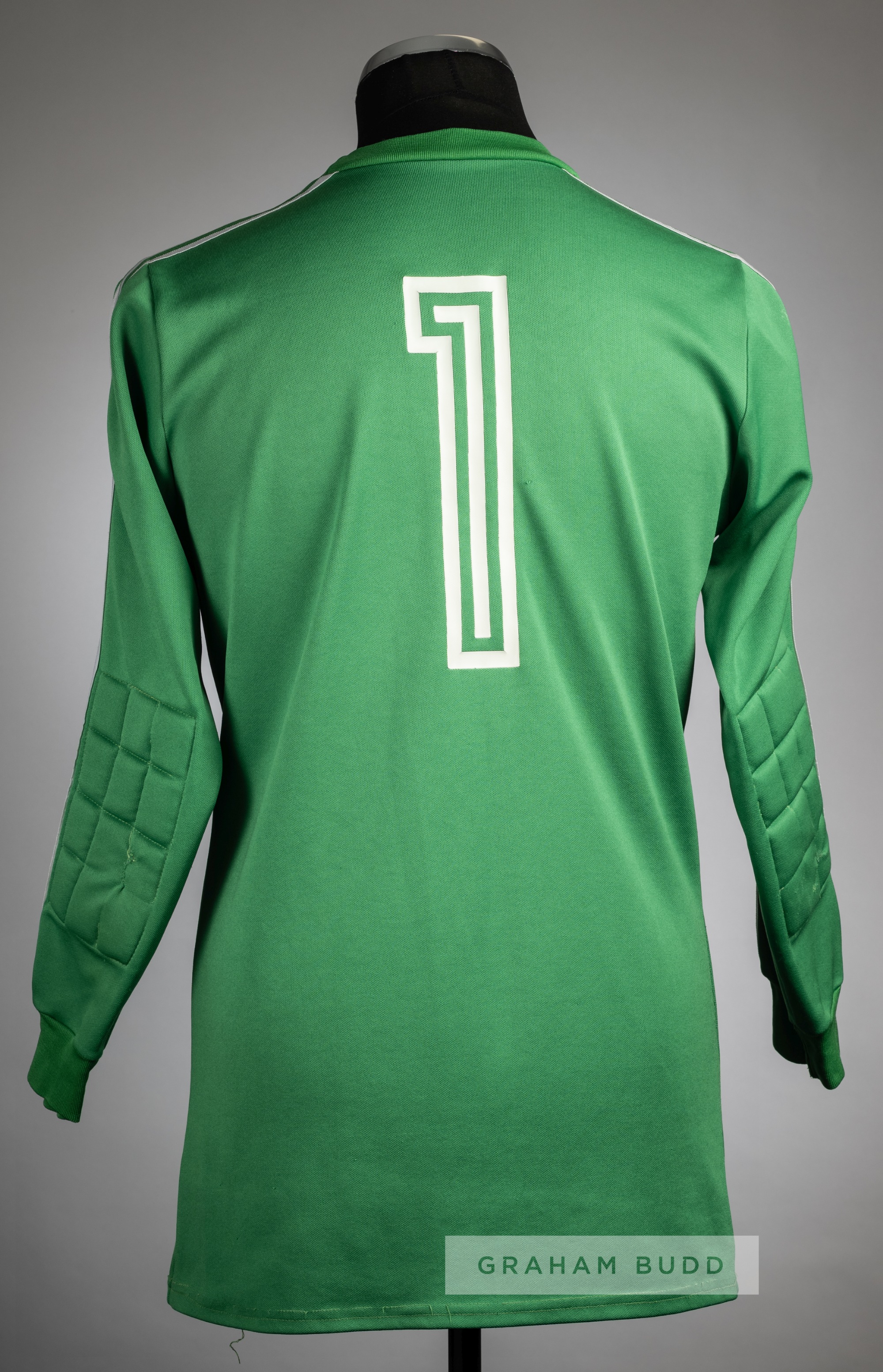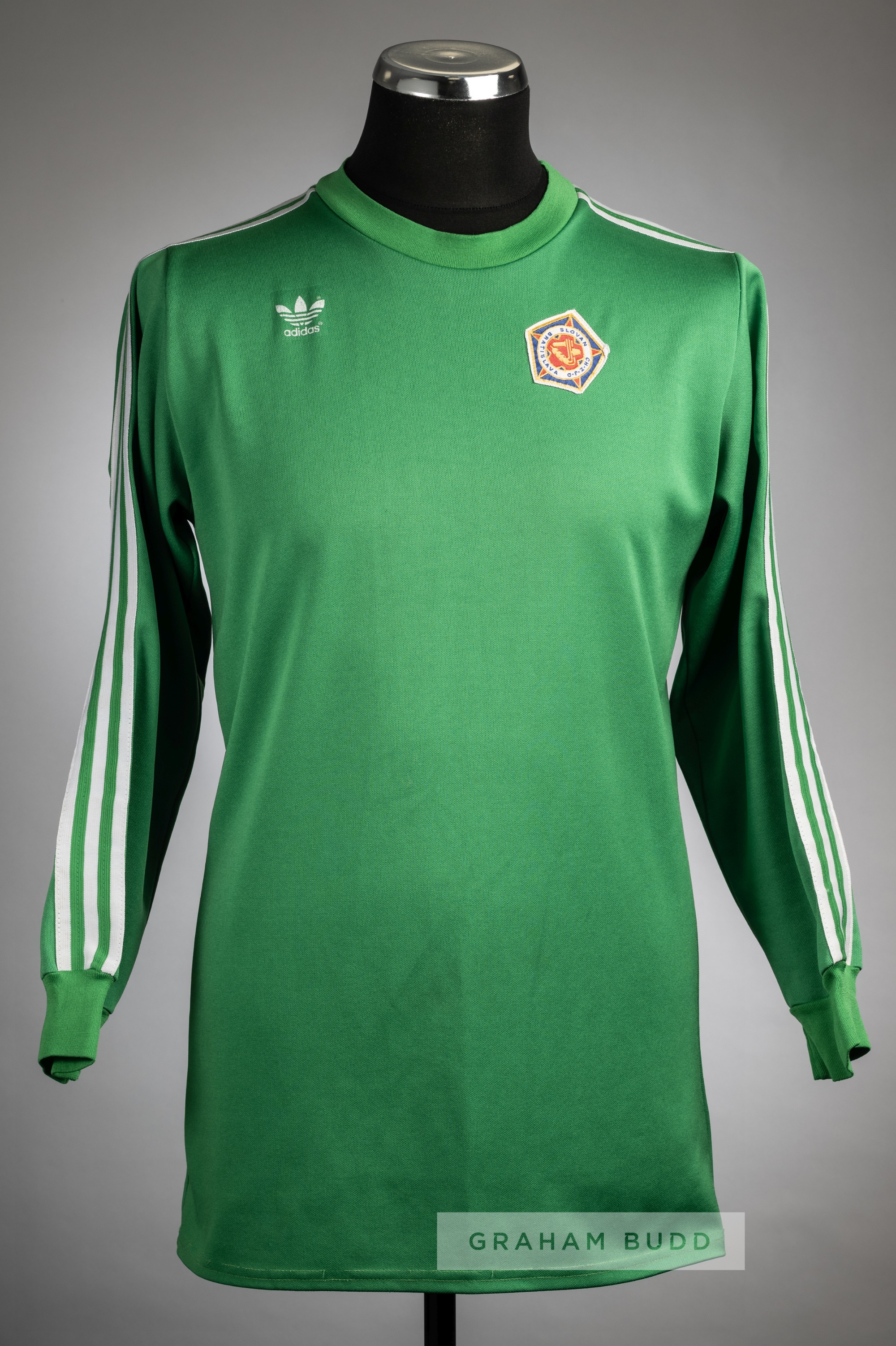 Green Slovan Bratislava No.1 goalkeeper's jersey, circa 1984, Adidas, long-sleeved with club crest badge, reverse numbered 1, bears wear and repairs to the sleeve pads Provenance: Peter Corder of Tottenham Hotspur, swap jersey.