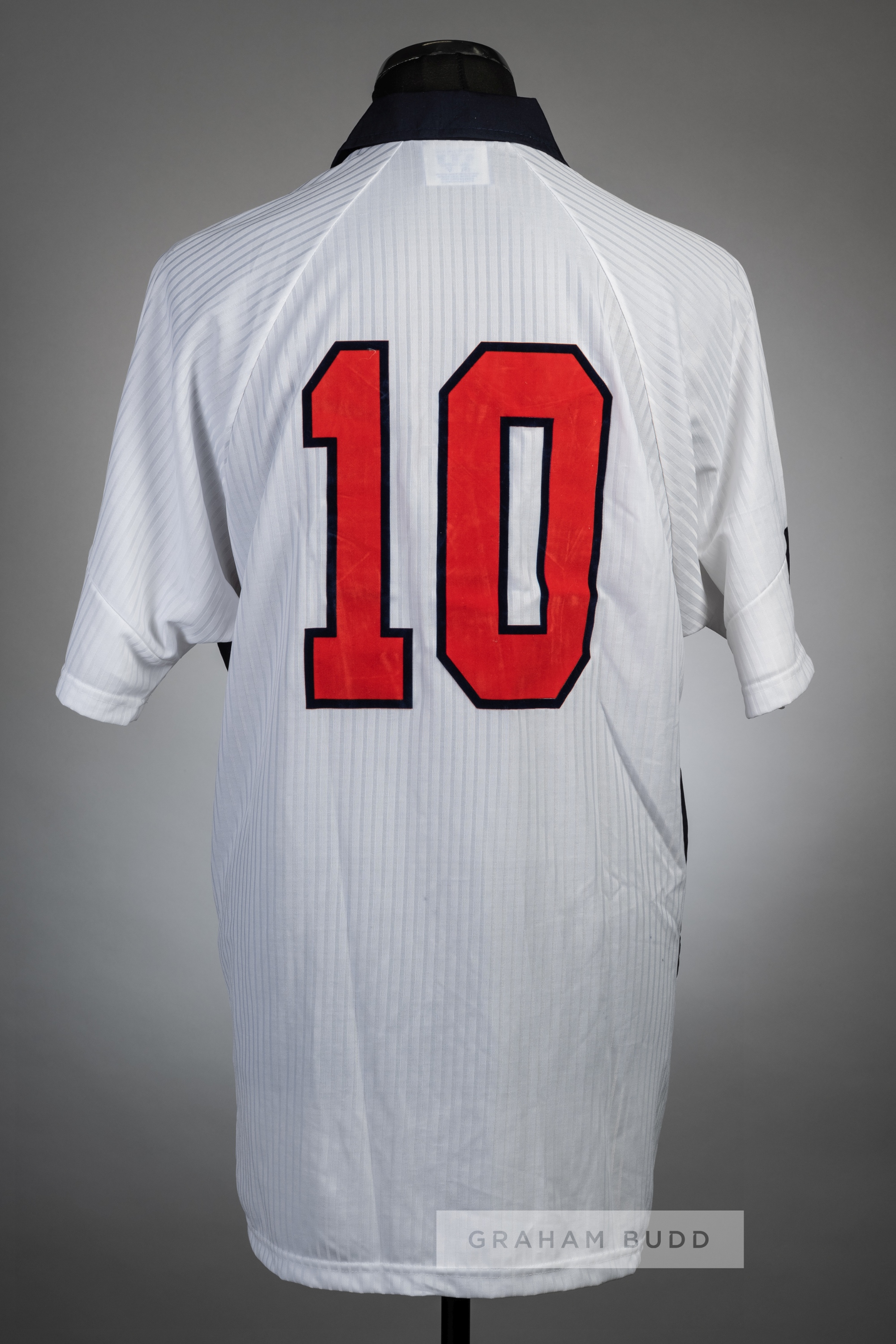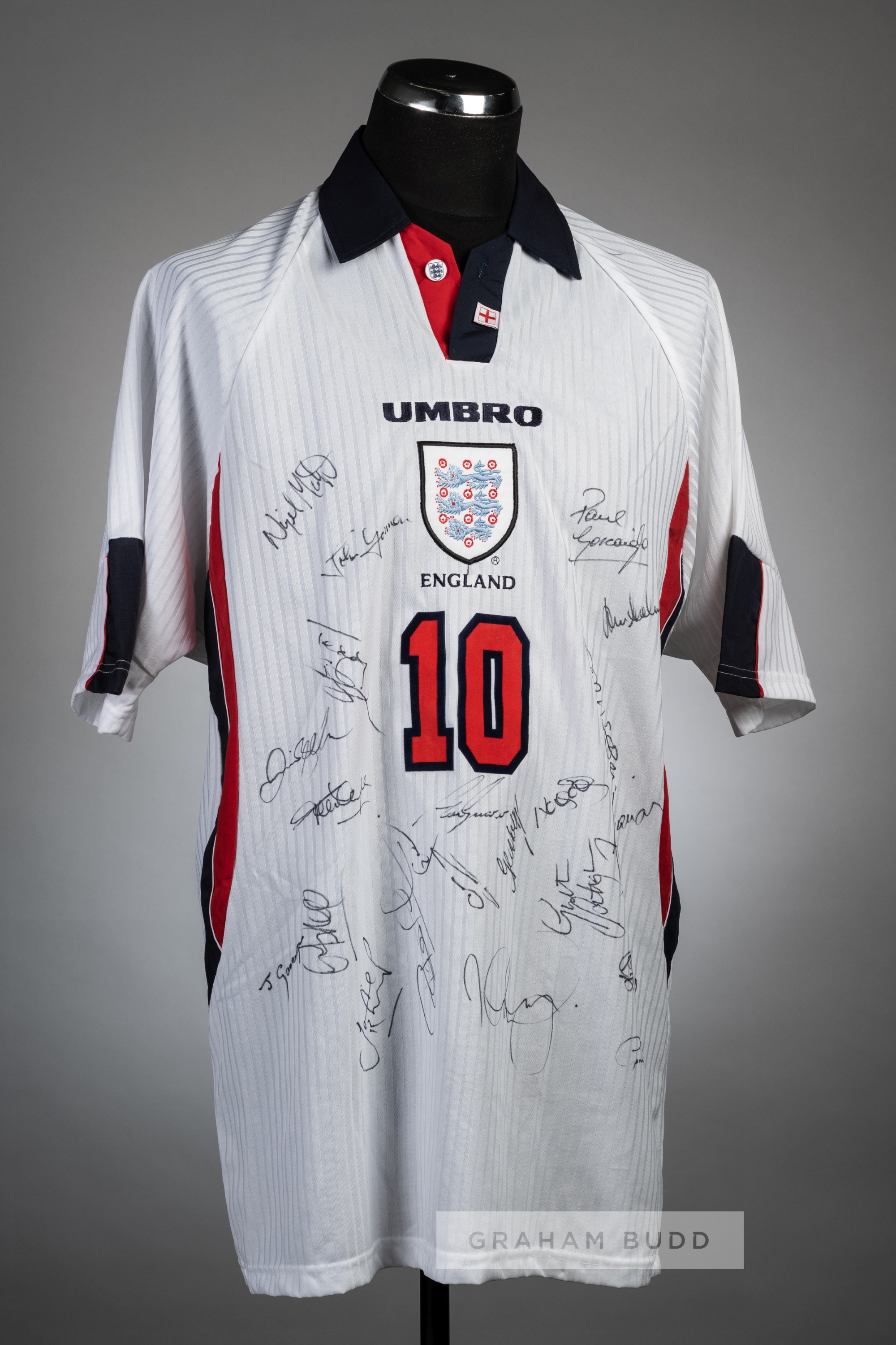 Team signed Teddy Sheringham white England No.10 home jersey, circa 1997, Umbro, short sleeved with England three lion emblem and sponsor logo, reverse numbered 10, signed in black marker pen by approx. 20 players, including Sheringham, Le Saux, Gascoigne, Martyn, and others