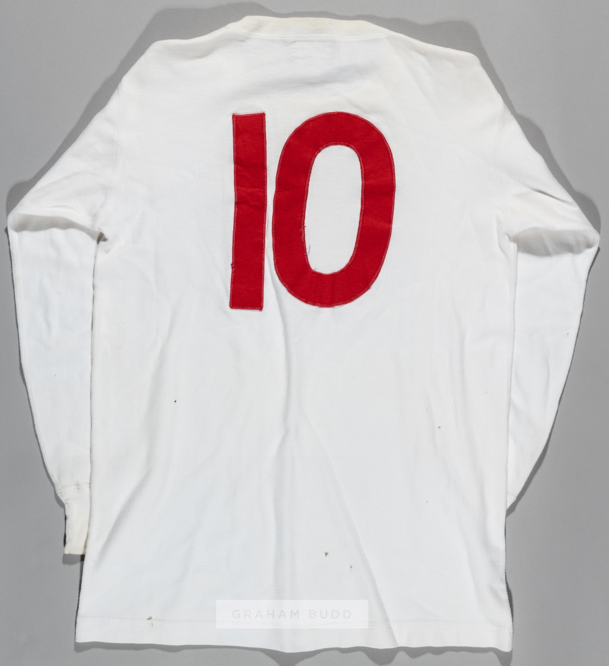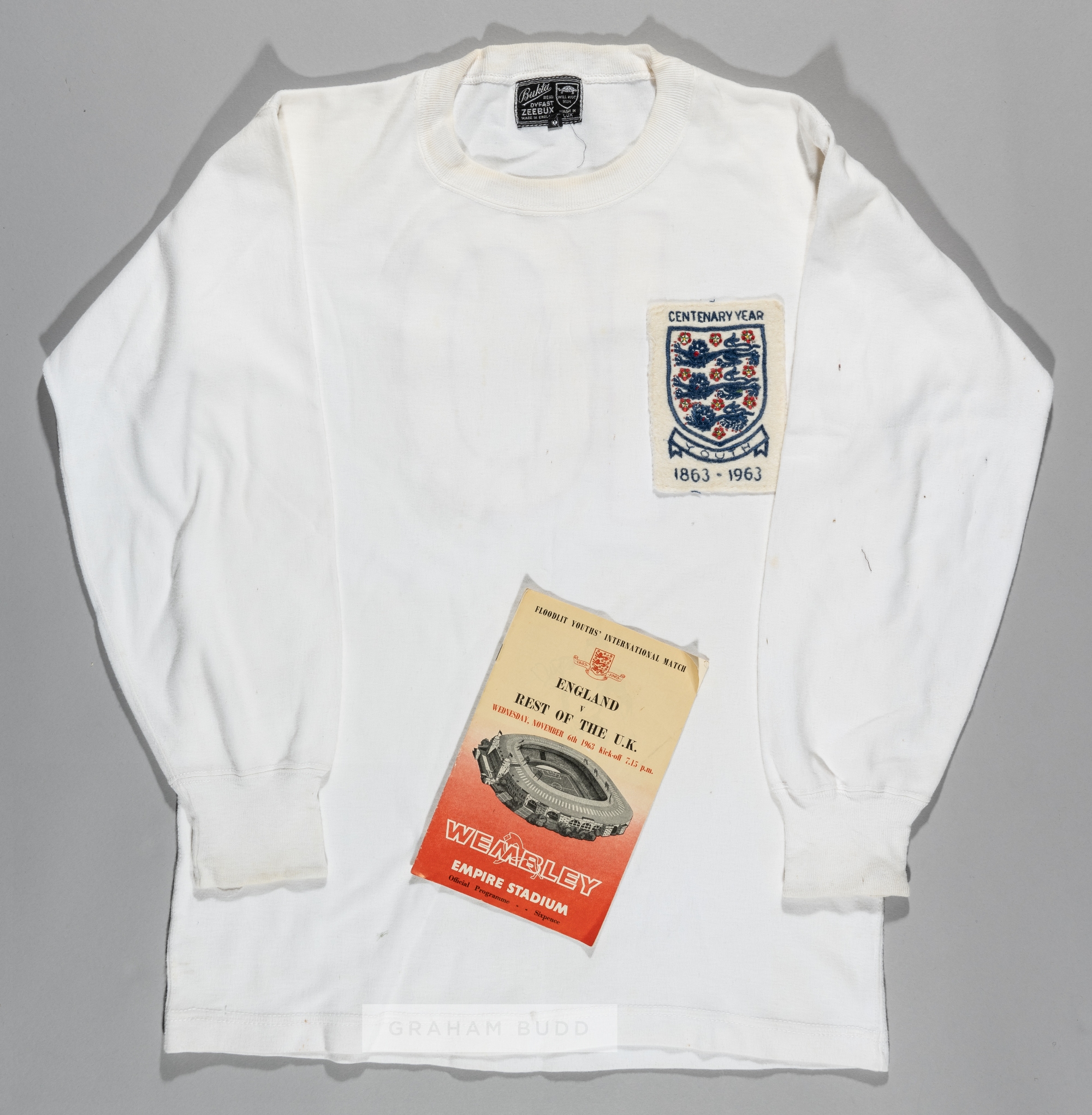 John Sissons white England Youth international No.10 jersey from the Football Association Centenary Match v Rest of the United Kingdom played at Wembley, 6th November 1963, Bukta, long-sleeved CENTENARY YEAR YOUTH 1863-1963 three lion emblem badge, reverse numbered 10; sold with the match programme and LOA, programme bears split in spine top to staple, (2) England won 5-2, with both John Sissons and George Graham on the scoresheet. Provenance: John Sissons swapped this jersey with Aston Villa and Scotland's George Graham after the match. The letter of authenticity details that the jersey and programme were purchased at a charity auction.