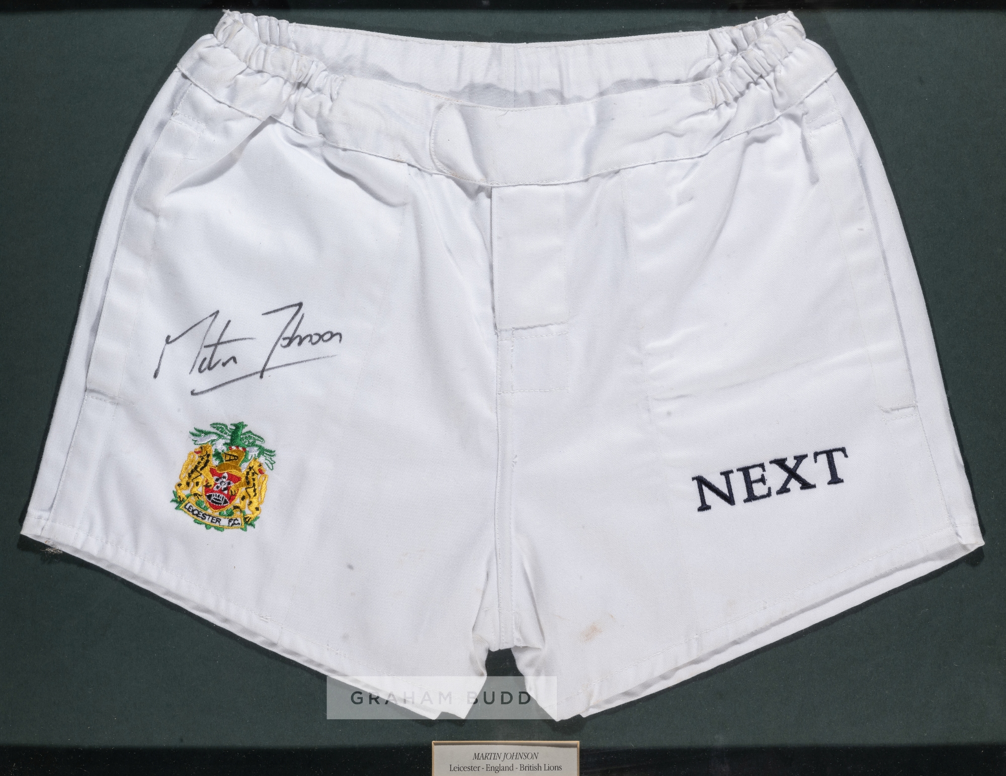 Martin Johnson signed Leicester Tigers white rugby shorts, the white shorts embroidered with Leicester Tigers crest and Next sponsor logo, signed in