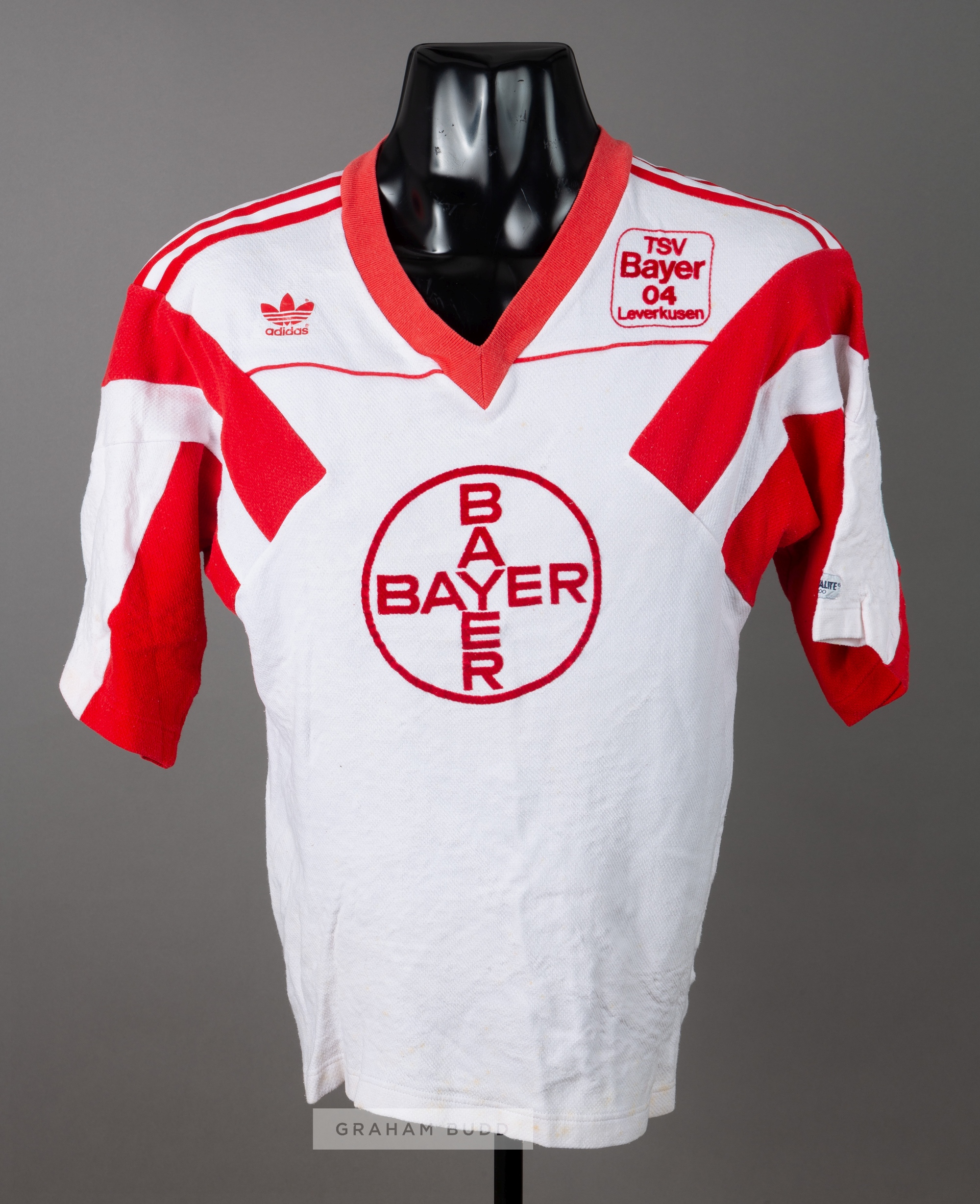 White and red TSV Bayer 04 Leverkusen Bundesliga no.19 jersey, season 1989-90, Adidas, short-sleeved with club crest and sponsor logo, reverse number