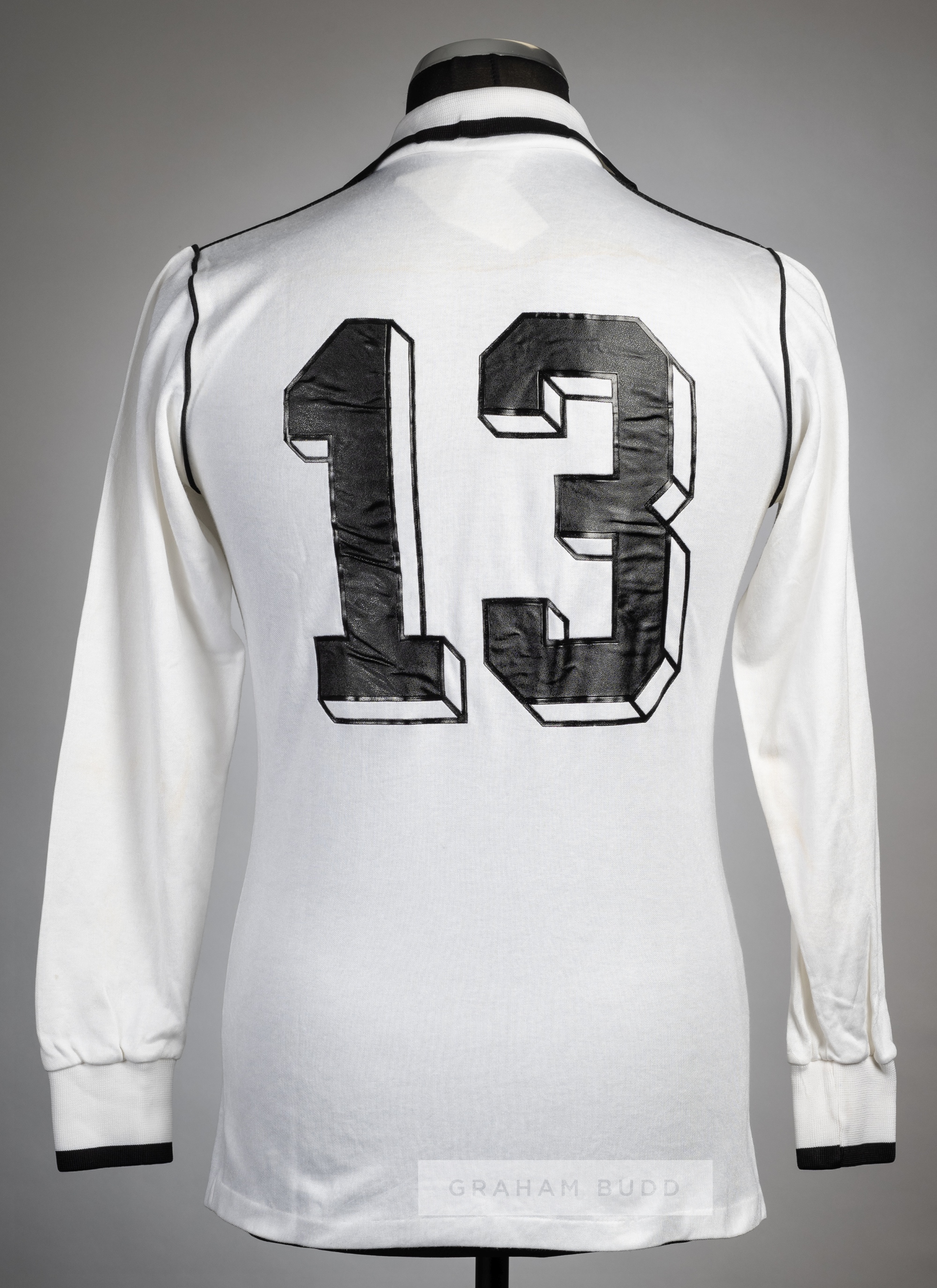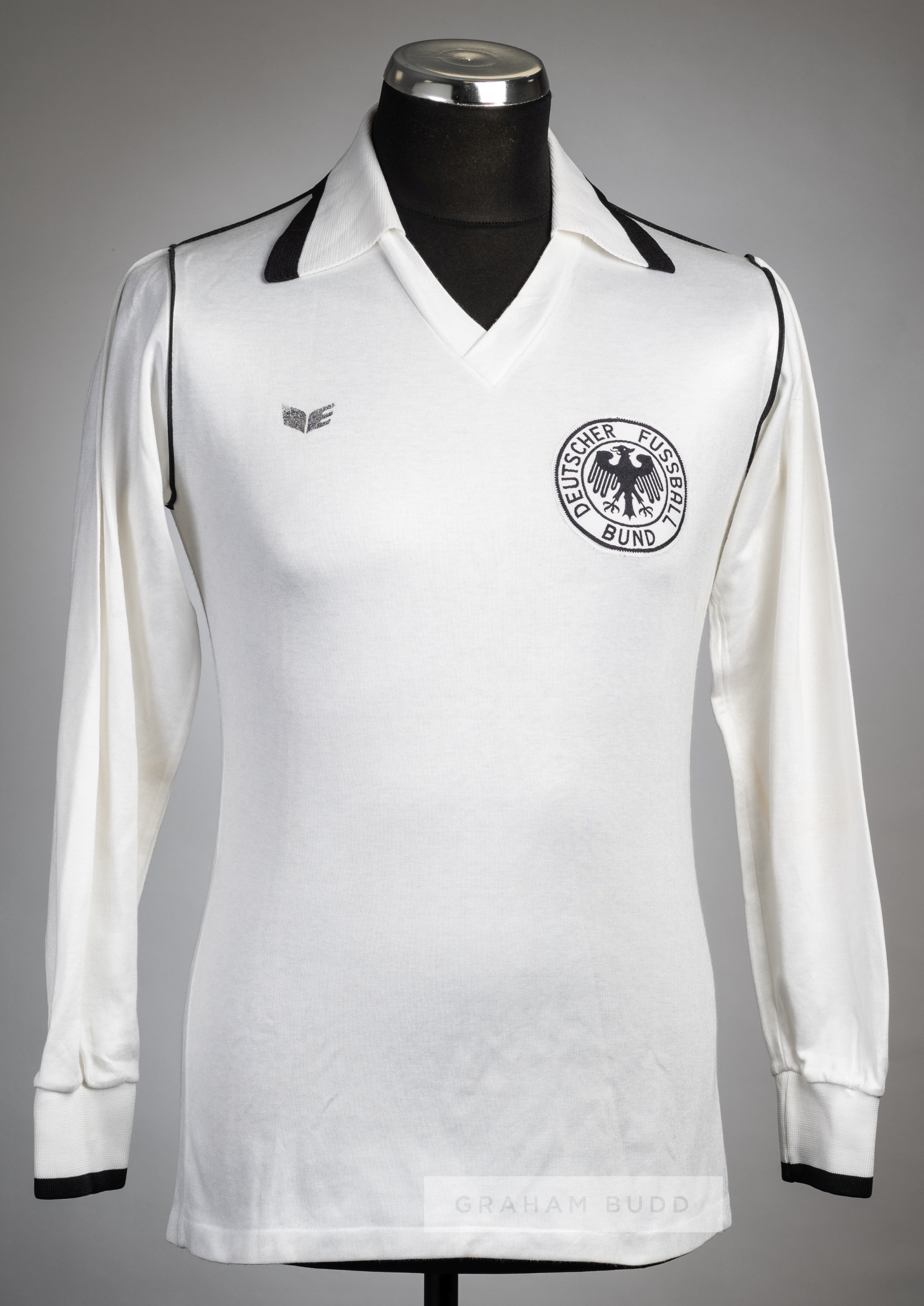 White & black West Germany U-21 international no.13 jersey, circa 1982, Erima, long-sleeved with country emblem badge and Erima logo, reverse numbered 13 This jersey has a hand written note attached to the neck label reading West Germany U-21 (no.13) v England U-21 at Bramall Lane 1982.
