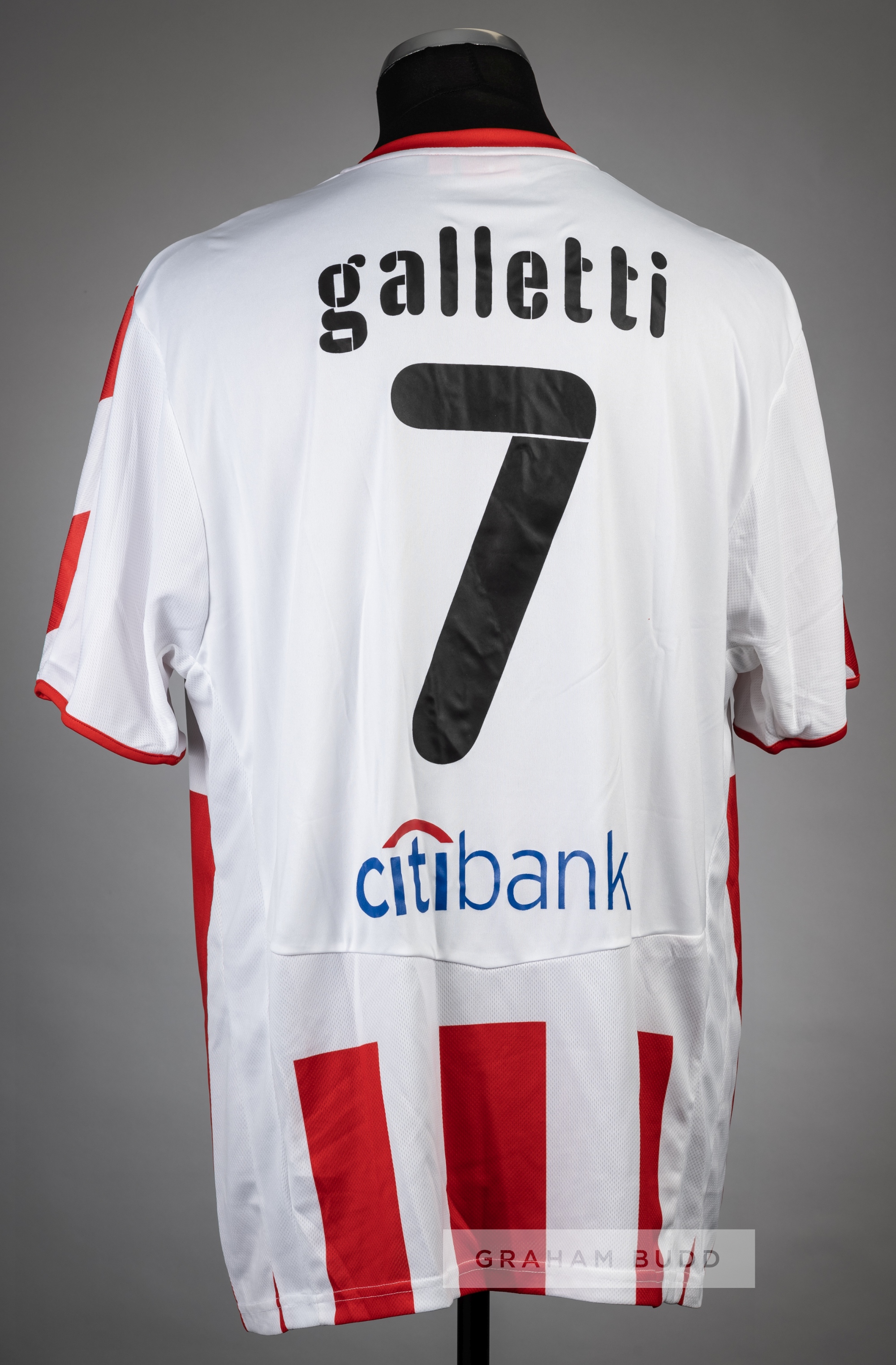 Luciano Galletti red and white Olympiacos FC no.7 home jersey, season 2008-09, Puma, short-sleeved with club crest badge, Puma and sponsor logo's, reverse lettered GALLETTI, sponsor logo lettering on the front is tacking and partial removed, mark obvious on main sponsor logo, handle with care Luciano Galletti played with Olympiacos FC during 2007-10, making 59 appearances scoring 19 goals.