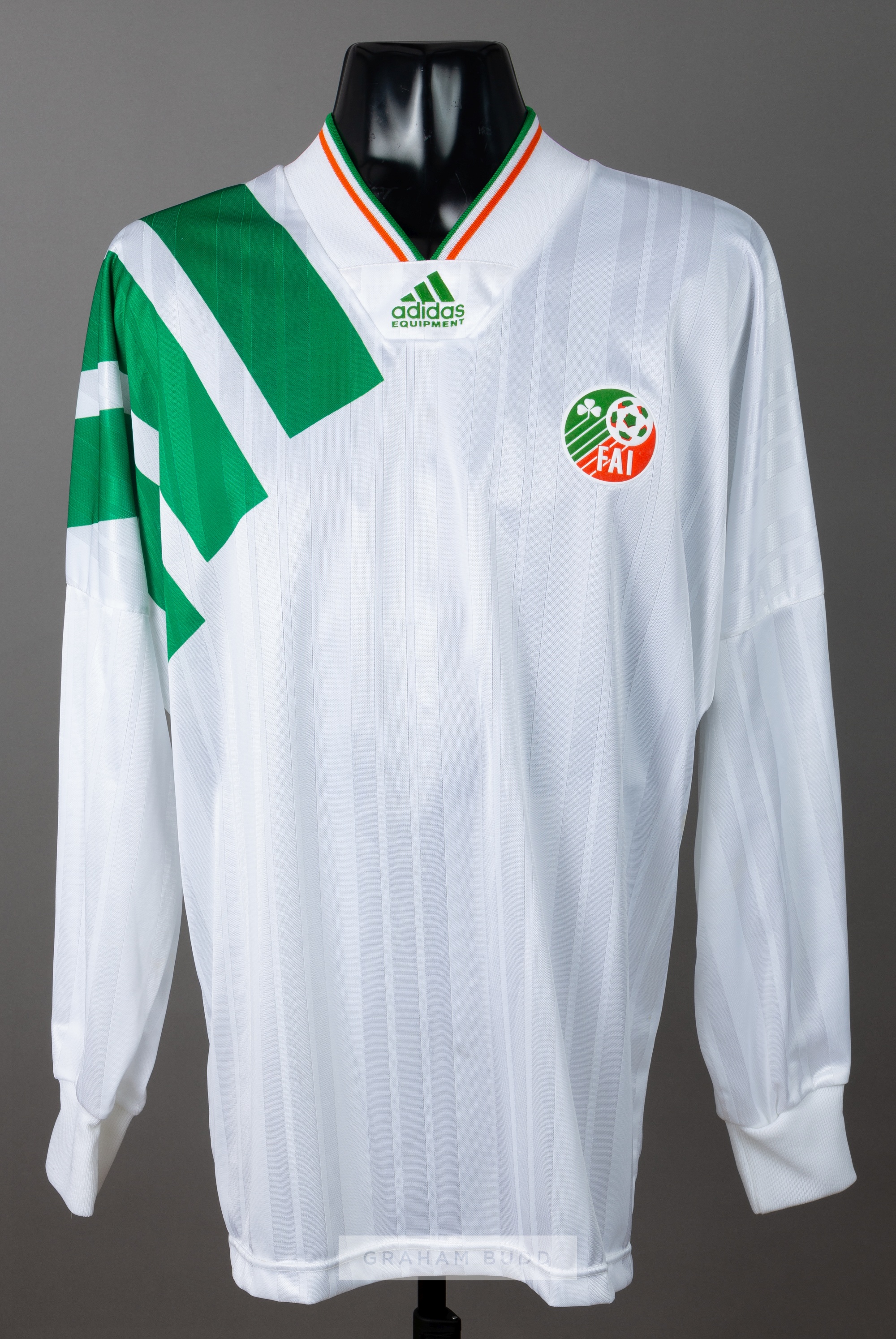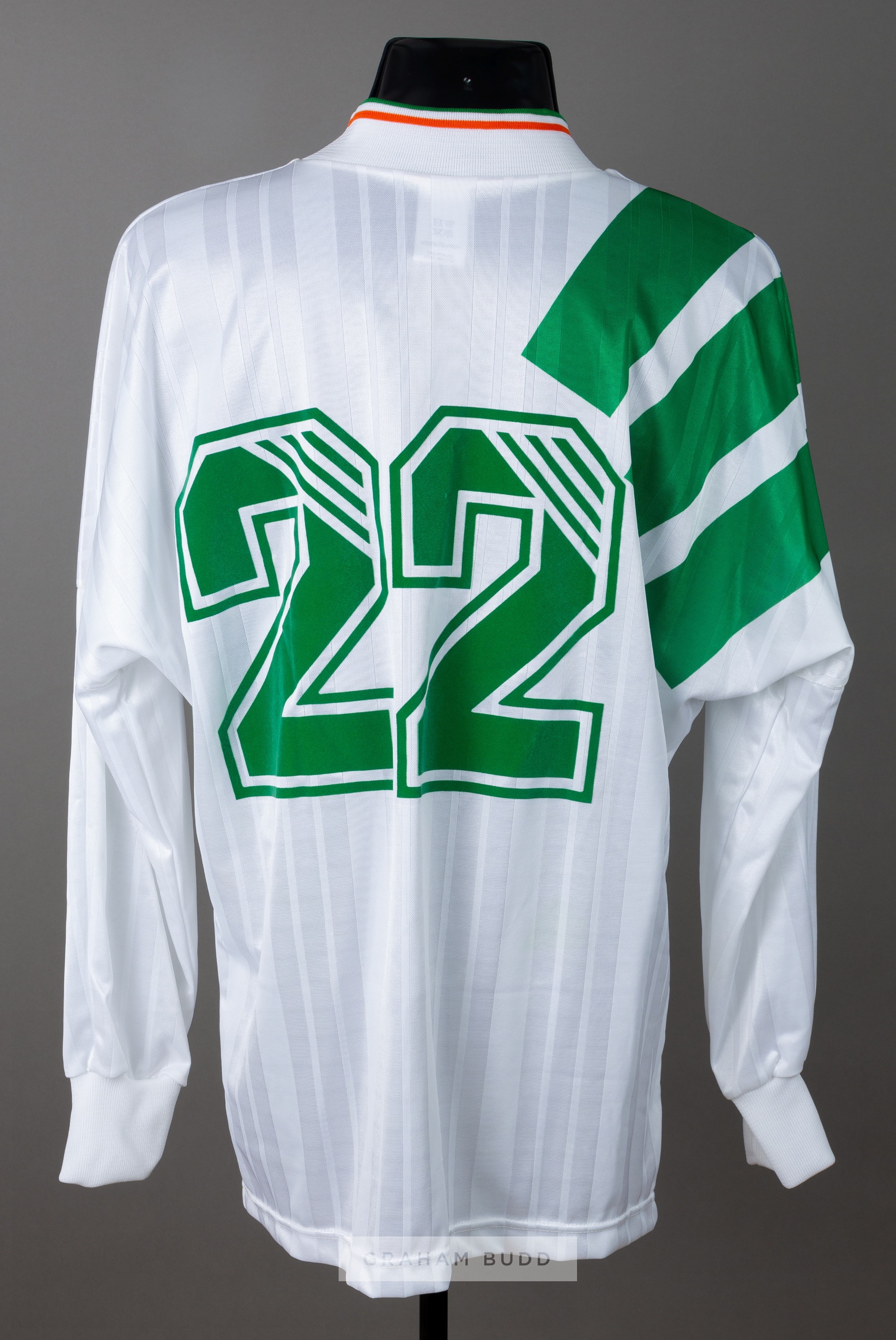 White Republic of Ireland No.22 change jersey, circa 1993, Adidas, long-sleeved with three green shoulder stripes, FAI country badge and sponsor logo