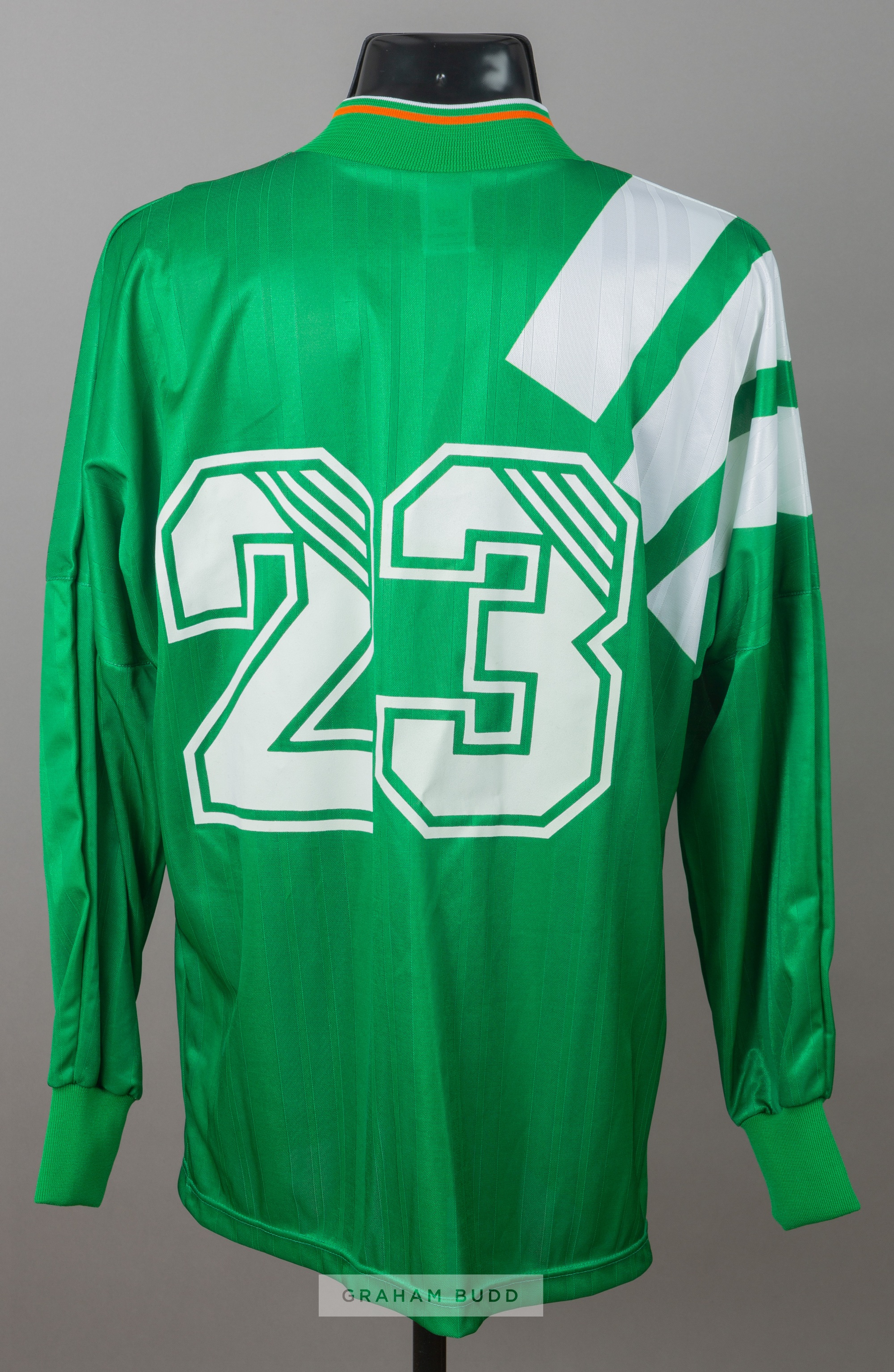 Green Republic of Ireland No.23 home jersey, circa 1993, Adidas, long-sleeved with three white shoulder stripes, FAI country badge and sponsor logo, reverse numbered 23