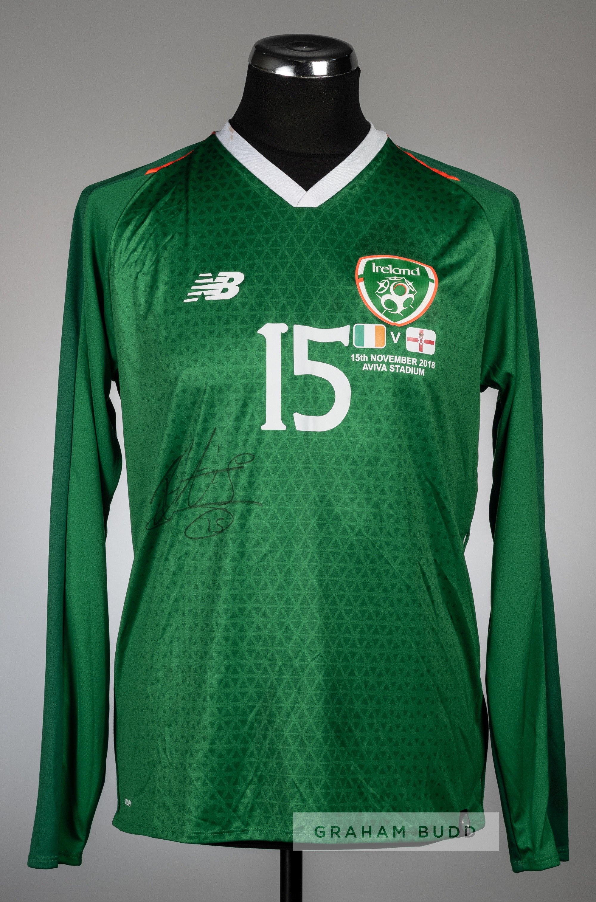 Ronan Curtis signed green Republic of Ireland no.15 jersey v Northern Ireland, Aviva Stadium, 15th November 2018, New Balance, long-sleeved with coun