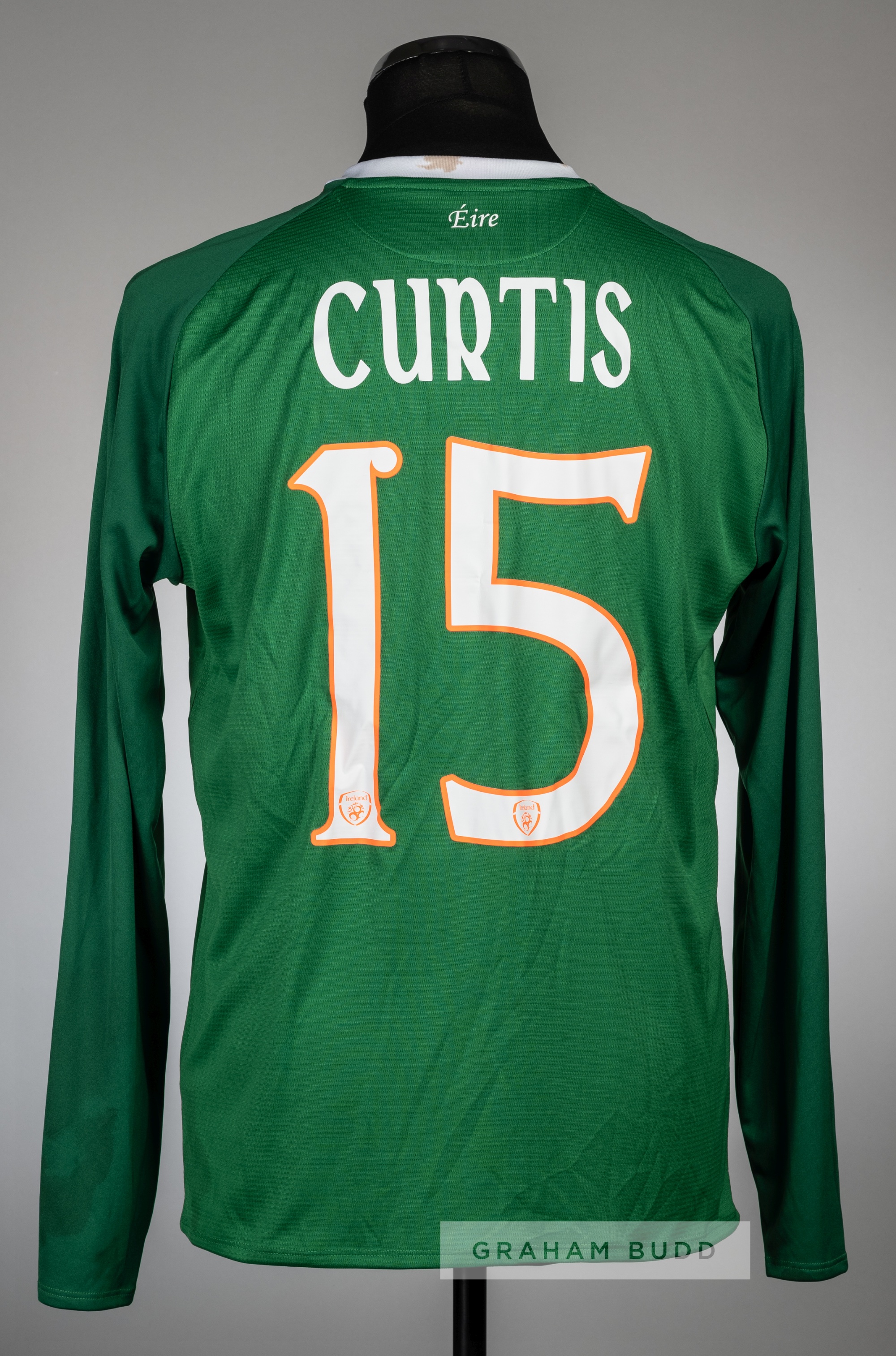 Ronan Curtis signed green Republic of Ireland no.15 jersey v Northern Ireland, Aviva Stadium, 15th November 2018, New Balance, long-sleeved with country emblem, sponsor logo and lettered 15TH NOVEMBER 2018 AVIVA STADIUM with country flags, reverse lettered CURTIS, signed on the front in black marker pen, bearing stains to white collar This fixture resulted in a 0-0 draw, Ronan Curtis worn a short-sleeved jersey in this fixture. Ronan Curtis has played for the Republic of Ireland since 2018 making seven appearances, having played with the U-21 during 2017-18 making 18 appearances scoring one goal. Currently playing with Portsmouth FC since 2018 making 140 appearances scoring 35 goals.