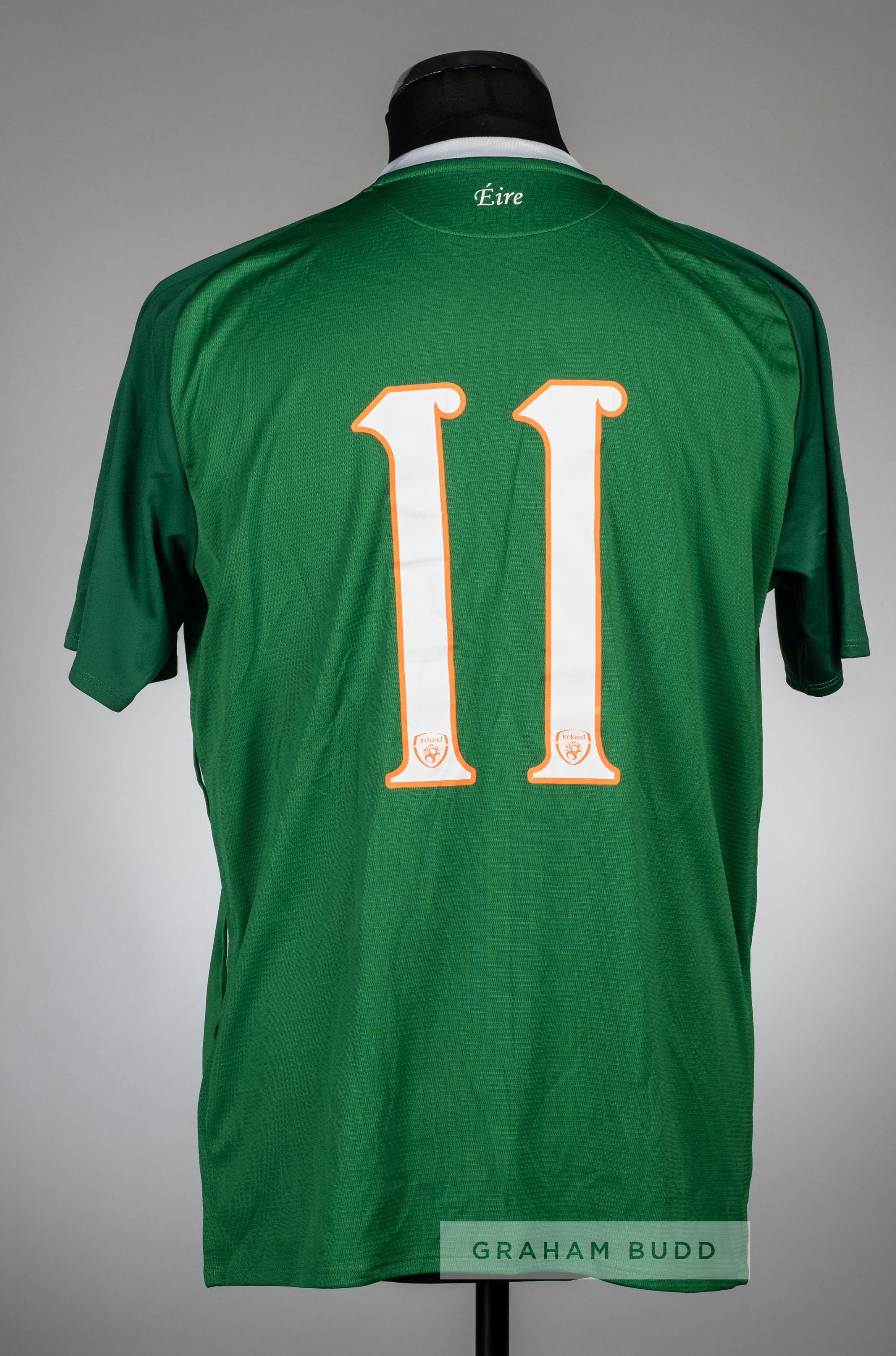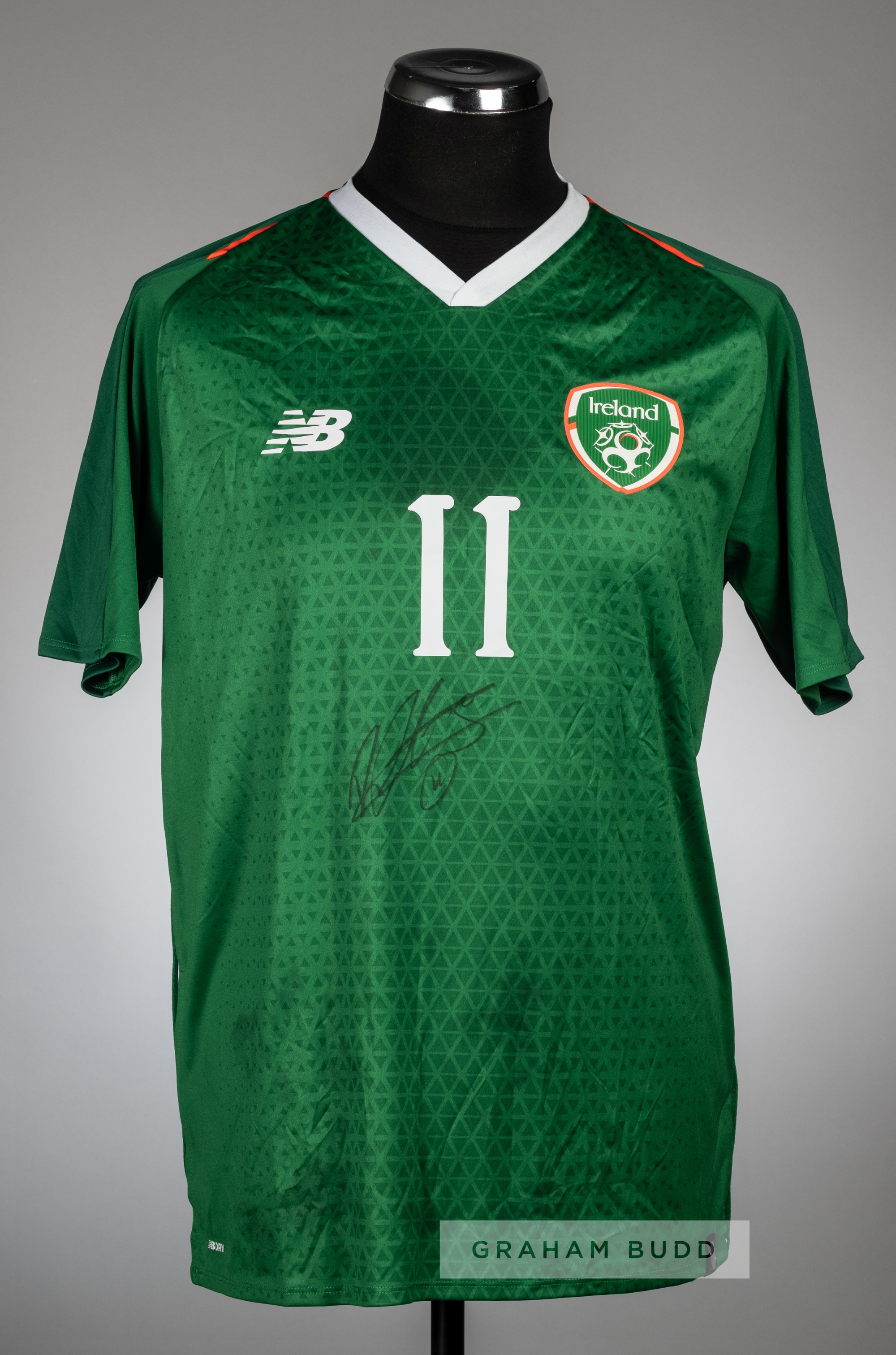 Ronan Curtis signed green Republic of Ireland no.11 home jersey, circa 2018, New Balance, short-sleeved with country emblem, sponsor logo, reverse nu