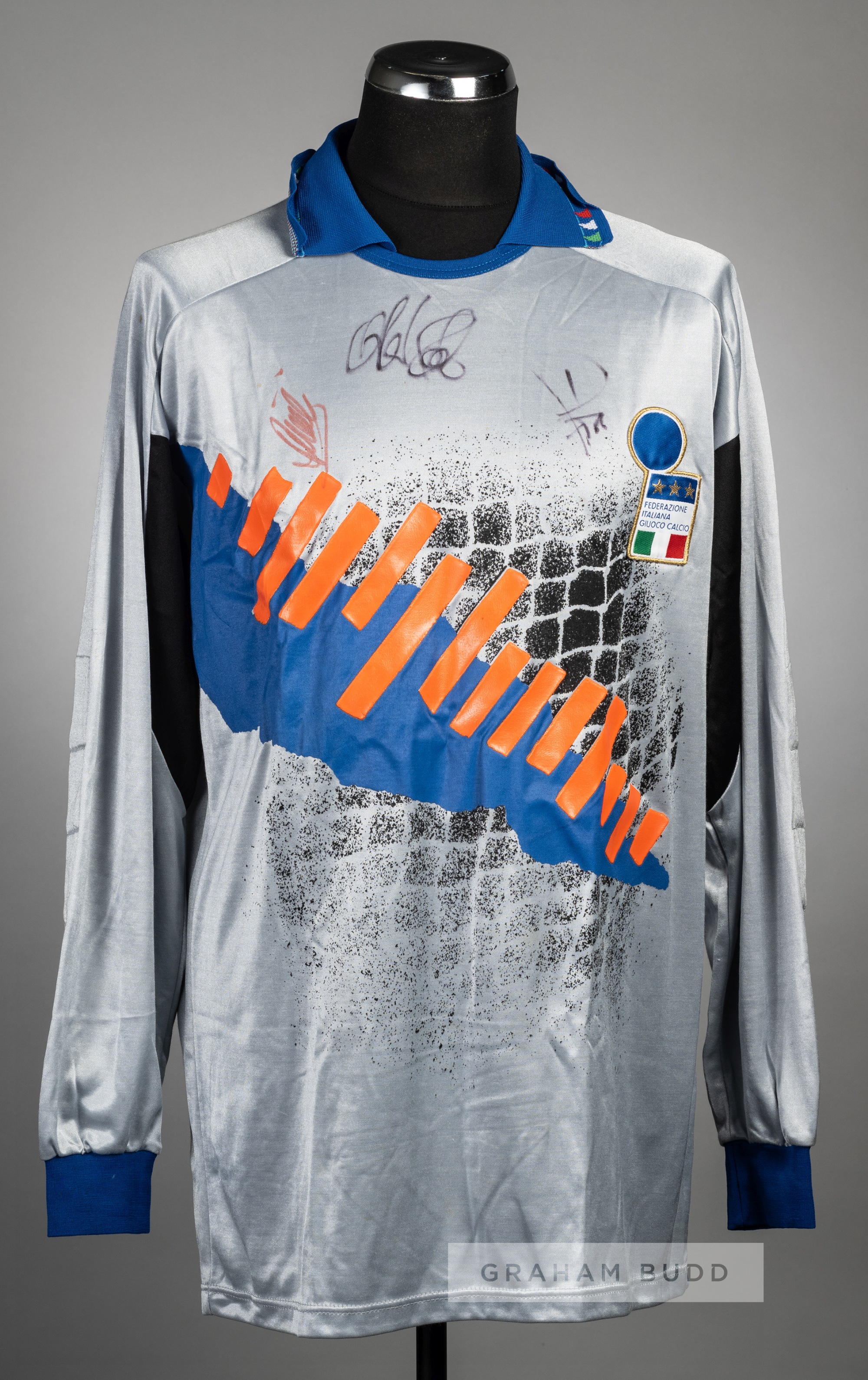 Grey and blue Italy no.12 goalkeeper's jersey, circa 1990s, long-sleeved with country emblem badge and sponsor logo, reverse numbered 12, the front bears three signatures in black and red marker pen