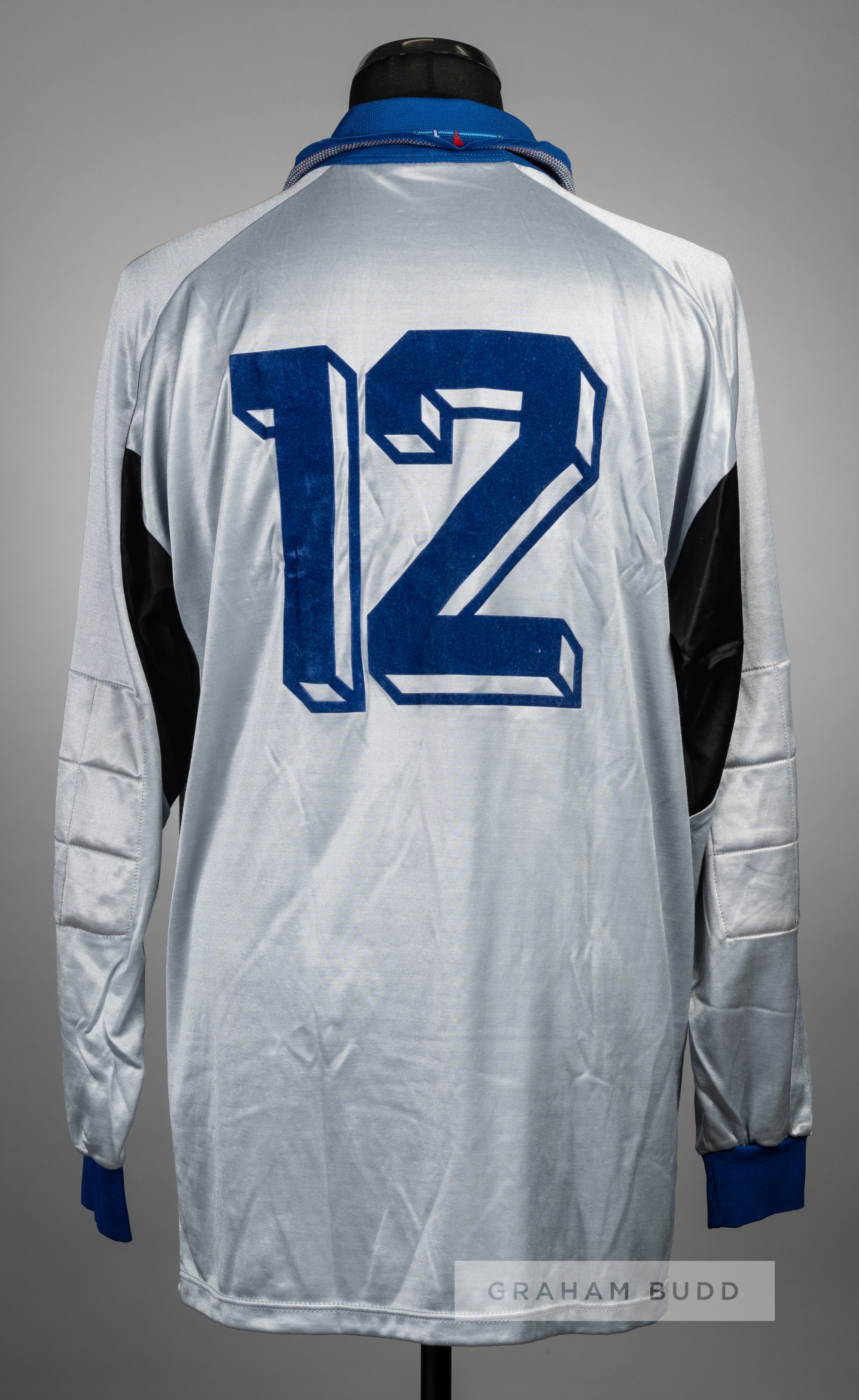 Grey and blue Italy no.12 goalkeeper's jersey, circa 1990s, long-sleeved with country emblem badge and sponsor logo, reverse numbered 12, the front b
