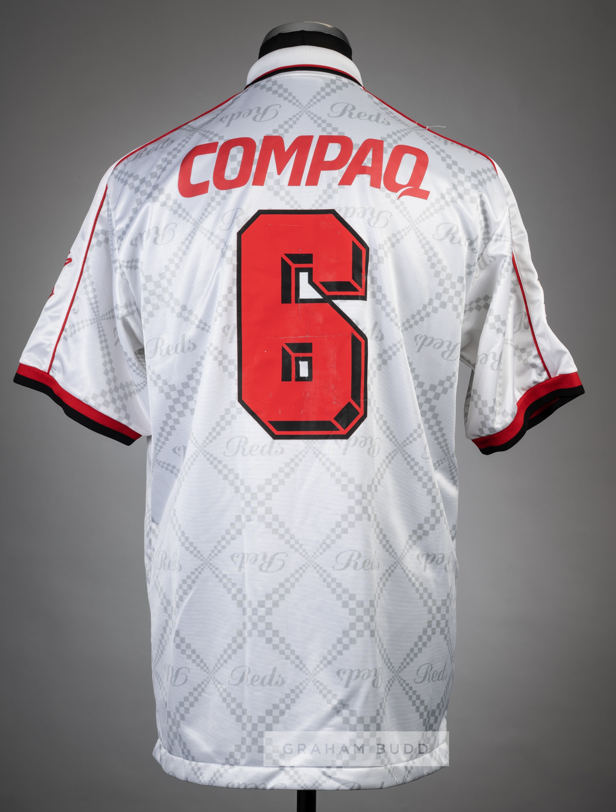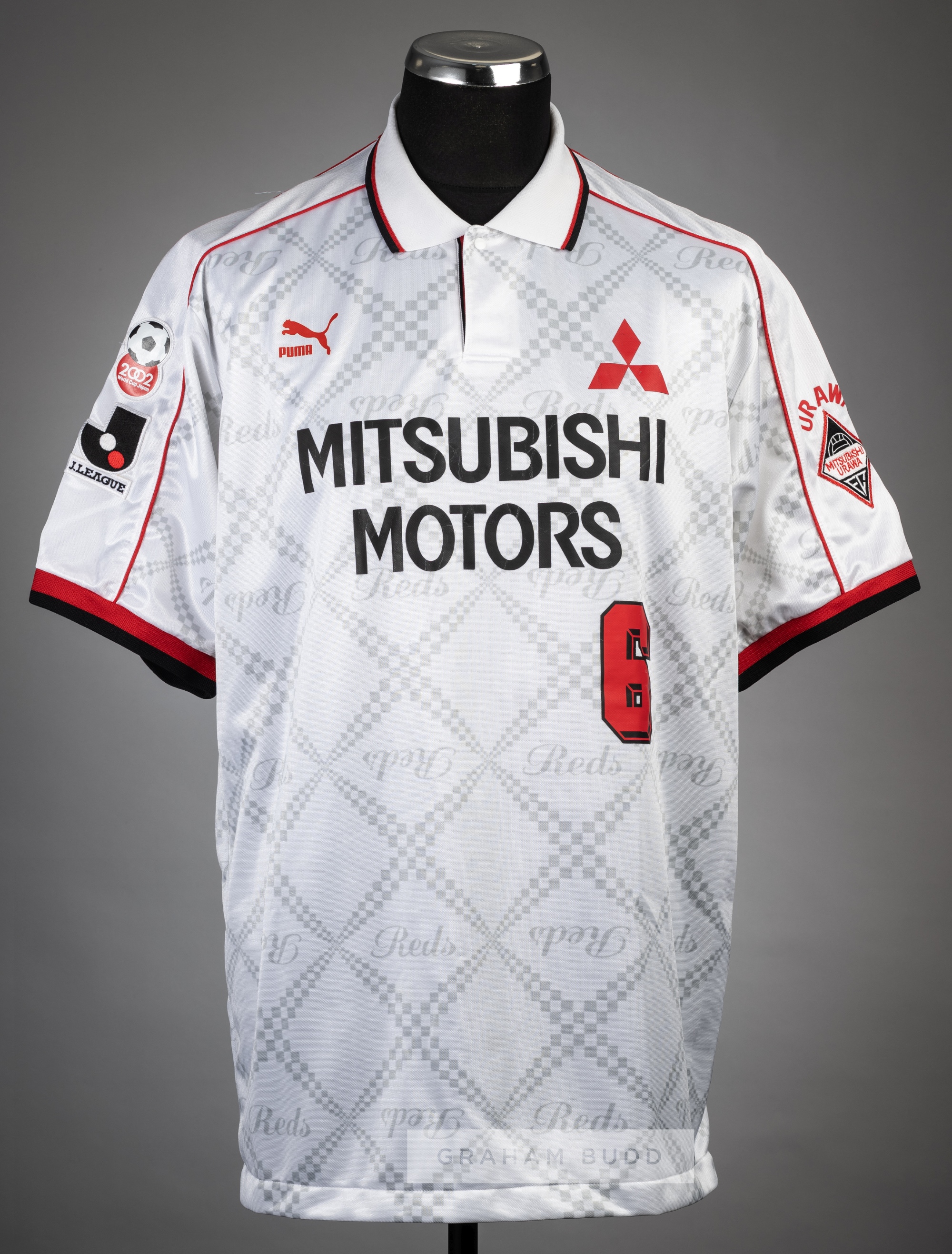 White Urawa Red Diamonds no.6 away jersey v Manchester United, pre-season friendly 22nd July 1997, Puma, short-sleeved with 2002 WORLD CUP JAPAN, J.LEAGUE and MITSUBISHI URAWA sleeve badges, Puma and sponsor logo's, reverse numbered 6