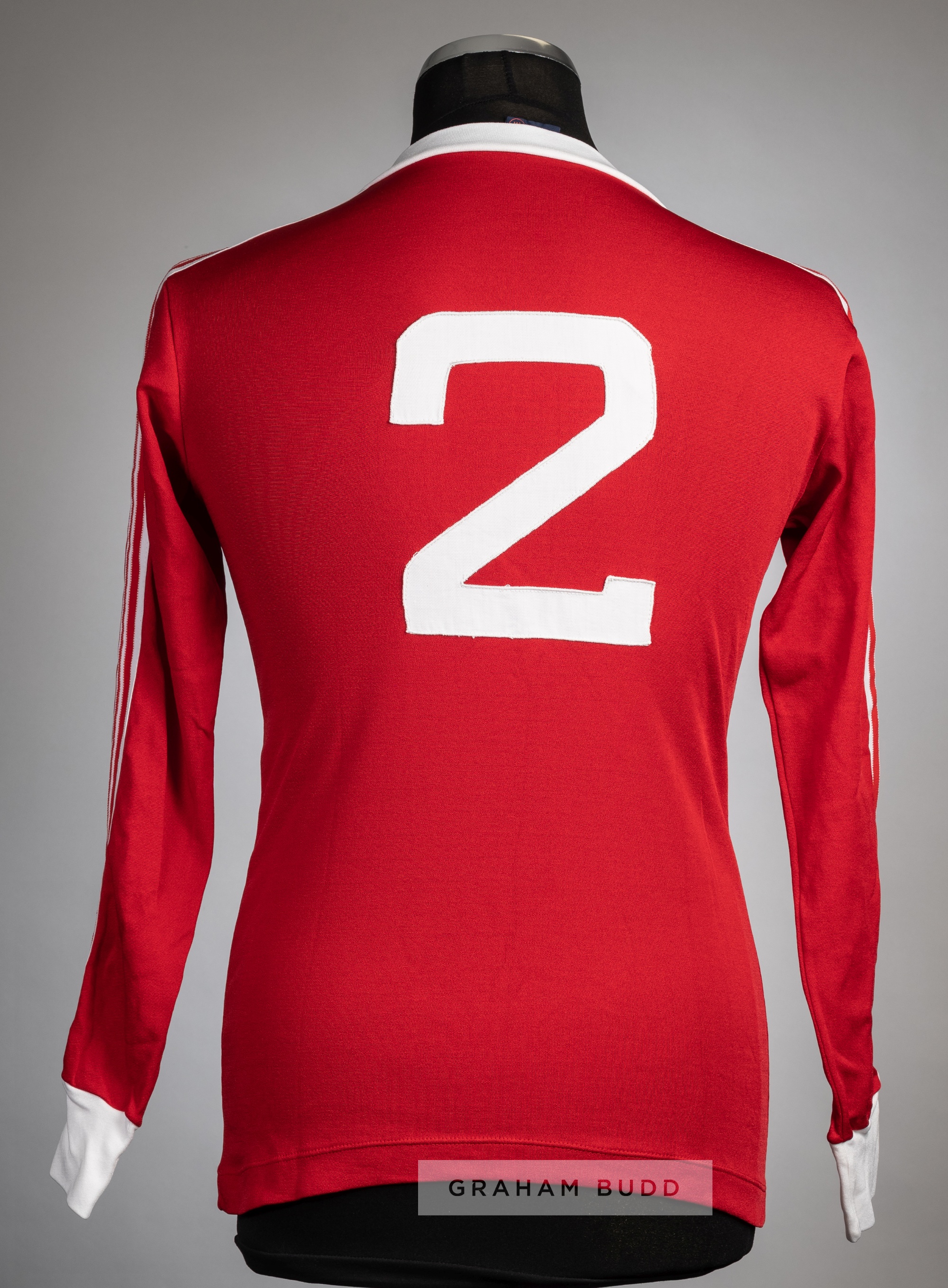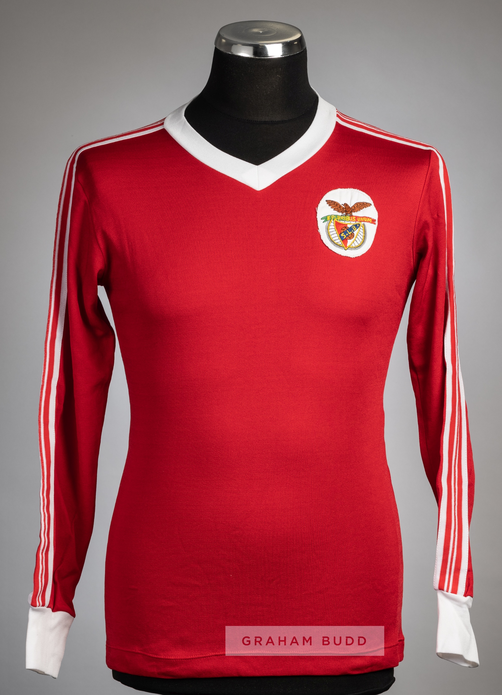 Red and white SL Benfica No.2 jersey, circa 1980, Friolax, long-sleeved with embroidered club crest badge, reverse numbered 2