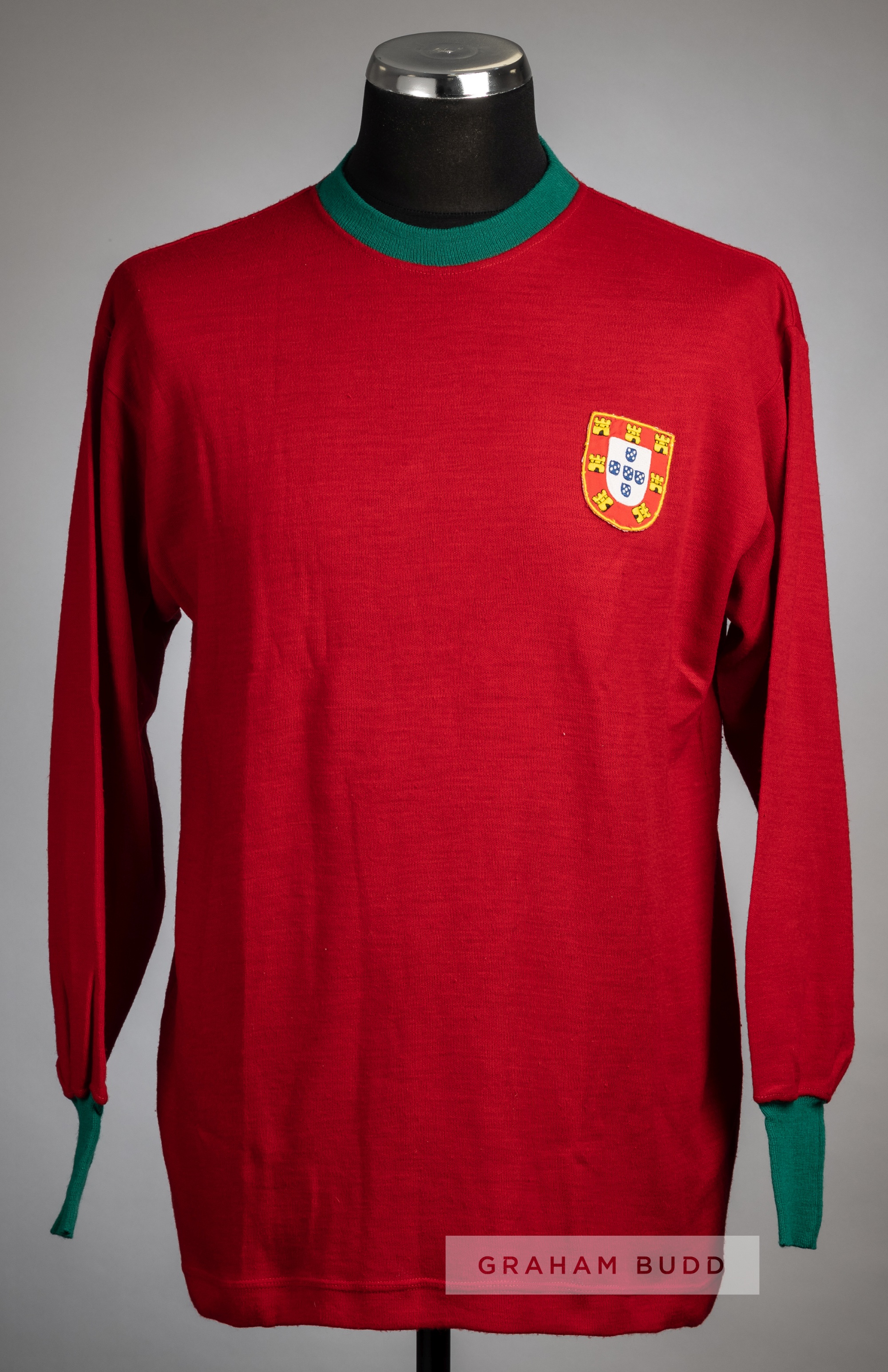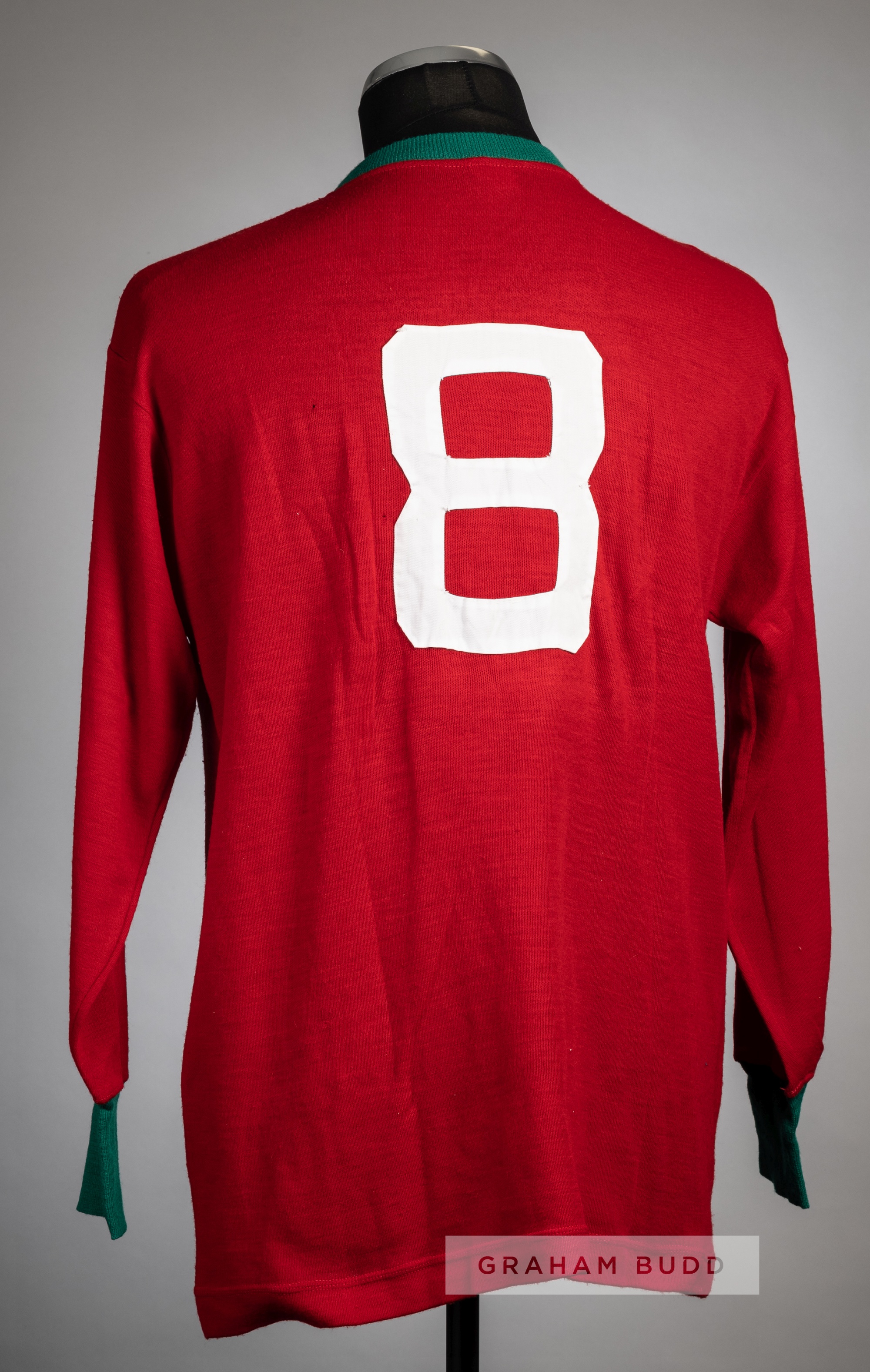 Red Portugal no.8 jersey, circa late 1960s, Marlec, long-sleeved with green collar and cuffs, embroidered country emblem badge, reverse numbered 8