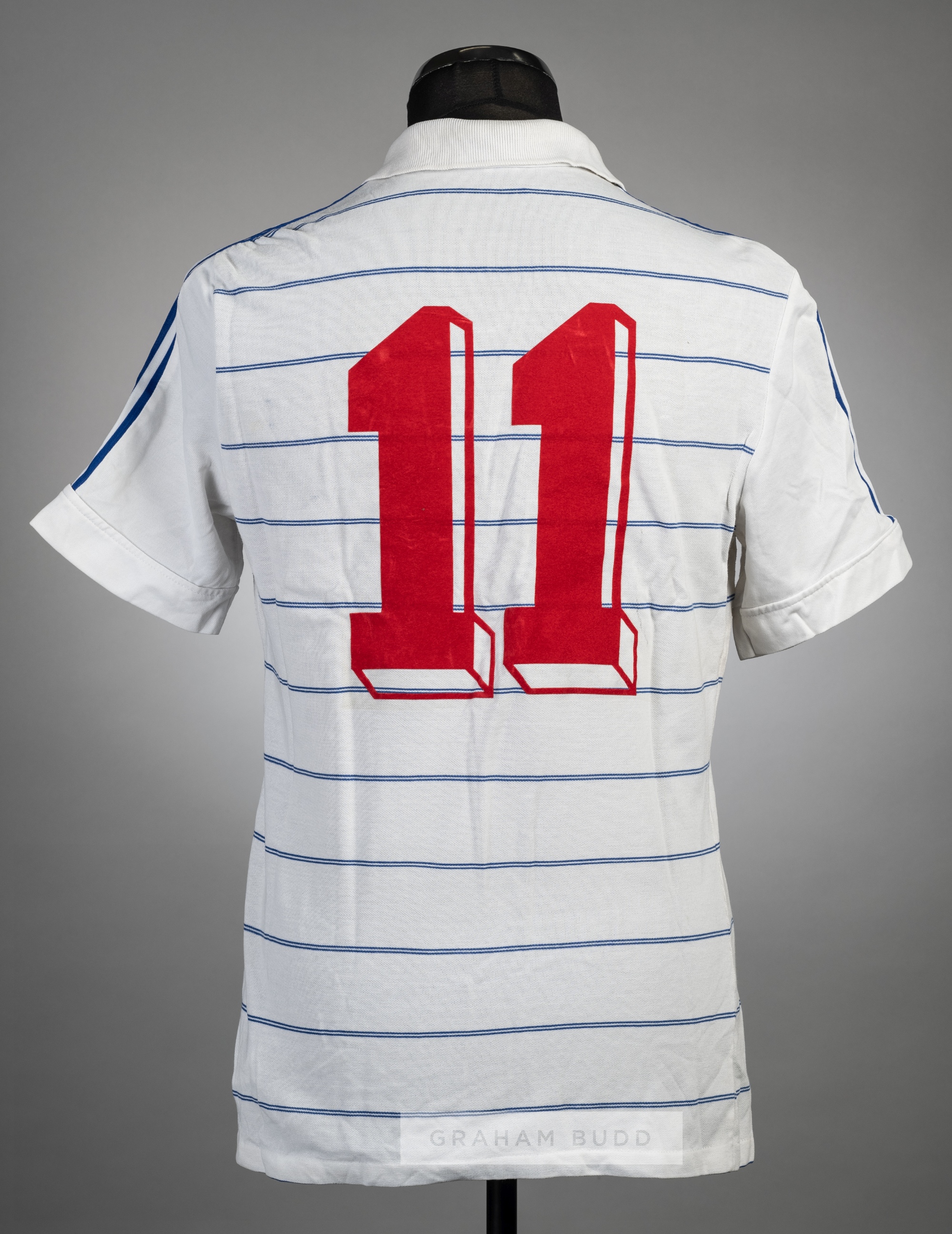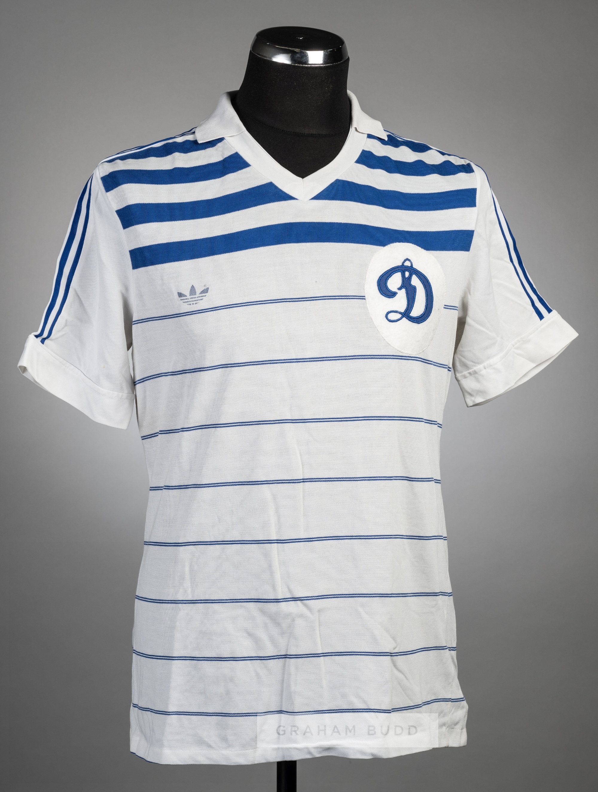 Oleh Blokhin white with blue stripes Dynamo Kyiv no.11 jersey, season 1982-85, Adidas, short-sleeved with embroidered felt badge, sponsor logo, rever
