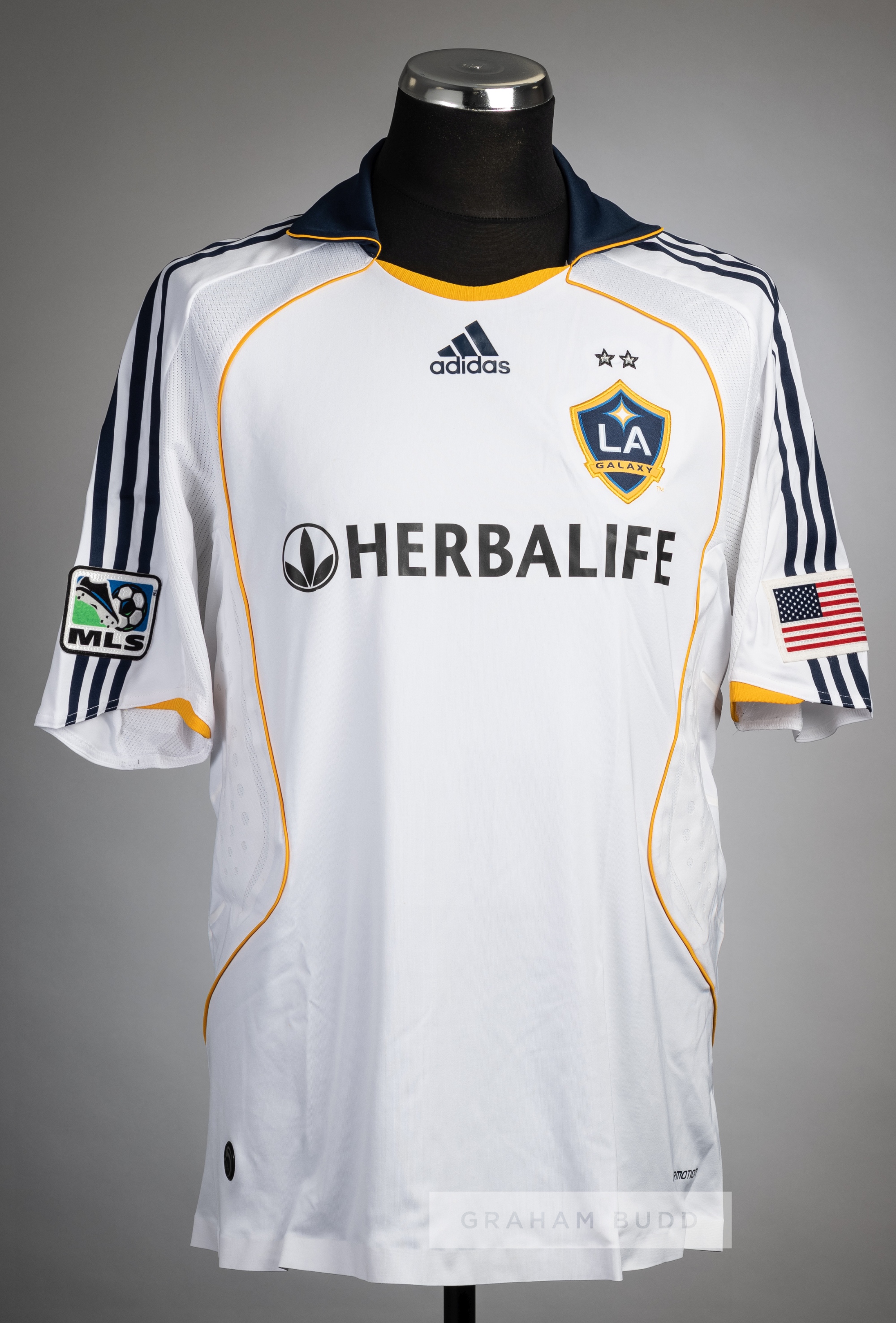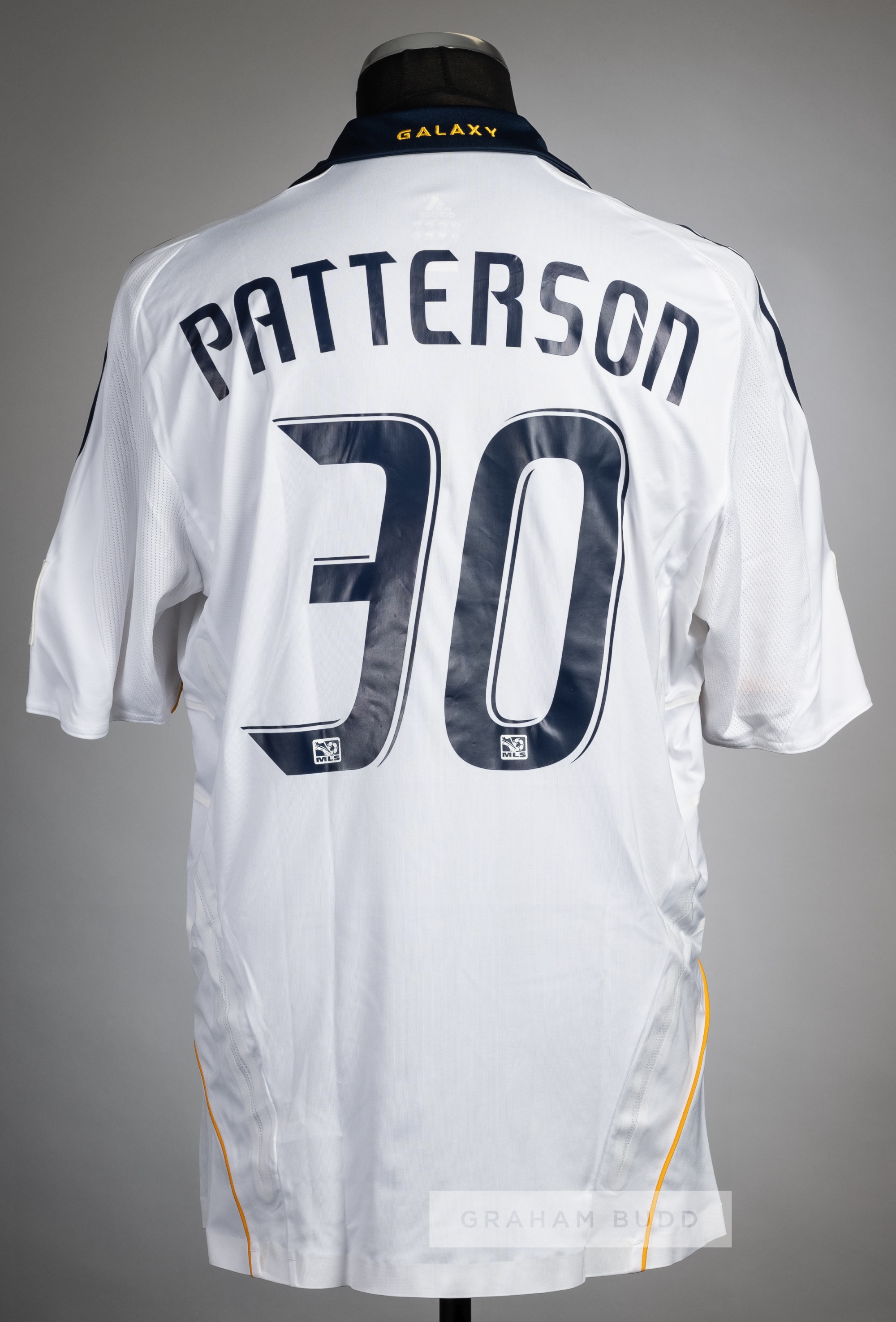 Kyle Patterson white LA Galaxy No.30 home jersey v FC Barcelona at Rose Bowl, 2nd August 2009, Adidas, short-sleeved with America flag and MLS sleeve badges, club crest badge, Adidas and sponsor logo's, reverse lettered PATTERSON, front sponsor logo lettering tacky, handle with care FC Barcelona defeated LA Galaxy 2-1, with David Beckham scoring a free kick in this match. Kyle Patterson played with LA Galaxy during 2009 making three appearances.