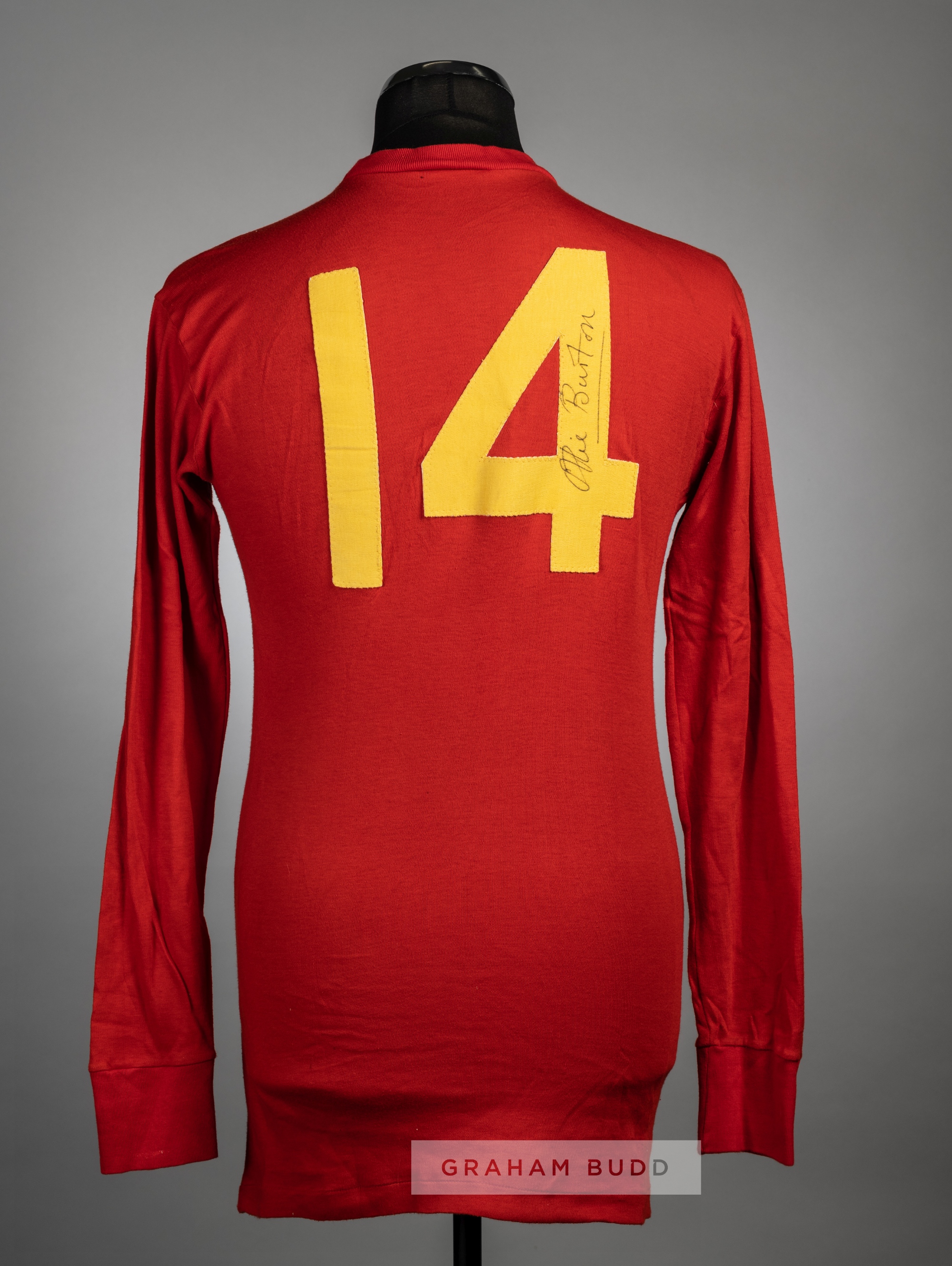 Ollie Burton signed red Wales No.14 home jersey, circa 1970s, long-sleeved, reverse numbered 14, signed in black marker pen Alwyn Derek Burton (b.1941), is a former Welsh international footballer, who is a member of the Norwich City FC Hall of Fame. He played for Wales from 1962 to 1972, making nine appearances.