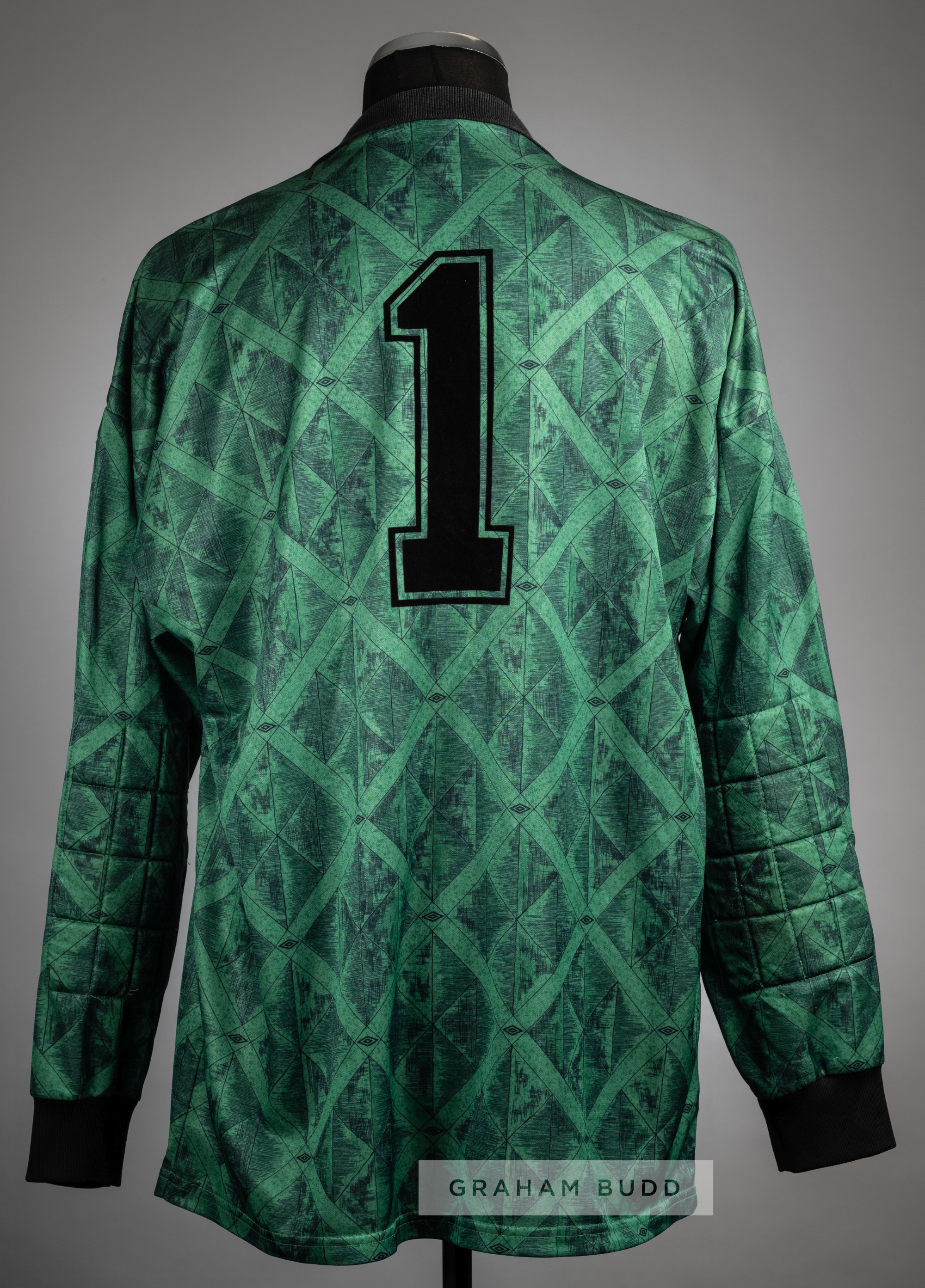Green Wales international No.1 goalkeeper's jersey, circa 1992, Umbro, long-sleeved with embroidered national emblem, reverse numbered 1