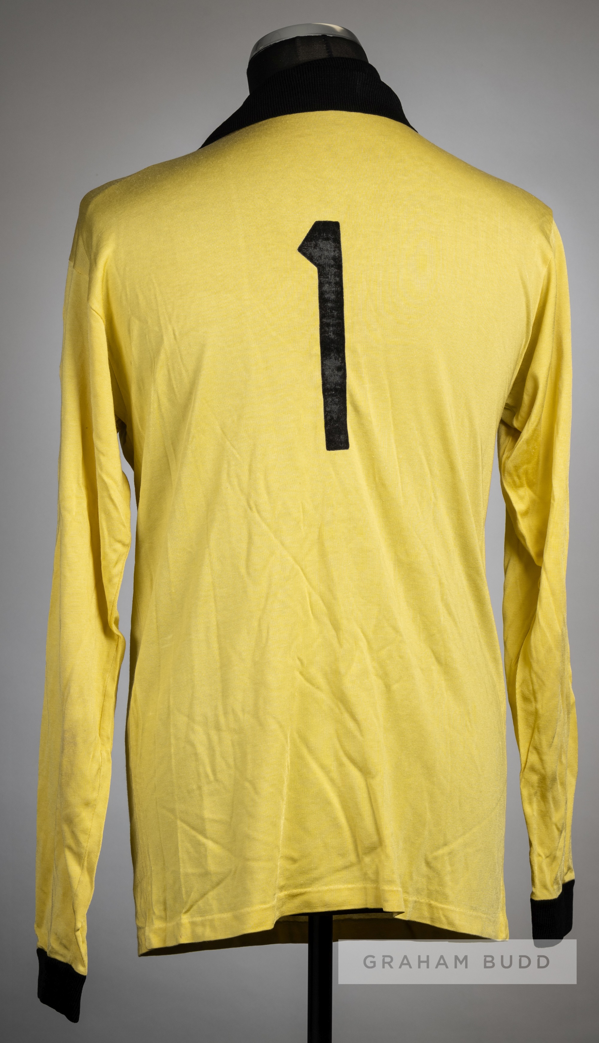 Yellow & black Yugoslavia no.1 goalkeeper's jersey, Le Coq Sportif, long-sleeved, with embroidered national emblem, reverse numbered 1 The neck label bearing a pen inscription reading Yugo. U-21, Eng. 77-8.