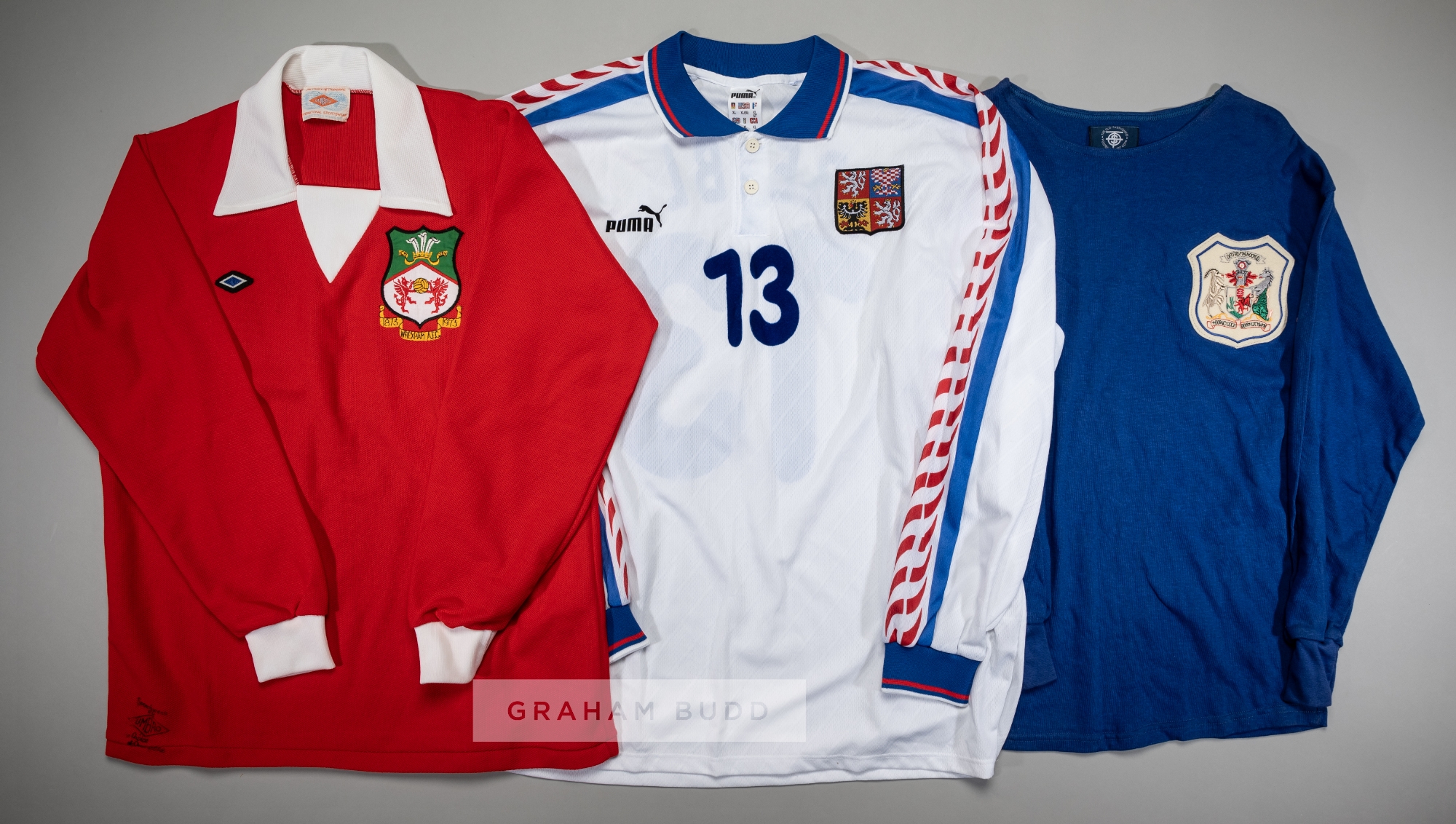 A collection of 12 replica jerseys, comprising blue Jens Jonbloed 1974 World Cup Netherlands no.8 goalkeeping jersey; a white Radek Bejbl Czech Republic Euro '96 no.13 jersey; a white Denmark no.4 international jersey by Hummel with typical red and white chevron details; two Juventus replica's the first a multi patterned 1990s goalkeeping issue, the other a black and white striped no.6 home jersey by Erima circa 1970s; a blue Toffs Cardiff City 1927 FA Cup final retro jersey; a yellow and black striped Crystal Palace 1990 FA Cup final replay no.6 jersey; a blue Everton 1995 FA Cup final no.3 replica jersey; a multi patterned Tim Flowers no.1 goalkeeping jersey commemorating Blackburn Rovers 1994-95 Premier League winning season; a blue Shrewsbury Town unnumbered commemorative jersey for the 1996 Auto-Windscreens Shield final at Wembley Stadium; a red Wrexham no.8 jersey with club badge inscribed 1873-1973; a Lee Ashcroft light and dark blue hooped Grimsby Town replica no.9 jersey, (12)
