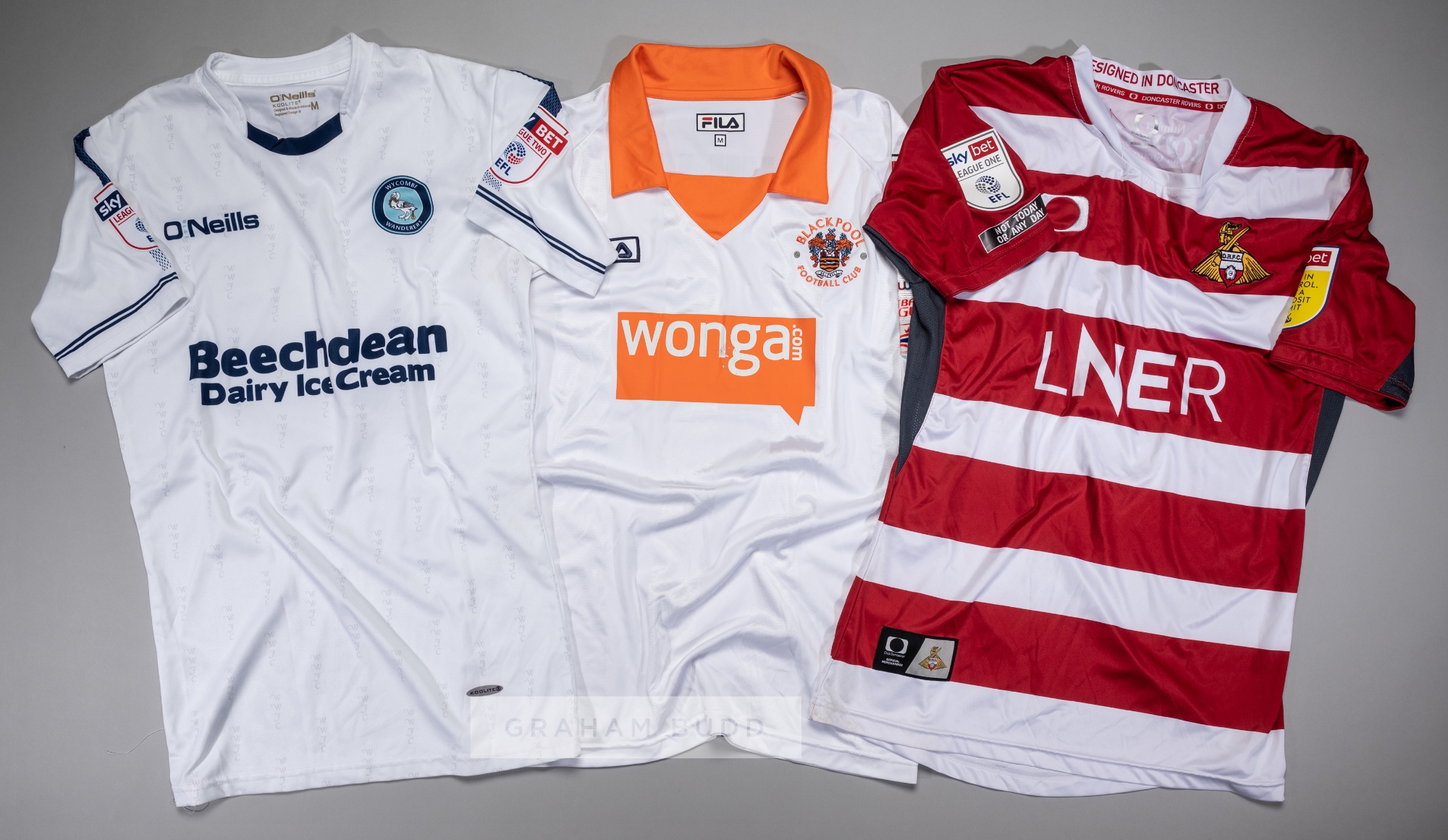 Three EFL players' jerseys, comprising Paris Cowan-Hall signed white Wycombe Wanderers no.12 third choice jersey, season 2017-18, short-sleeved with SKYBET LEAGUE TWO EFL sleeve badges, club crest and sponsor logo, reverse lettered COWAN-HALL, signed in black marker pen to reverse; Kevin Phillips white and orange Blackpool no.9 away jersey, season 2011-12, short-sleeved with NPOWER FOOTBALL LEAGUE sleeve badges, club crest and sponsor logo, reverse lettered K PHILLIPS and Omar Bogle Doncaster Rovers no.7 home jersey, season 2020-21, short-sleeved with SKYBET STAY IN CONTROL. SET A DEPOSIT LIMIT sleeve badges, club crest and sponsor logo, reverse lettered BOGLE, (3)