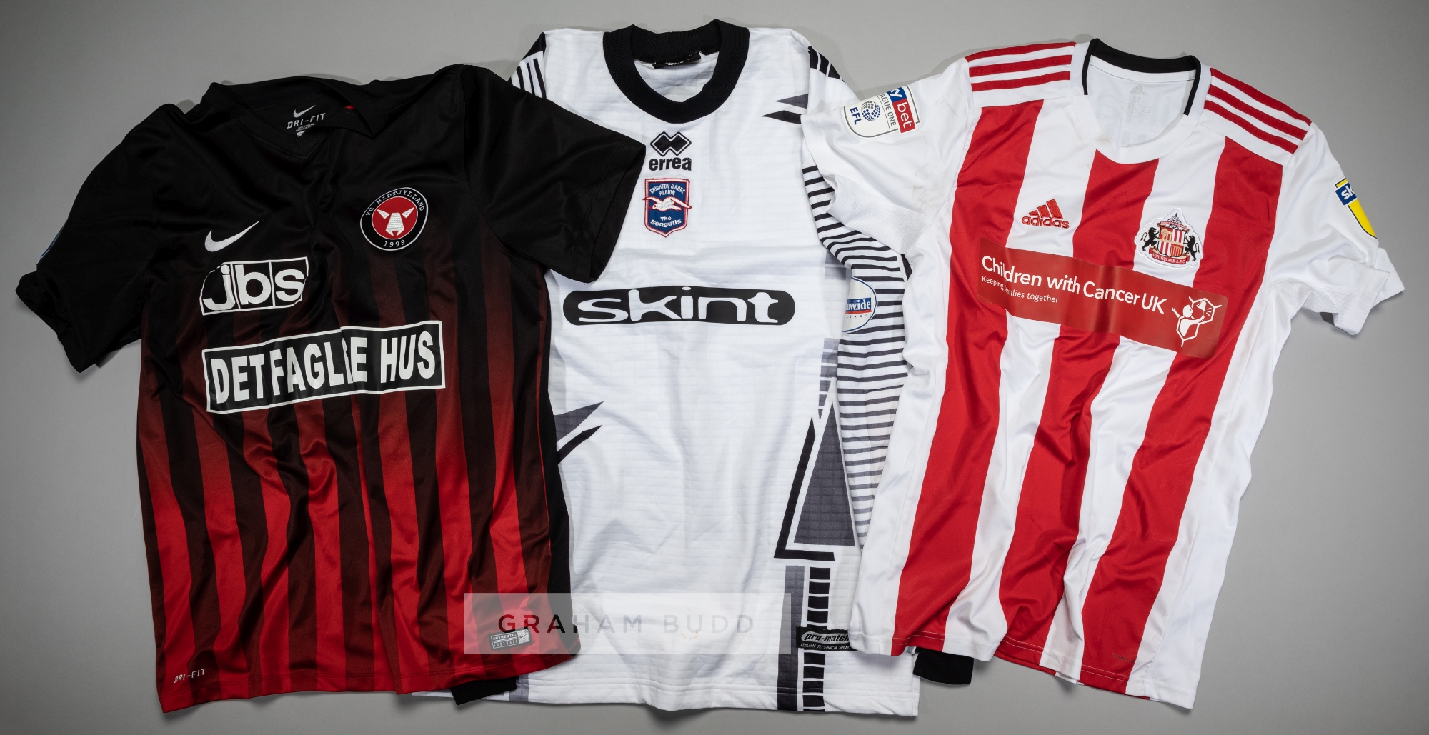 Three players' jerseys, comprising John Keeley signed white and black Brighton & Hove Albion no.29 goalkeeper's jersey circa 2001, long-sleeved with NATIONWIDE FOOTBALL LEAGUE sleeve badges, embroidered club crest and sponsor logo, reverse lettered KEELEY, signed in black marker pen to reverse; Marc McNulty white Sunderland AFC no.10 home jersey, season 2019-20, short-sleeved with SKYBET LEAGUE ONE EFL sleeve badges, club crest and sponsor logo, reverse lettered MCNULTY and Rasmus Nicolaisen signed black FC Midtjylland no.20 jersey, season 2017-18, short-sleeved with ALKA SUPERLIGA sleeve badge, club crest and sponsor logo, reverse lettered NICOLAISEN, signed on number two in black marker pen, (3)
