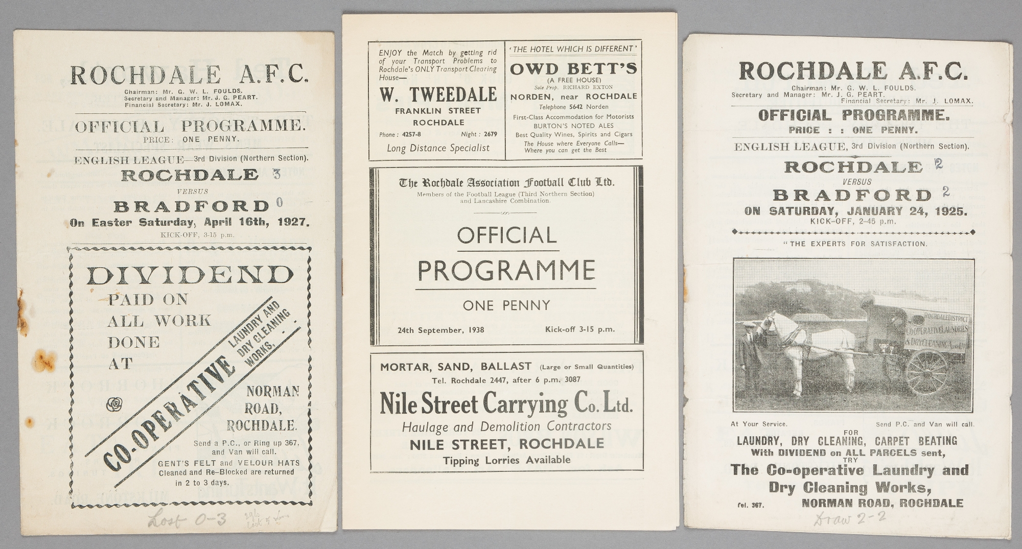 Three Rochdale home programmes, F.L. Division Three fixtures, two v Bradford Park Avenue 24th January 1925 and 16th April 1927, and v Gateshead 24th September 1938, (3)
