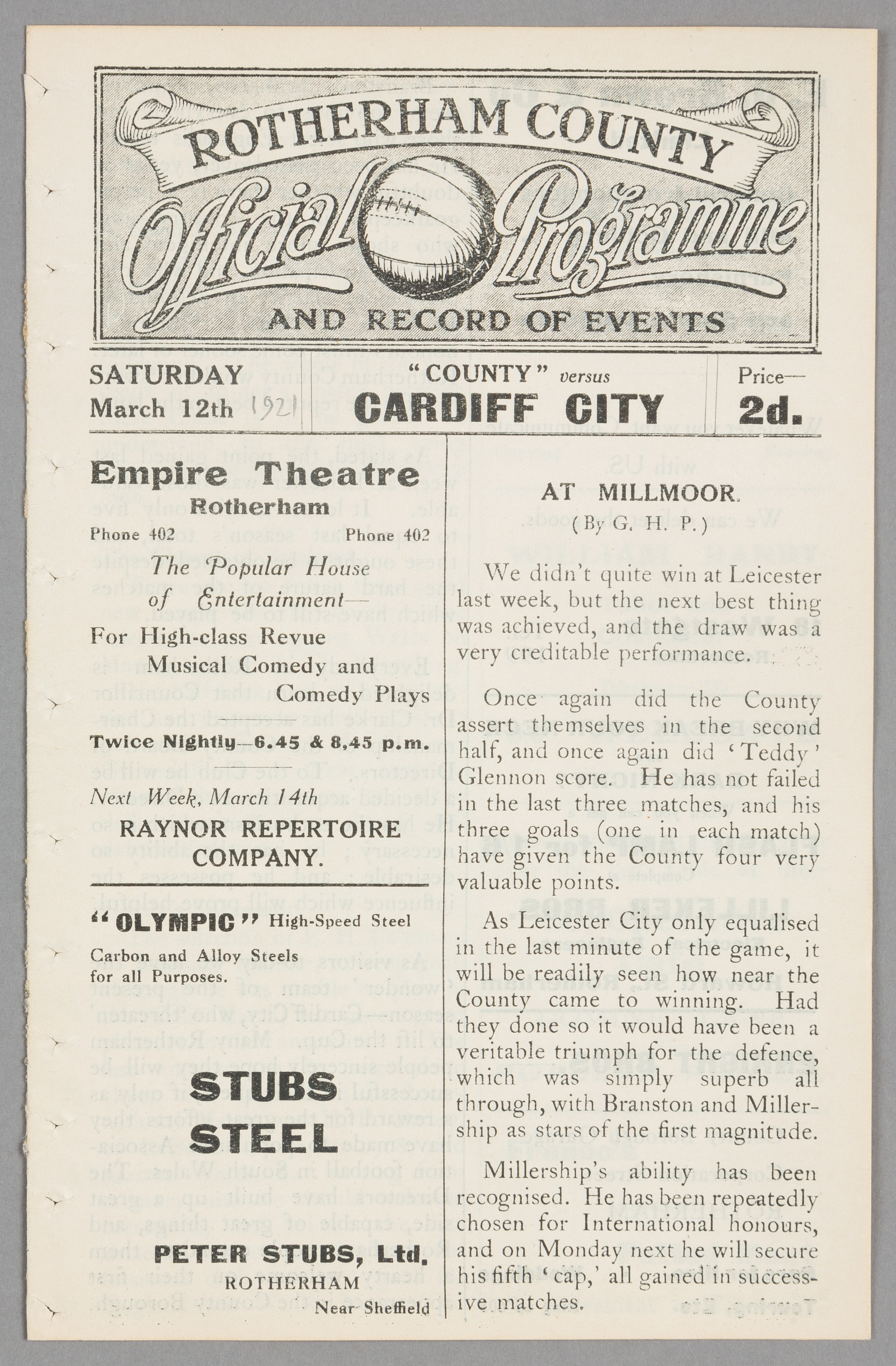 Rotherham County v Cardiff City programme 12th March 1921, F.L. Division Two fixture, ex-binder