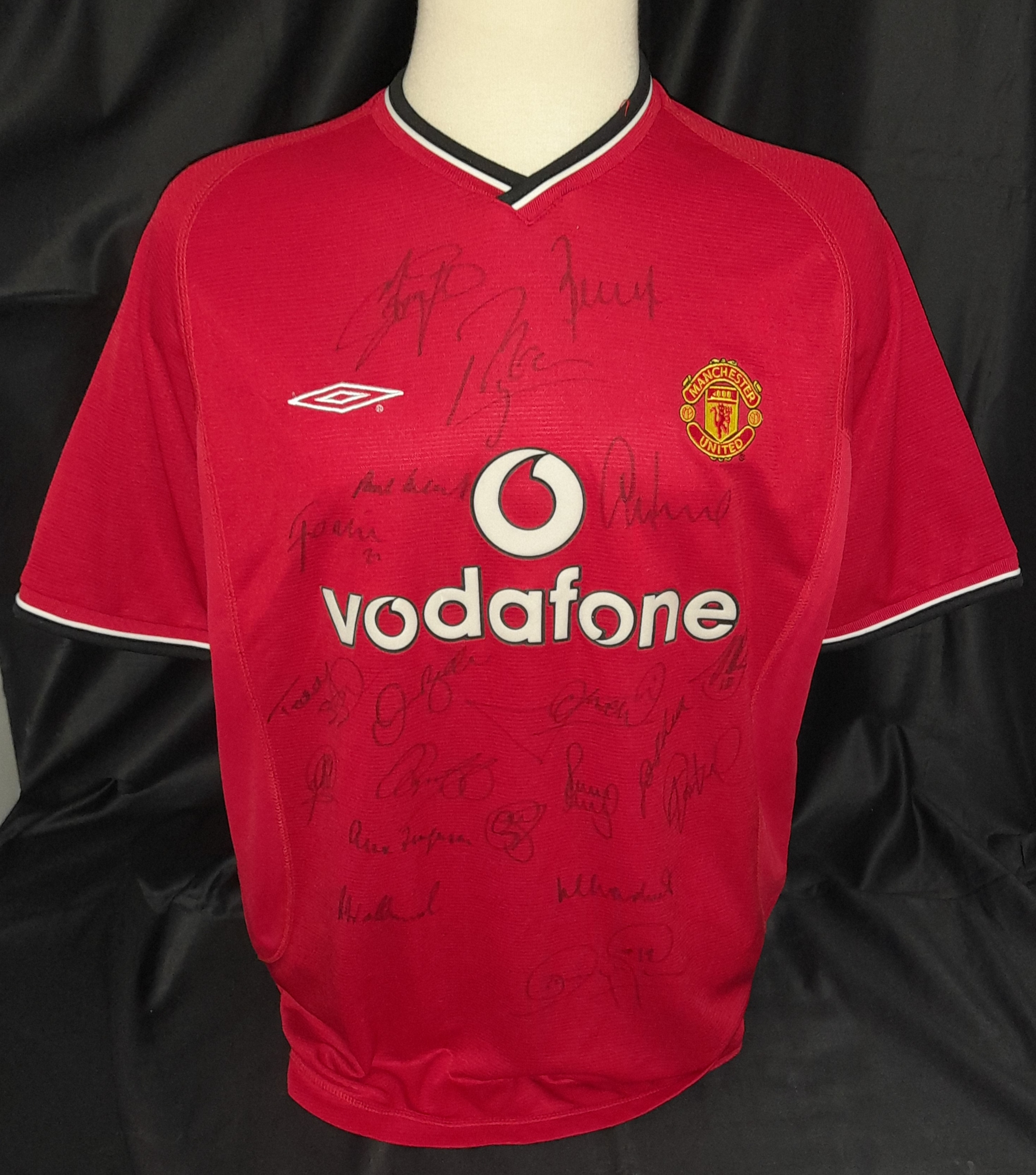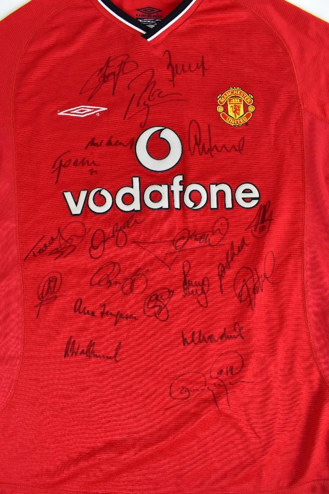 Manchester United squad signed 2000 Premier League winners Umbro replica home shirt, signed by 20, Fabien Barthez, Juan Sebastian Vernon, Roy Keane, Phil Neville, Gary Neville, Diego Forlan, Ruud Van Nistelrooy, Teddy Sheringham, David Beckham, Andy Cole, Danny Webber, John O'Shea, Paul Scholes, Ryan Giggs, Raimond Van De Gouw, Quentin Fortune, Sir Alex Ferguson (manager), Luke Chadwick, Ronnie Wallwork and Dwight Yorke