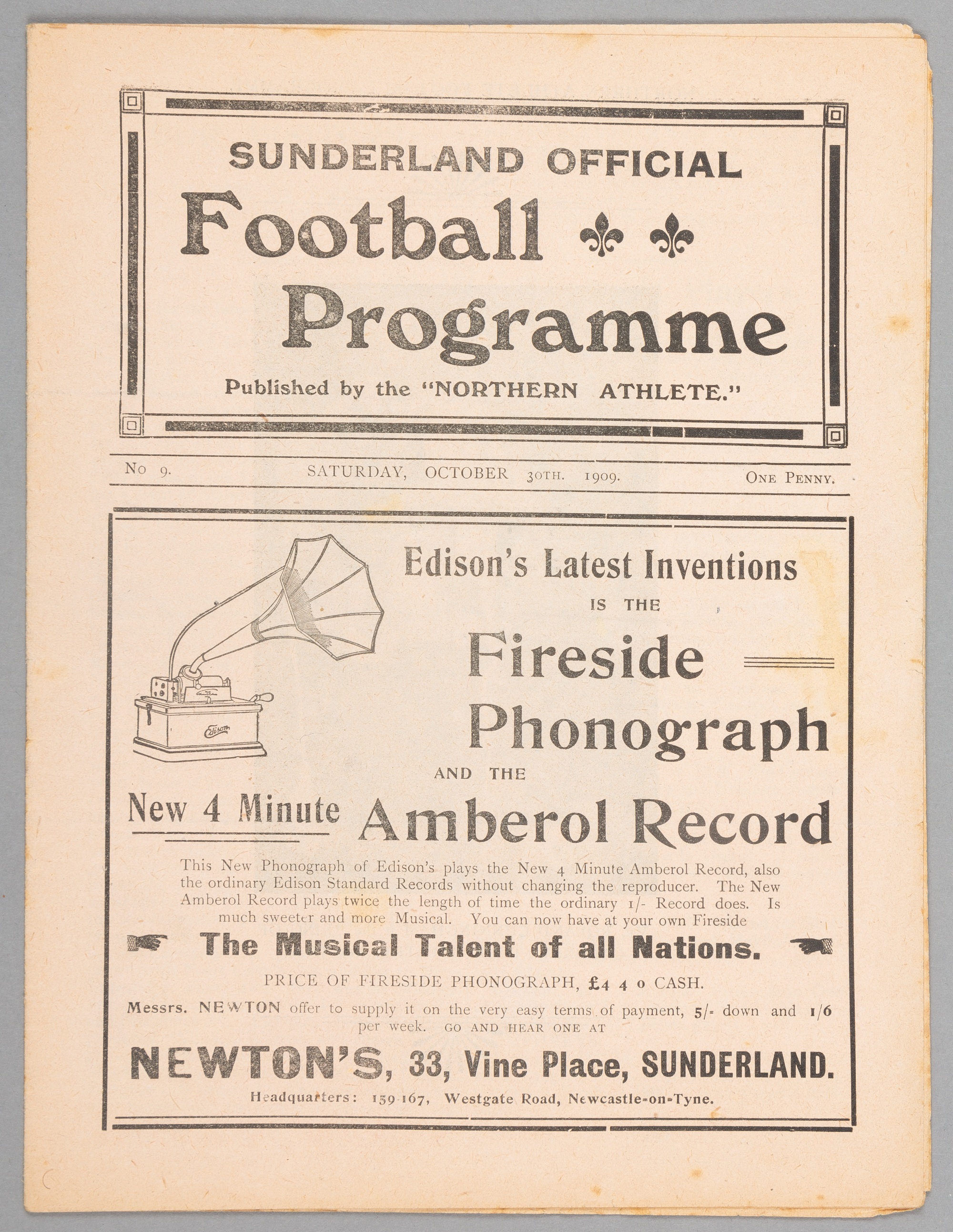 Sunderland v Chelsea programme 30th October 1909, F.L. Division One fixture