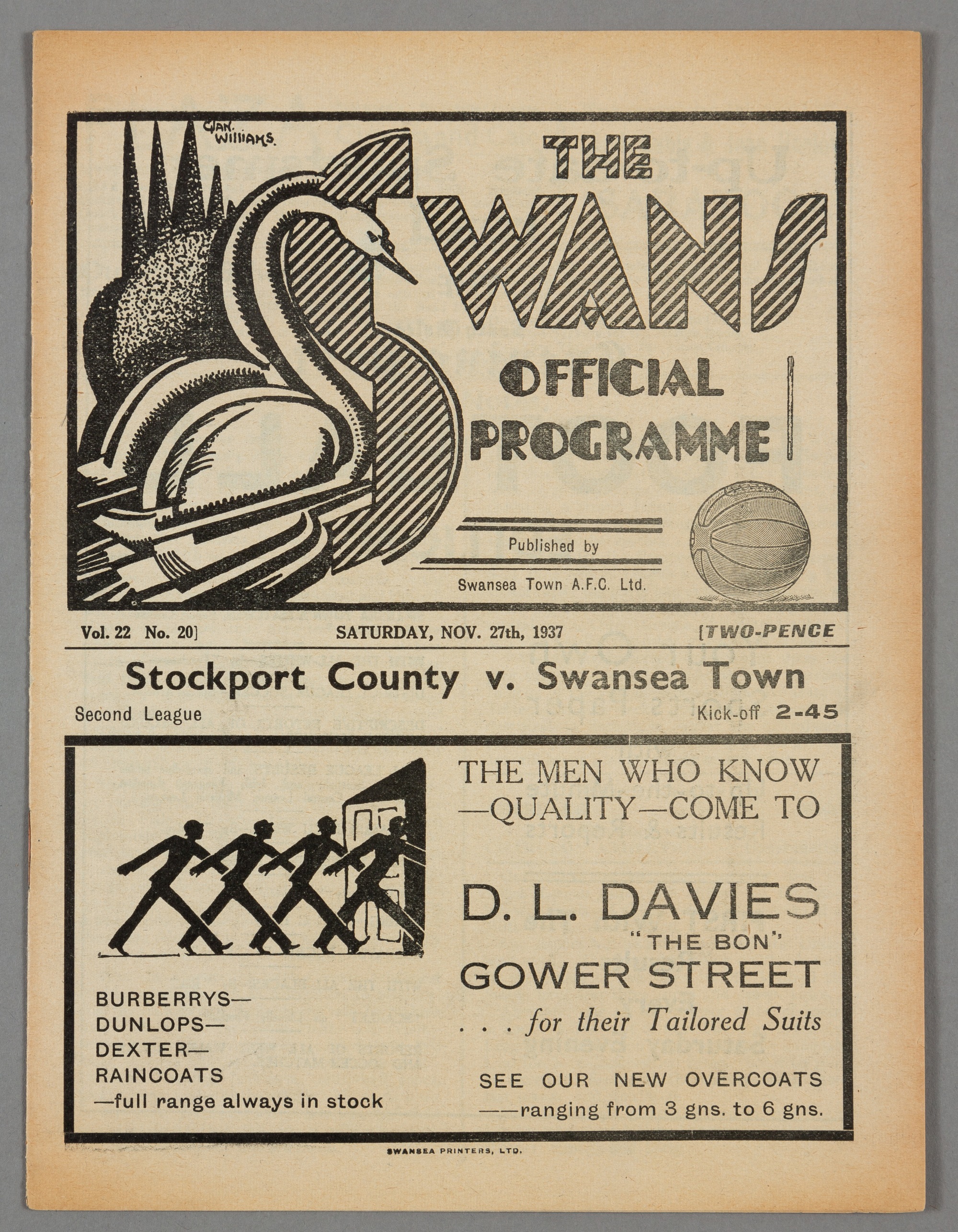 Swansea Town v Stockport County programme 27th November 1937, F.L. Division Two