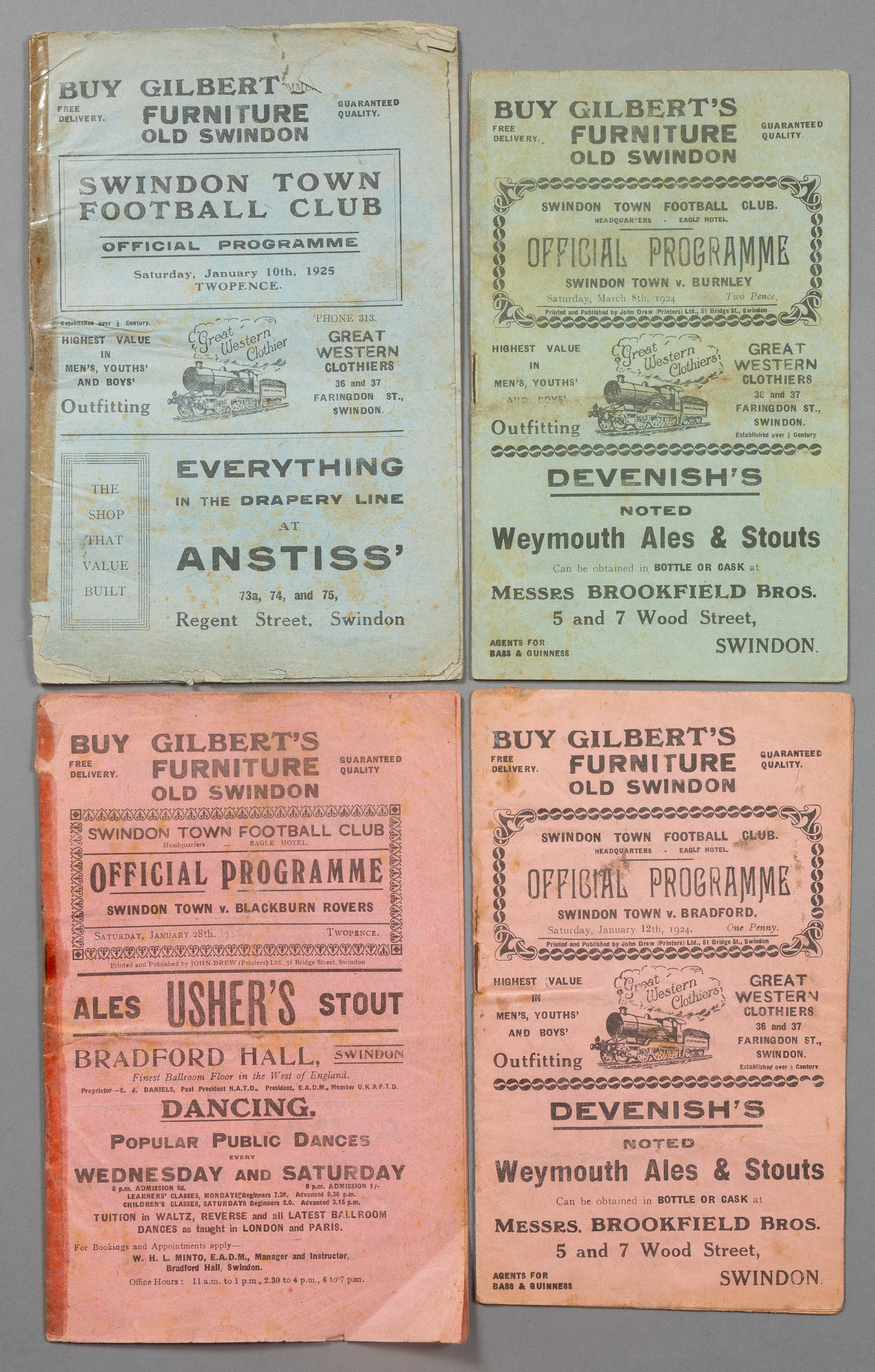 Four Swindon Town 1920s F.A. Cup tie home programmes, Blackburn Rovers 28th January 1922 (FAC2), Bradford P.A. 12th January 1924 (FAC1), Burnley 8th
