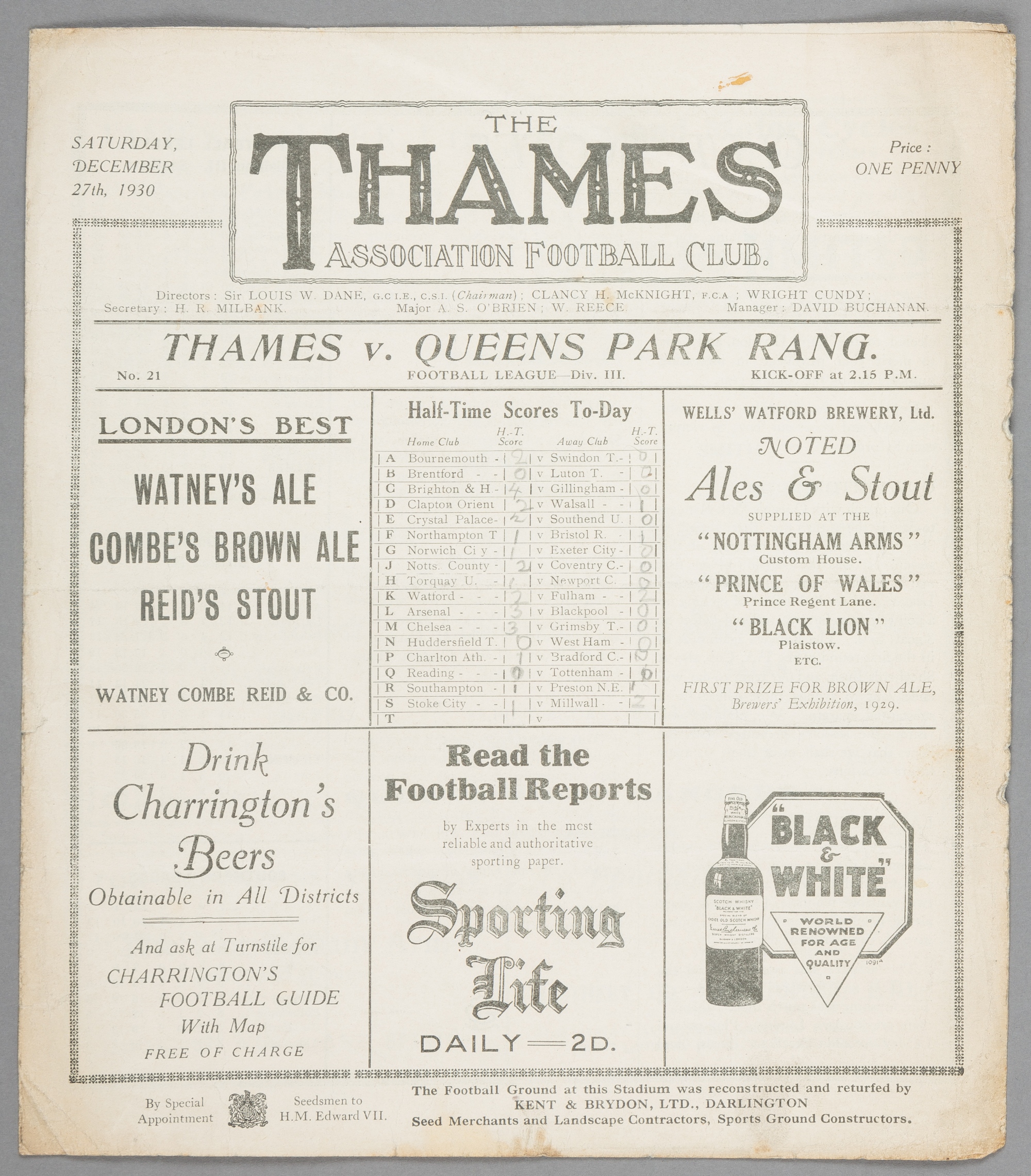 Thames v QPR programme 27th Decemember 1930, F.L. Division Three South fixture 1930-31 was Thames AFC's first of two seasons in the Football League.