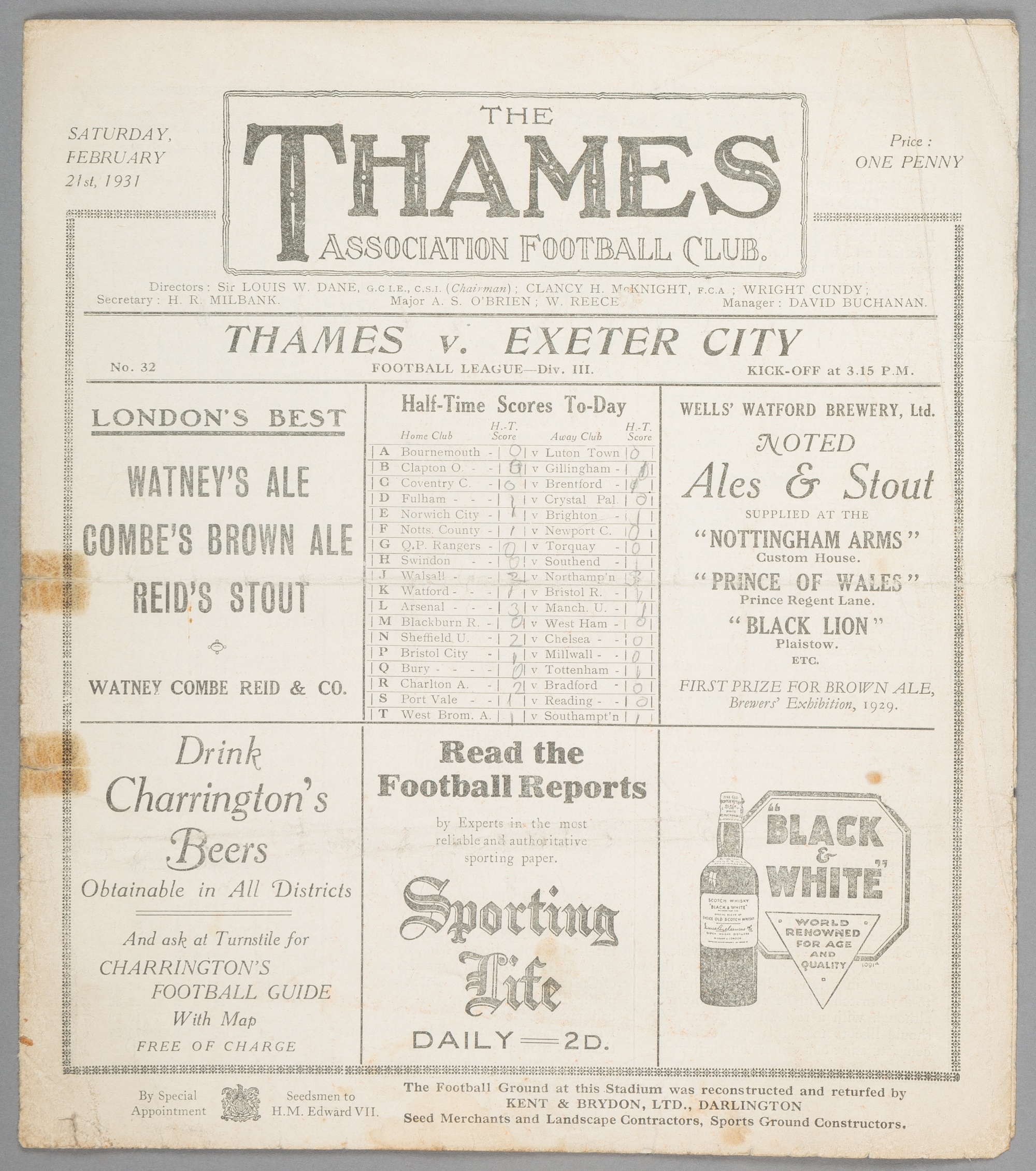Thames v Exeter City programme 21st February 1931, F.L. Division Three South fixture 1930-31 was Thames AFC's first of two seasons in the Football League.