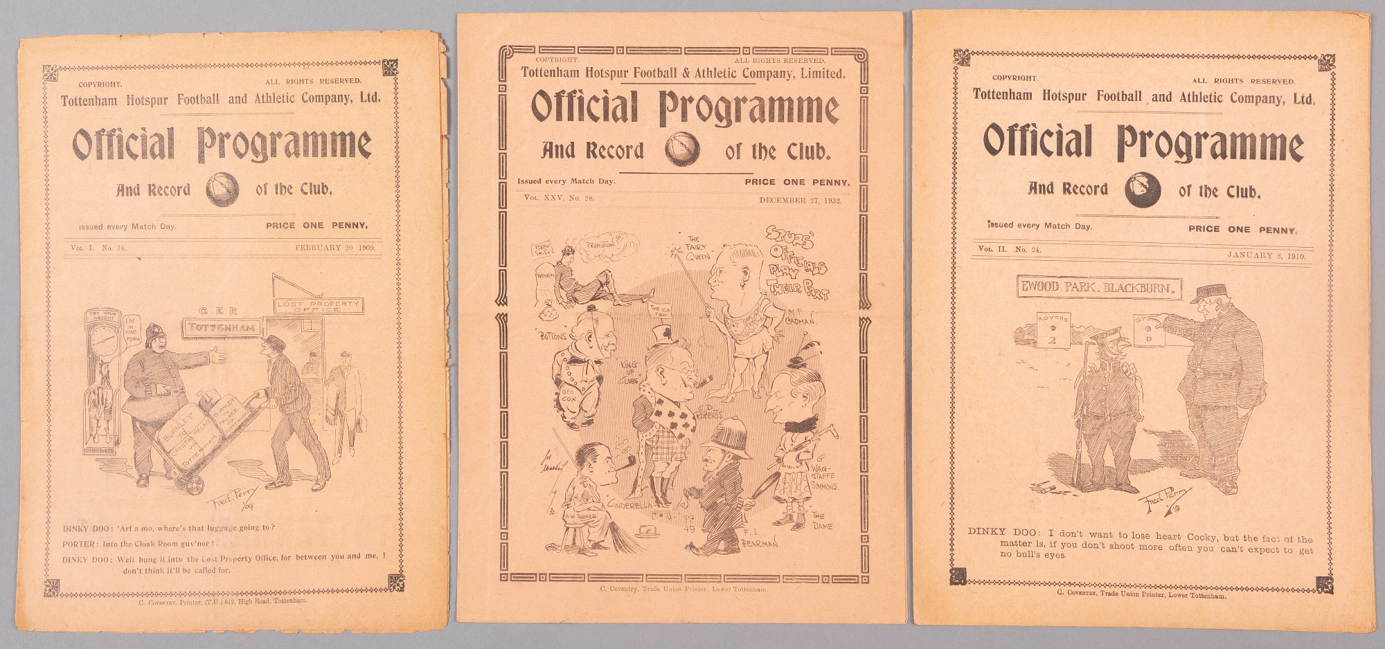 Three Tottenham Hotspur home programmes, v Burnley 20th February 1909 (FA Cup 3rd), Everton 8th January 1910 (FL Div One) and Bradford P.A. (FL Div T