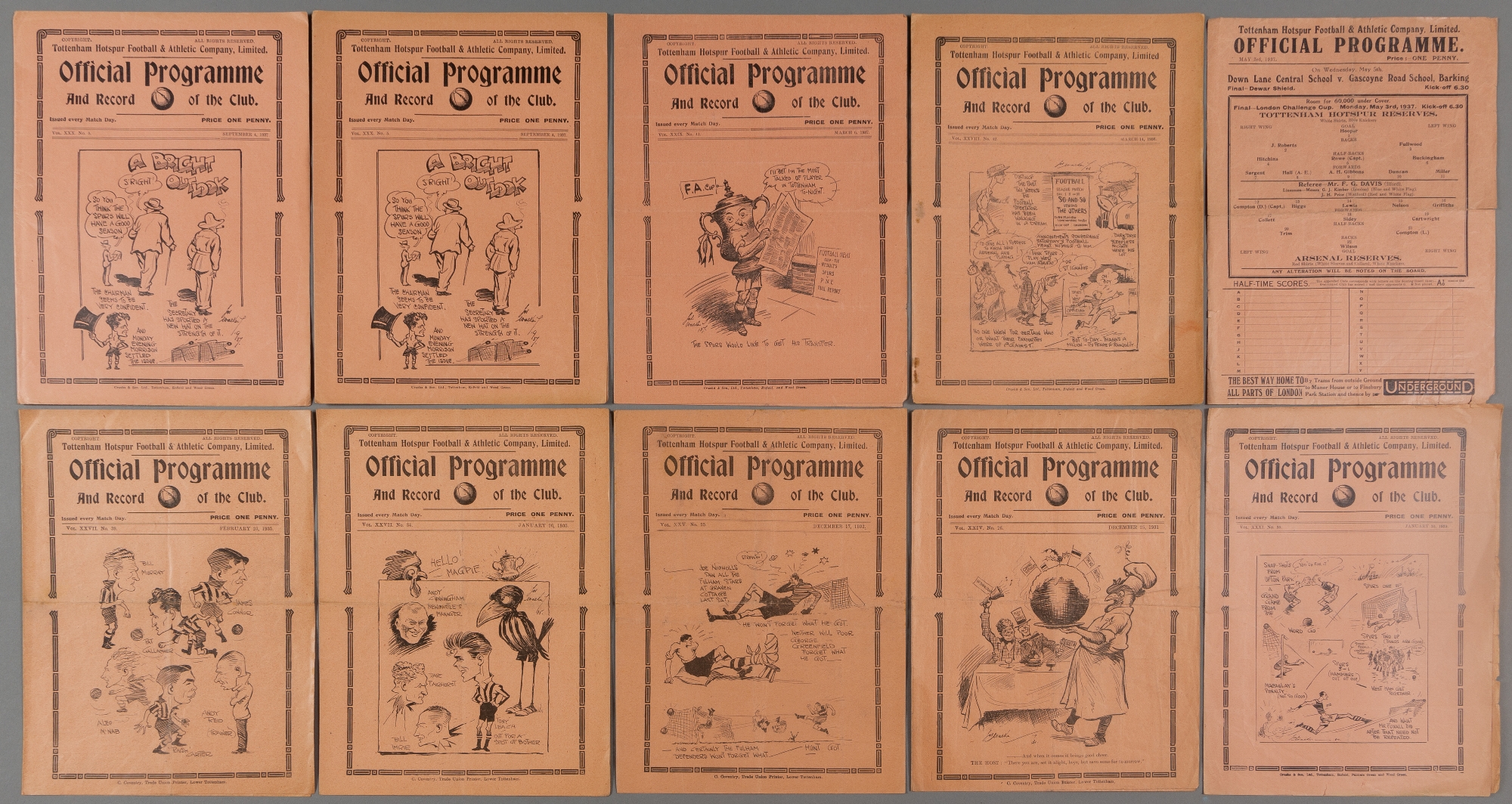 Ten Tottenham Hotspur 1930s home programmes, F.L. Division Two fixtures v Charlton Athletic 25th December 1931 and West Ham United 17th December 1932; FAC4 v Newcastle United 26th January 1935, F.L. Division One v Sunderland 23rd February 1935 and West Ham United 14th March 1936; Preston N.E. 6th March 1937 (FAC6), reserves v Arsenal reserves 3rd May 1937 for the London Challenge Cup Final, single-sheet; 2 copies of Tottenham Hotspur reserves v Ipswich Town reserves 4th September 1937, friendly; and v West Ham United 30th January 1939 (FAC4 replay)