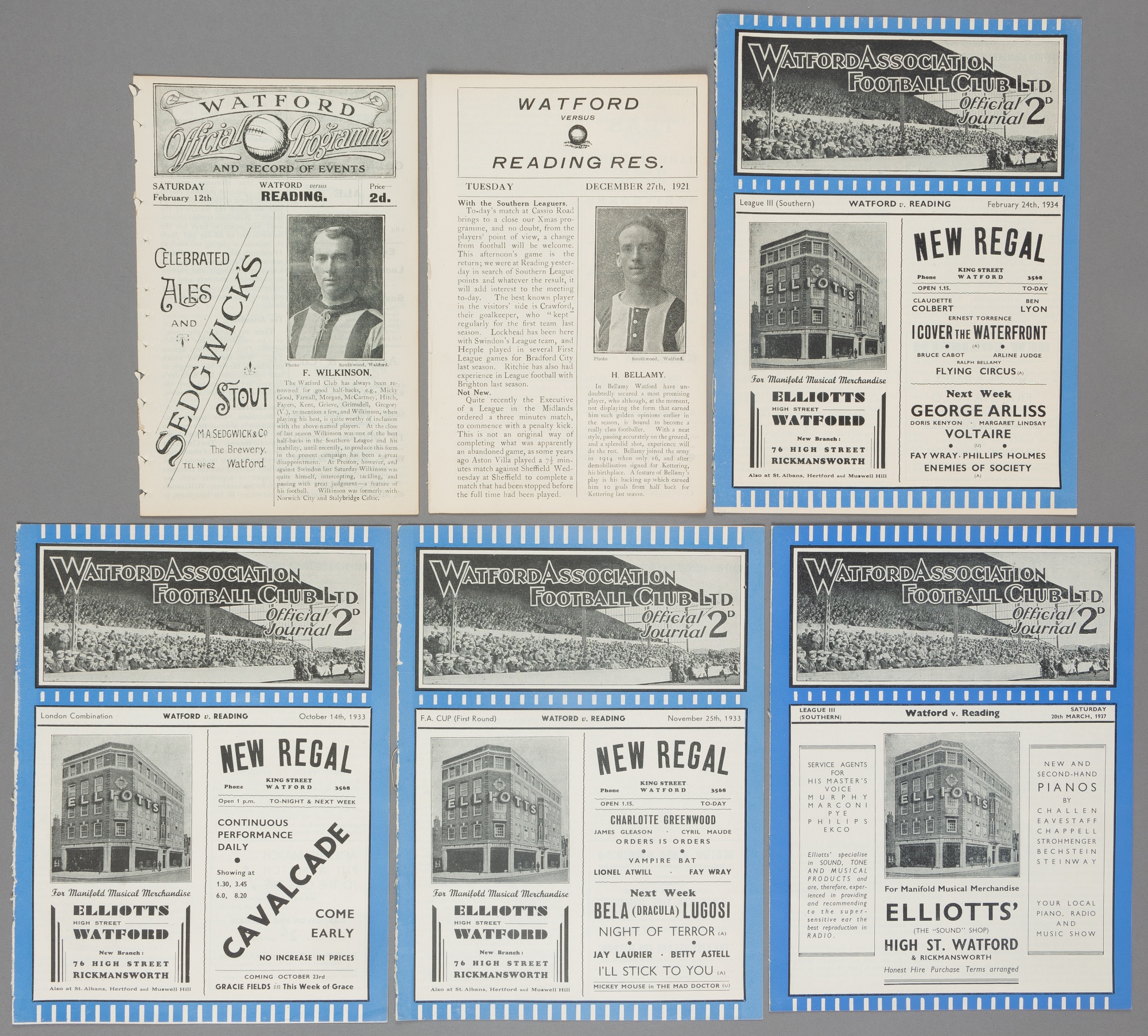 Six Watford v Reading programmes, Southern F.L. Division One 12th February 1920 (ex-binder, covers removed), 27th December 1921 (reserves, London Combination ex-binder, covers removed), 14th October 1933 (reserves, London Combination), two F.L. Division Three South fixtures 24th February 1934 and 20th March 1937; and a F.A. Cup 1st Round tie 25th November 1933