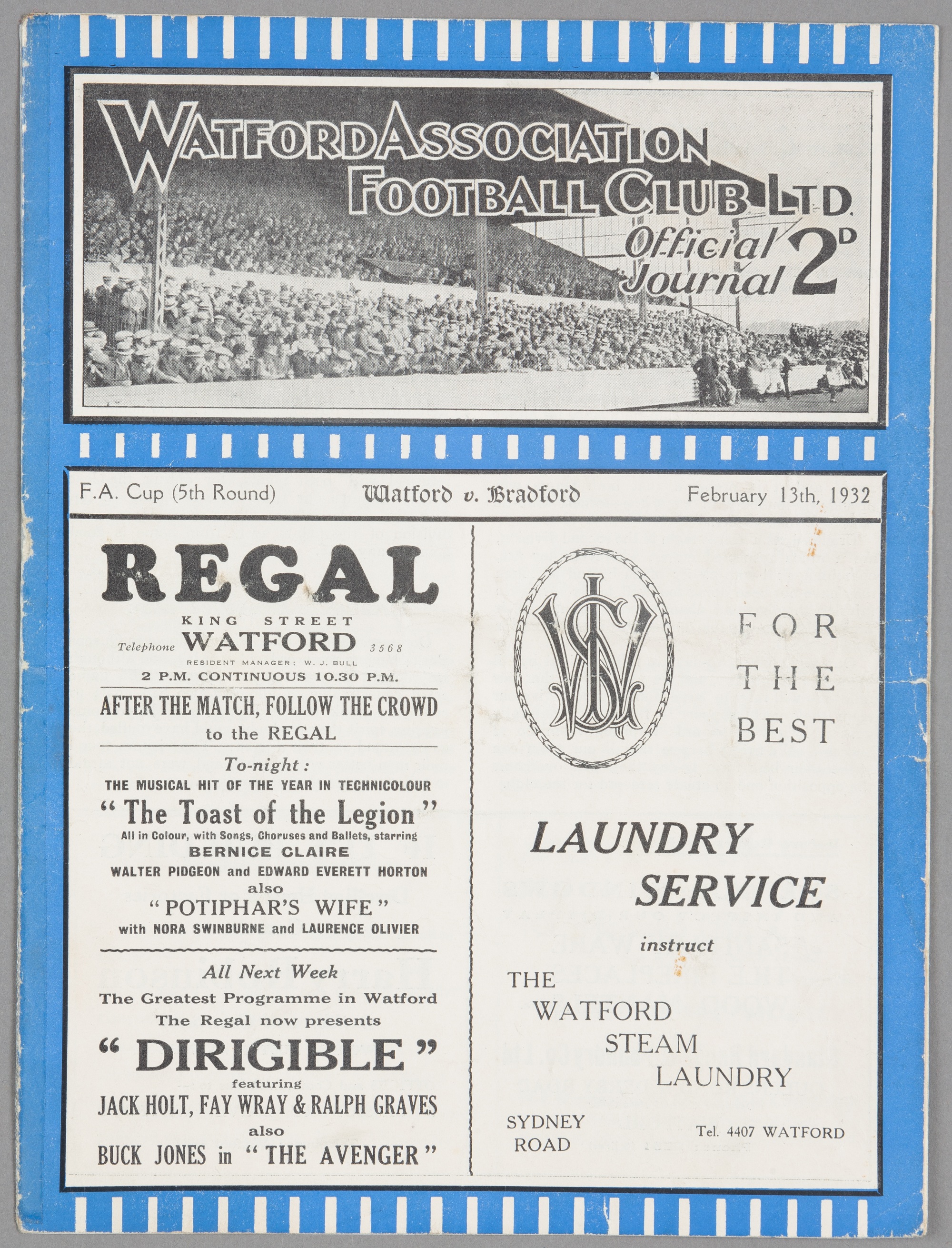 Watford v Bradford Park Avenue programme 13th February 1932, F.A. Cup 5th Round