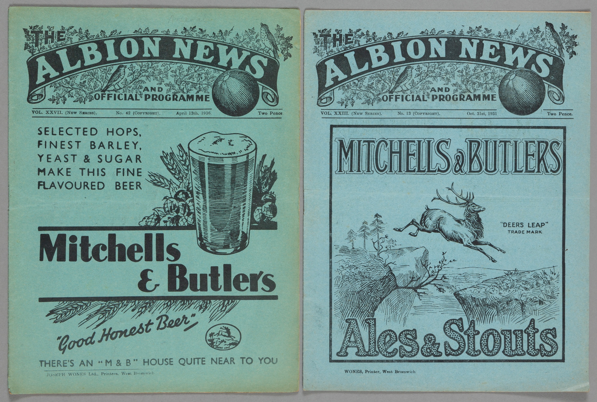 Two WBA 1930s home programmes, F.L. Division One fixtures v Sheffield Wednesday 31st October 1931 and Arsenal 13th April 1936
