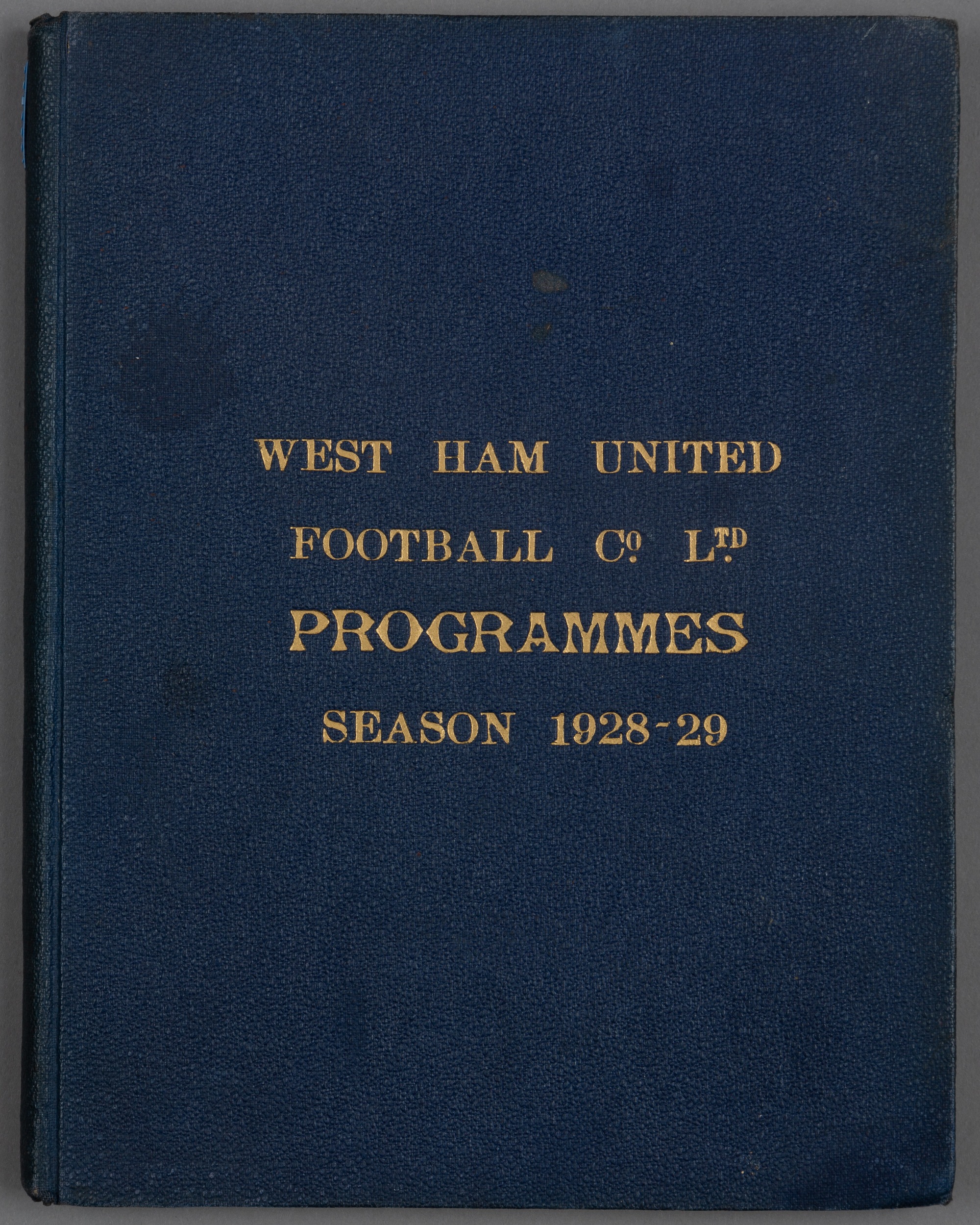 Bound volume of West Ham United home programmes season 1928-29, comprising first team (Football League Div 1), reserves (London Combination) and ‘A’ team (Metropolitan Mid-Week League), plus two practice matches – No. 2 printed on blue paper, London Professional Charity Fund game v Millwall 8th Oct, friendly West Ham ‘A’ v Custom House 13th Oct, London Challenge Cup 1st Rd v Chelsea 15th Oct, London Challenge Cup S/F Tottenham v Charlton Ath 26th Nov, FA Cup 3rd Rd v Sunderland 12th Jan, FA Cup 4th Rd v Corinthian 26th Jan, reserves friendly v Bournemouth 16th Feb, FA Cup 5th Rd replay v Bournemouth 20th Feb, reserves Combination match v Arsenal 2nd March printed on blue paper, reserves friendly v Thames 18th March, reserves Combination match v Reading 2nd Apr printed on blue paper, London Senior Cup Final London Calies v Ilford 11th May, blue cloth binding, gilt titling to front board, very good condition throughout.