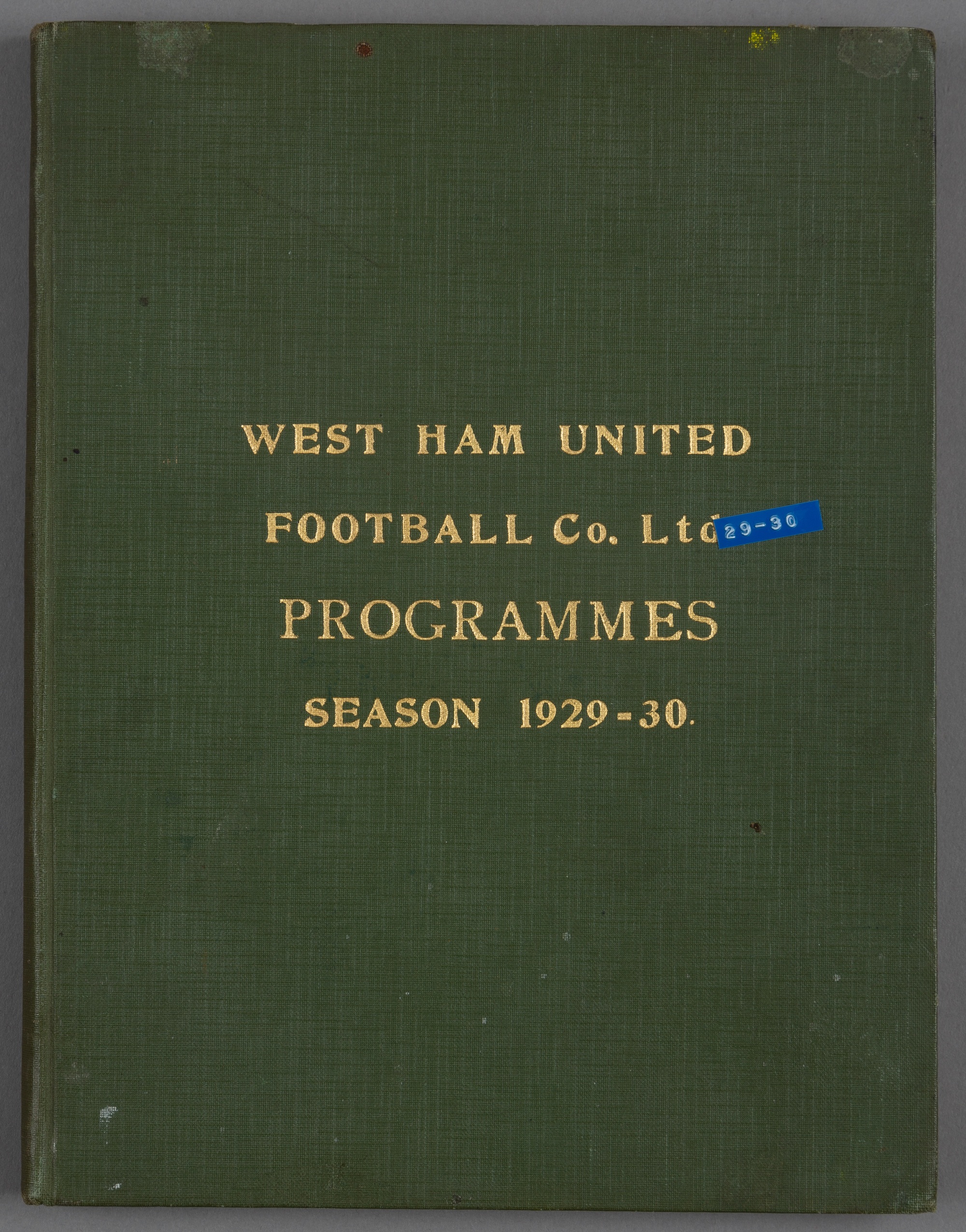 Bound volume of West Ham United home programmes season 1929-30, comprising first team (Football League Div 1) and reserves (London Combination), plus two practice matches, London Professional Charity Fund game v Clapton Orient 30th Sept, London FA Cup 1st Rd replay v Crystal Palace 21st Oct, London Challenge Cup 2nd Rd v Thames 4th Nov, FA Cup 1st Rd replay Dagenham Town v Barry 4th Dec, FA Cup 3rd Rd v Notts County 11th Jan, FA Cup 4th Rd v Leeds Utd 25th Jan, FA Cup 5th Rd v Millwall 15th Feb, FA cup 6th Rd v Arsenal 1st March, FA Amateur Cup Final Ilford v Bournemouth Gasworks Athletic 12th April, London Amateur Senior Cup Final Ilford v Walthamstow Avenue 10th May, green covers, cloth boards good, interior very good, no blue programme in interior