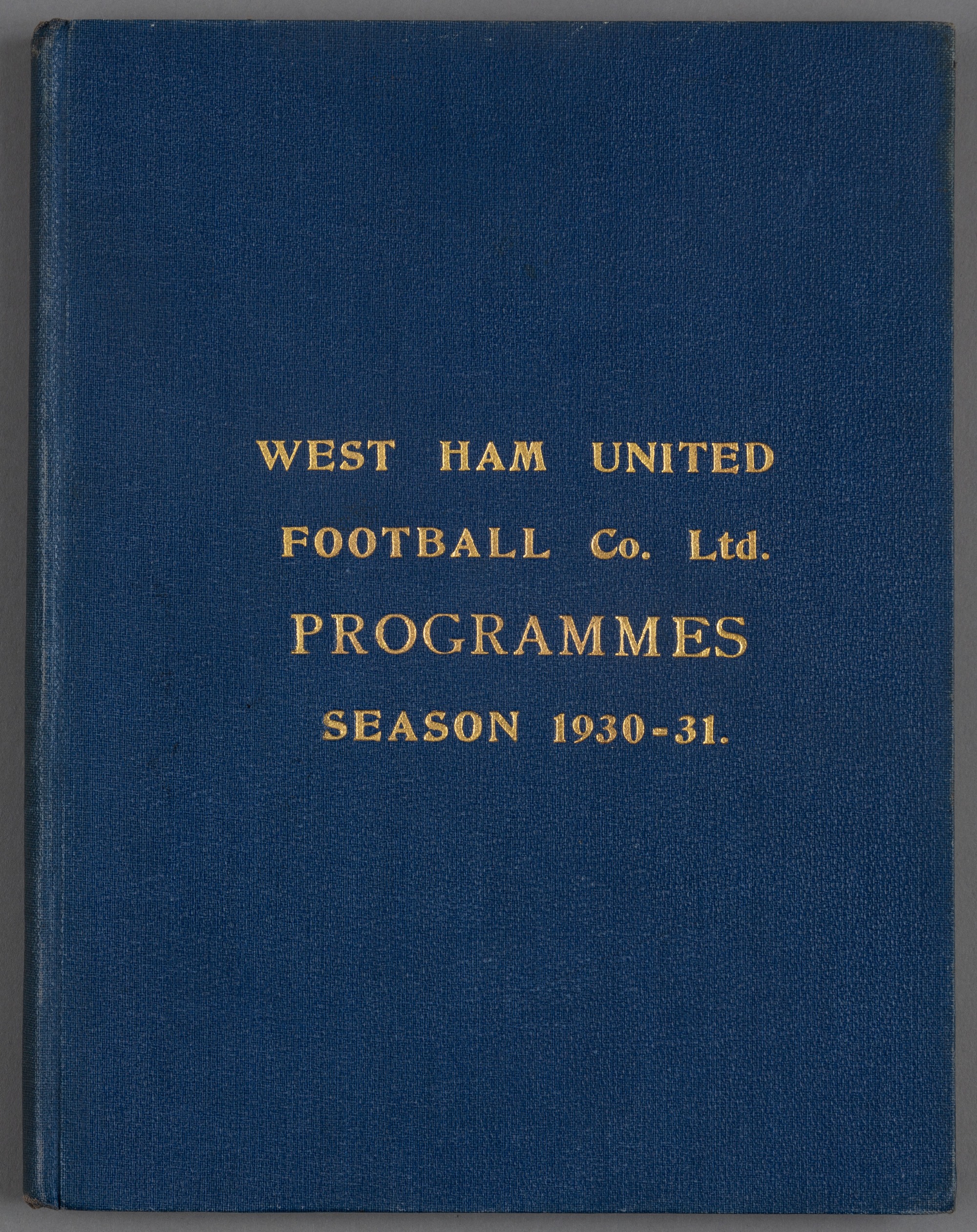 Bound volume of West Ham United home programmes season 1930-31, comprising first team (Football League Div 1) and reserves (London Combination), plus two practice matches, London FA Cup S/F Tottenham v Ilford 17th Nov, friendly v Tottenham (East Ham British Legion Charity match) 8th Dec, FA Cup 3rd Rd v Chelsea 10th Jan, friendly v Corinthian 24th Jan, London Senior Cup S/F Wimbledon v Enfield 14th March, Inter-Services game Army v RAF 21st March, excellent condition throughout, blue hardback cover, no blue programme in interior