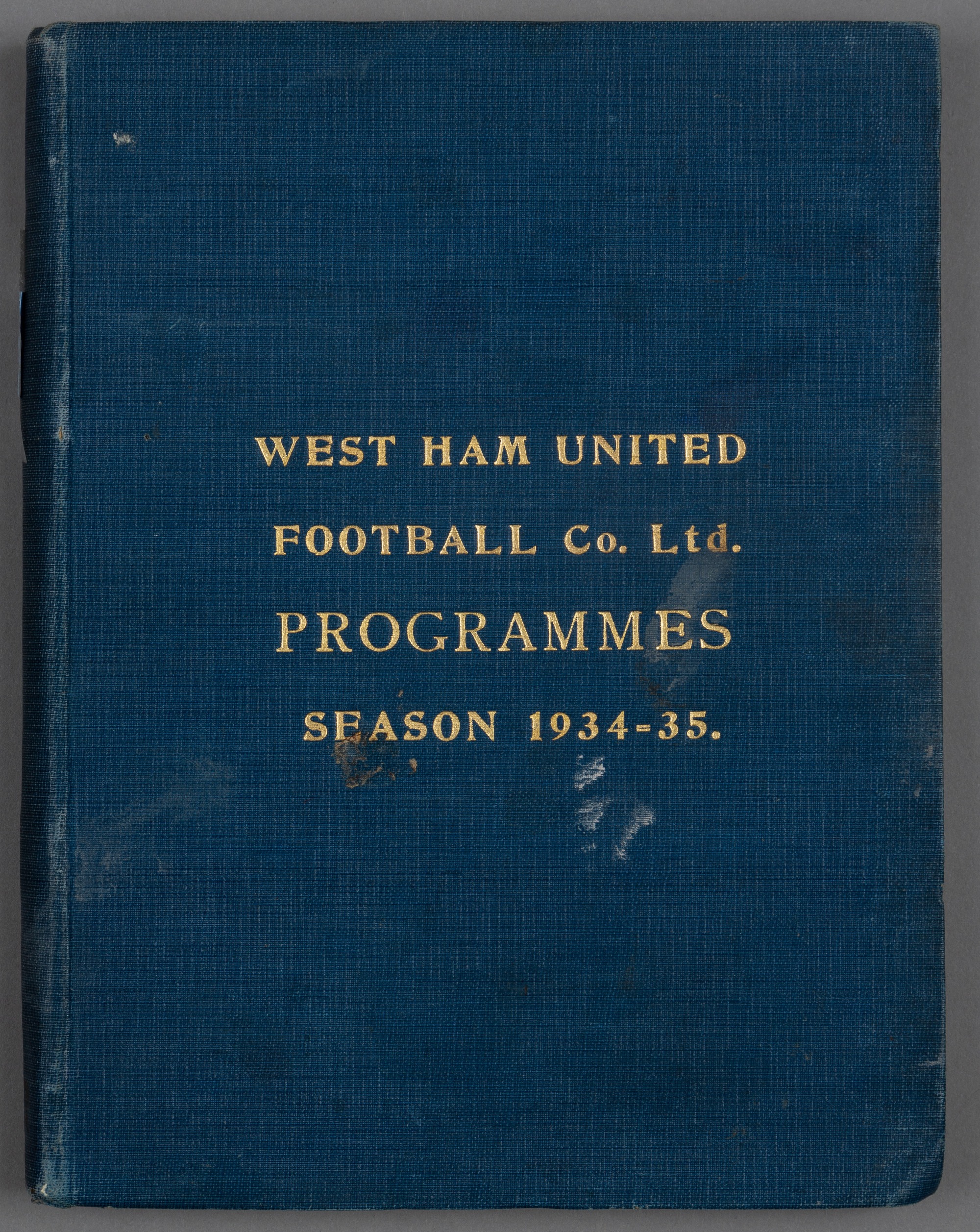 Bound volume of West Ham United home programmes season 1934-35, the volume commencing with the AIK Stockholm match 26th Nov VIP edition 4-pager within stiff card covers bearing red/white/blue and blue/yellow/white representing the teams’ national colours, plus standard 4-pager, remaining content comprising first team (Football League Div 2 and FA Cup), reserves (London Combination and London Mid-Week League), plus two practice matches, London Challenge Cup Reserves v Nunhead 8th Oct, reserves v Arsenal Res 22nd Oct, FA Cup 3rd Rd v Stockport, the Sun Shield S/F West Ham Boys v Acton, Brentford & Chiswick Boys 16th Feb, Essex County C’Ship S/F West Ham Boys v Walthamstow Boys 13th April, Charity match West Ham v Fairbairn House OB 29th April s/s, friendly West Ham ‘A’ team XI v L.G.O.C, Bromley Garage 1st May, blue cloth binding, gilt titling to front board, marks and stains to front board, interior very good, blue hardback, no blue programme in interior