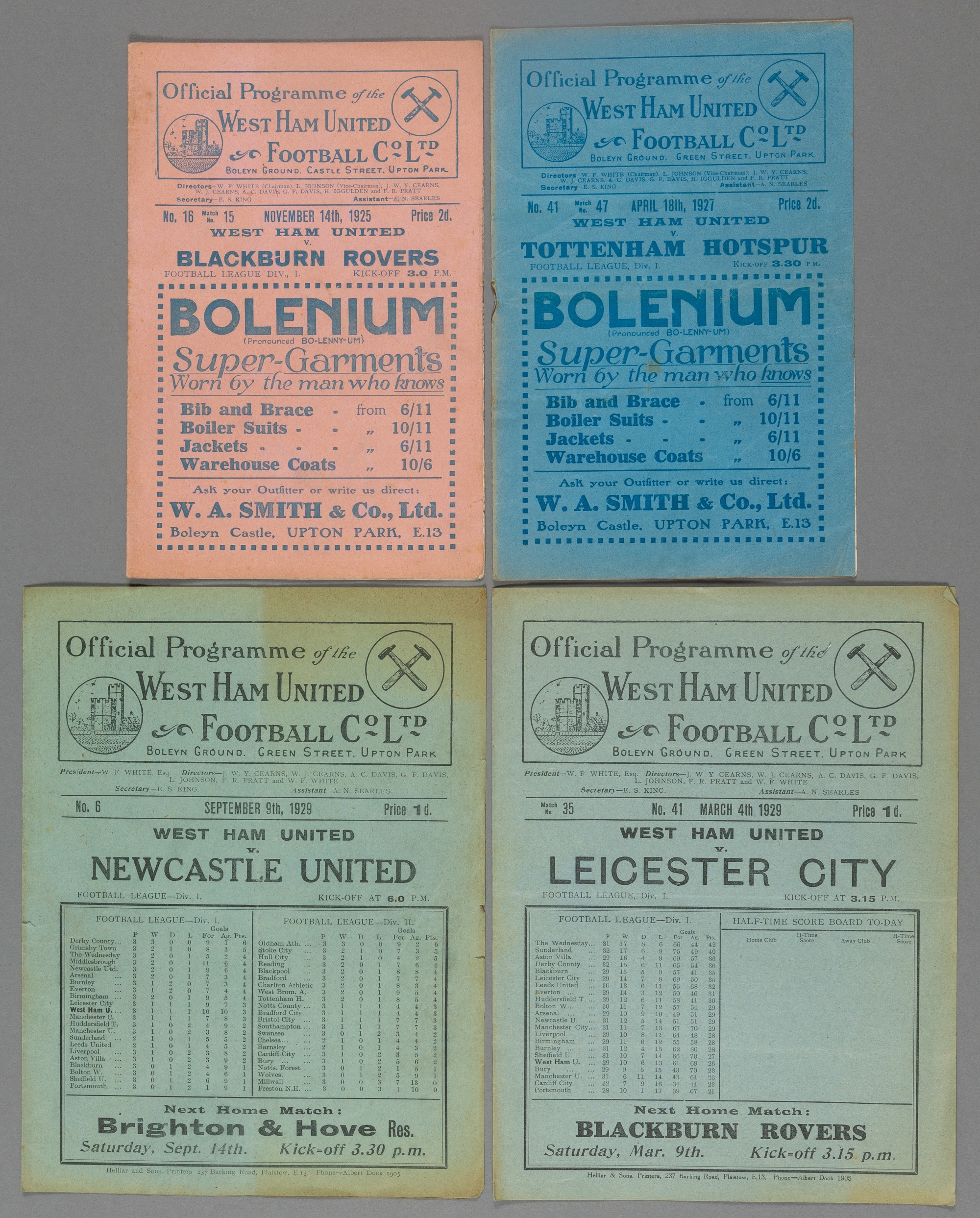 Four West Ham United 1920s home programmes, F.L. Division One fixtures v Blackburn Rovers 14th November 1925, Tottenham Hotspur 18th April 1927, Leicester City 4th March 1929 and Newcastle United 9th September 1929