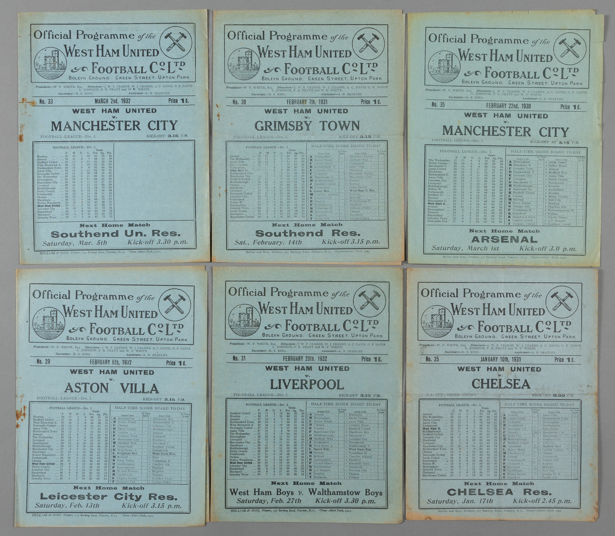 Six West Ham United 1930s home programmes, F.L. Division One fixtures unless otherwise stated, Manchester City 22nd February 1930, Chelsea 10th January 1931 (FAC3), Grimsby Town 7th February 1931, Aston Villa 6th February 1932, Liverpool 20th February 1932 and Manchester City 2nd March 1932