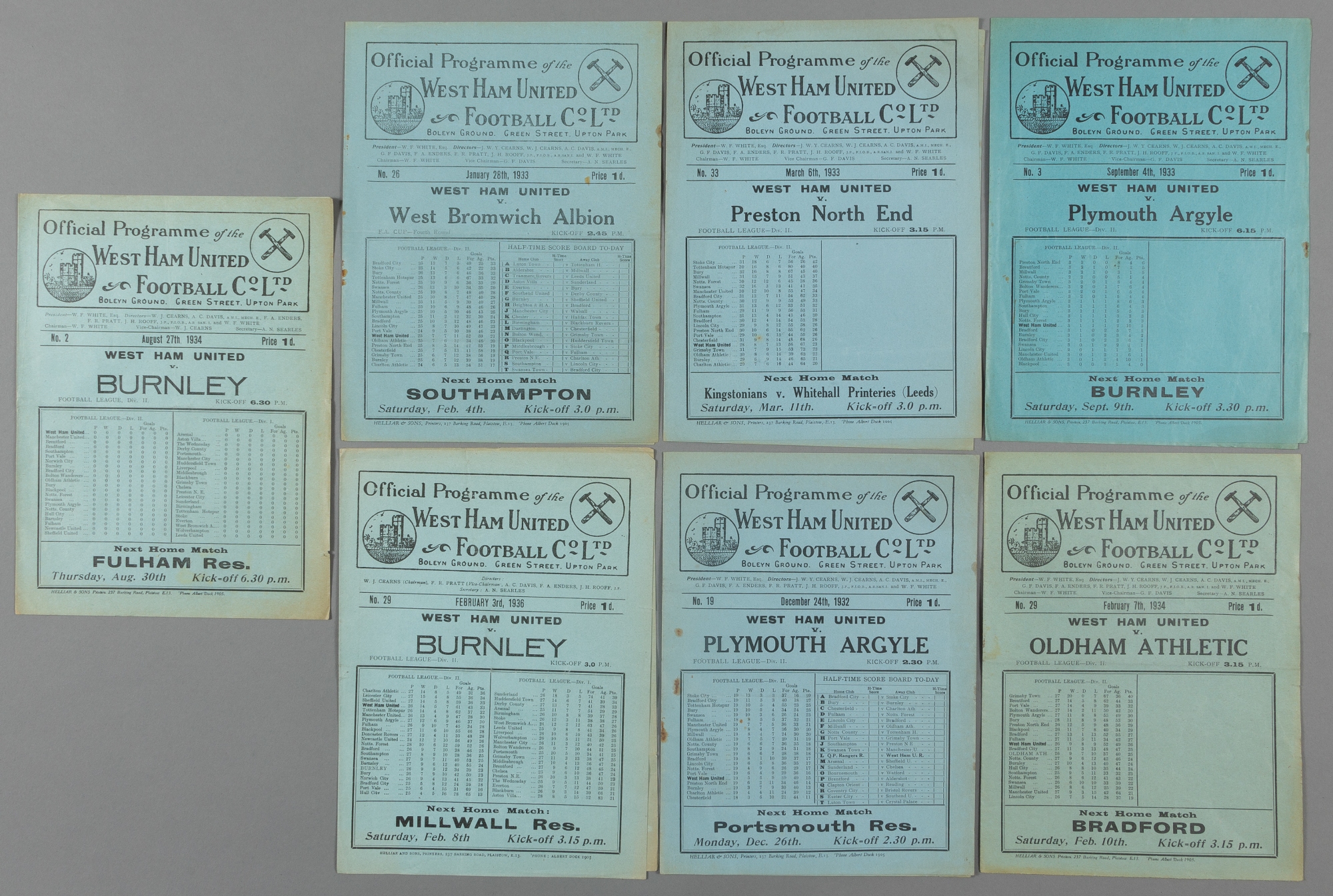 Seven West Ham United 1930s home programmes, F.L. Division Two fixtures unless otherwise stated, Plymouth Argyle 24th December 1932, WBA 28th January 1933 (FAC4), Preston N.E. 6th March 1933, Plymouth Argyle 4th September 1933, Oldham Athletic 7th February 1934, Burnley 27th August 1934 and Burnley 3rd February 1936