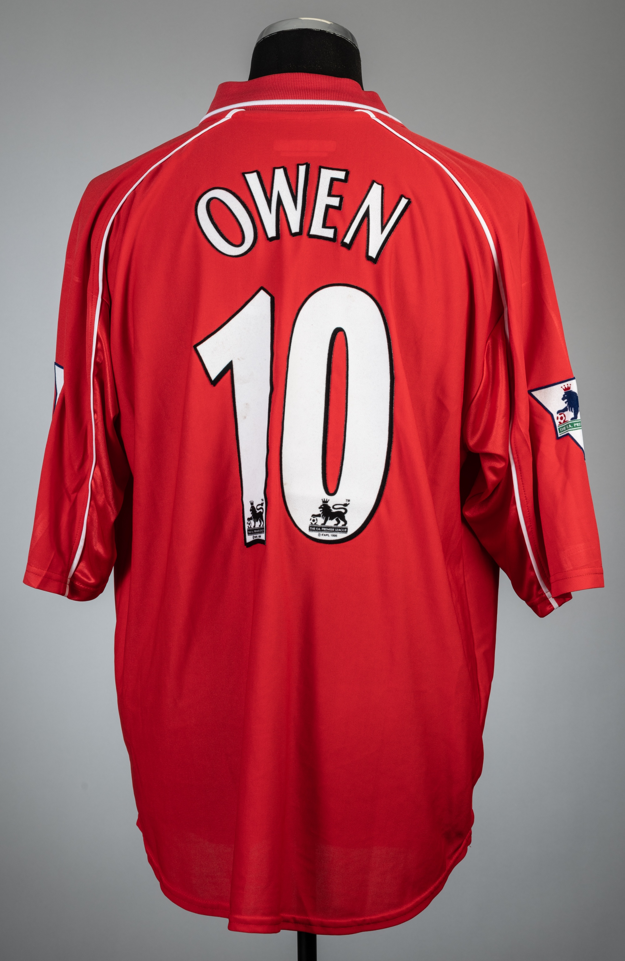 Michael Owen red Liverpool no.10 home jersey, season 2000-01, Reebok, short-sleeved with THE FA PREMIER LEAGUE sleeve badges, club crest and sponsor logo, reverse lettered OWEN, size 46-48in., number on reverse bearing slight stains