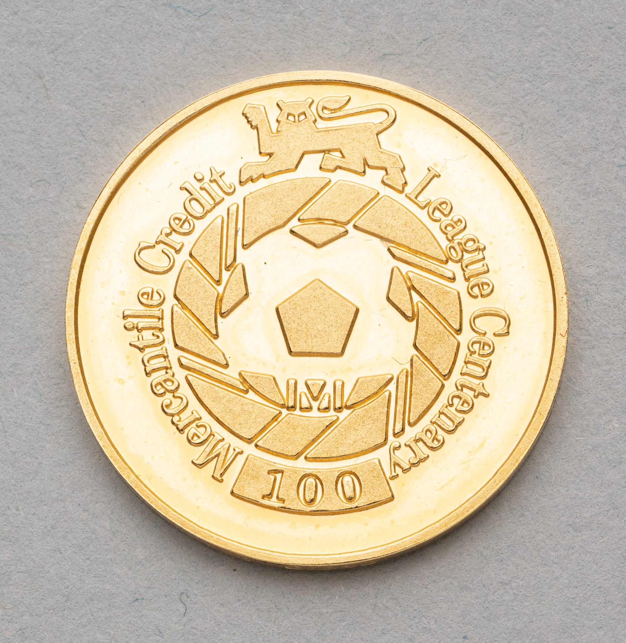 Mercantile Credit Centenary Classic The Football League v The Rest of the World medallion, played at Wembley, 8th August 1987, obverse featuring a stylised football surrounded by MERCANTILE CREDIT LEAGUE CENTENARY 100, reverse with MERCANTILE CREDIT CENTENARY CLASSIC THE FOOTBALL LEAGUE v THE REST OF THE WORLD WEMBLEY STADIUM 8 AUGUST 1987, circular, hallmarked 916 22ct gold Birmingham 1987 by IMP, diameter 25mm., in original fitted case