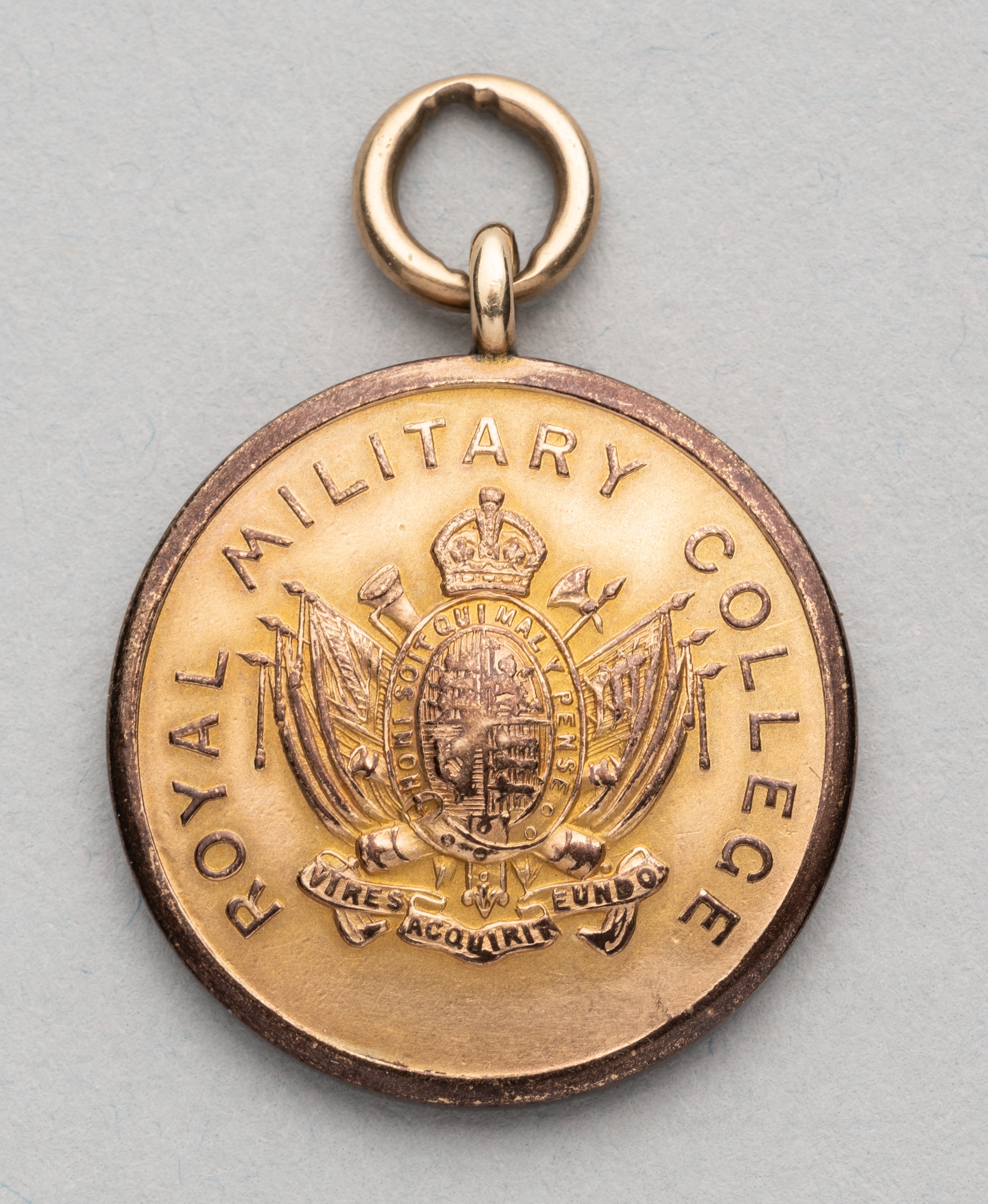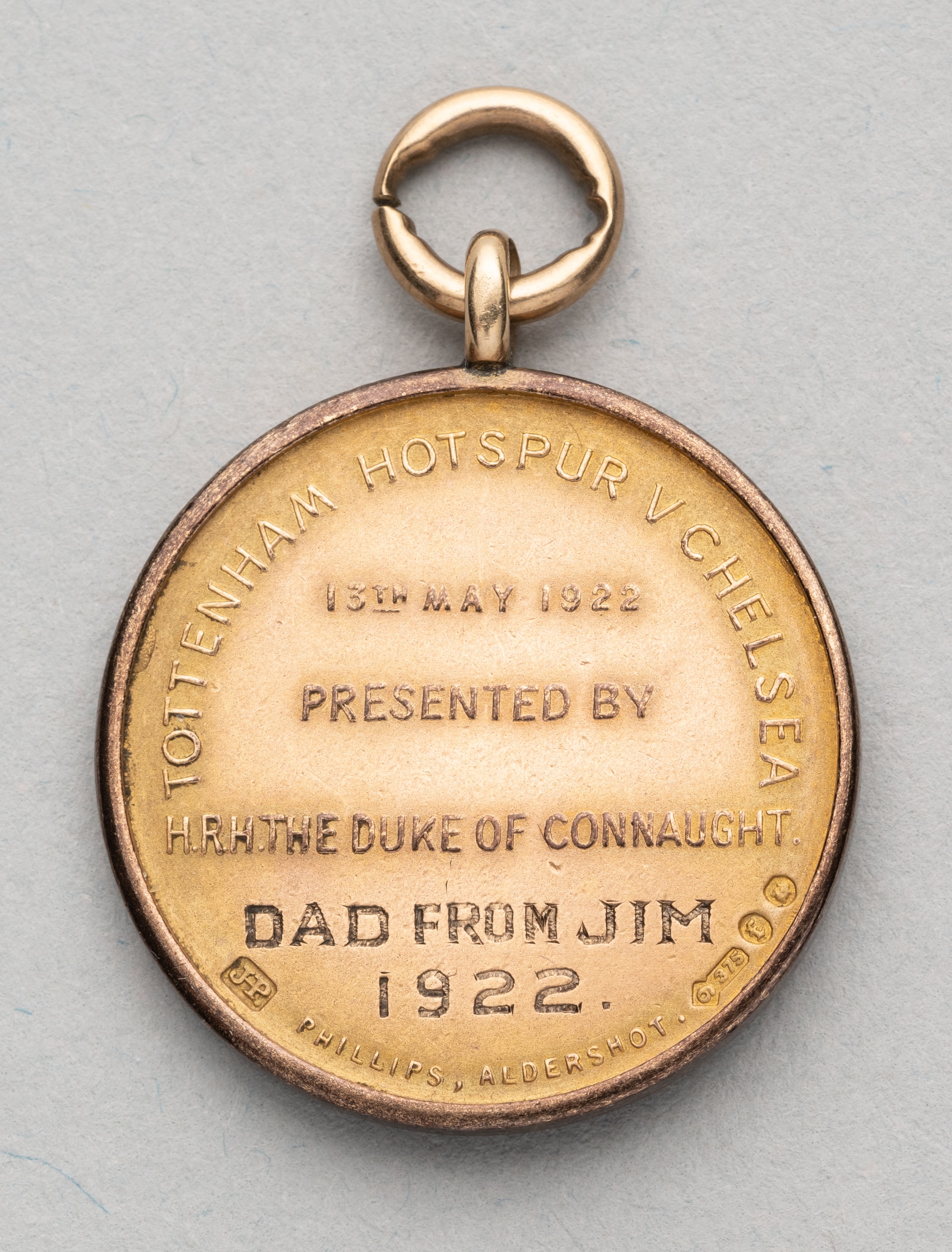 Two medals awarded to Tottenham Hotspur's Jimmy Skinner, comprising Royal Military College medal Tottenham Hotspur v Chelsea 13th May 1922, obverse with ROYAL MILITARY COLLEGE lettering surrounding crest, reverse with TOTTENHAM HOTSPUR V CHELSEA 13TH MAY 1922 PRESENTED BY H.R.H. THE DUKE OF CONNAUGHT lettering, engraved DAD FROM JIM 1922, 9ct gold London 1921 by John Pinches, diameter 25mm.; and a 9ct gold medal, obverse with scroll decoration surrounding vacant shield, reverse engraved J.F. SKINNER MANOR ROAD. 1909-10-11-12, 9ct gold Birmingham 1911 by Robert Pringle & Sons, 34 by 22cm.; total weight 15gms., (2) James "Jimmy" Frederick Skinner (1898-1984), born in Beckenham, played for Beckenham Town, attended Manor Road school in West Ham and went to play for West Ham schools and represented the London schools side of 1912–13. In 1913 the schoolboy star was chosen to play for England schoolboys. He played for Tottenham Hotspur during 1919-25, making 89 appearances scoring three goals.