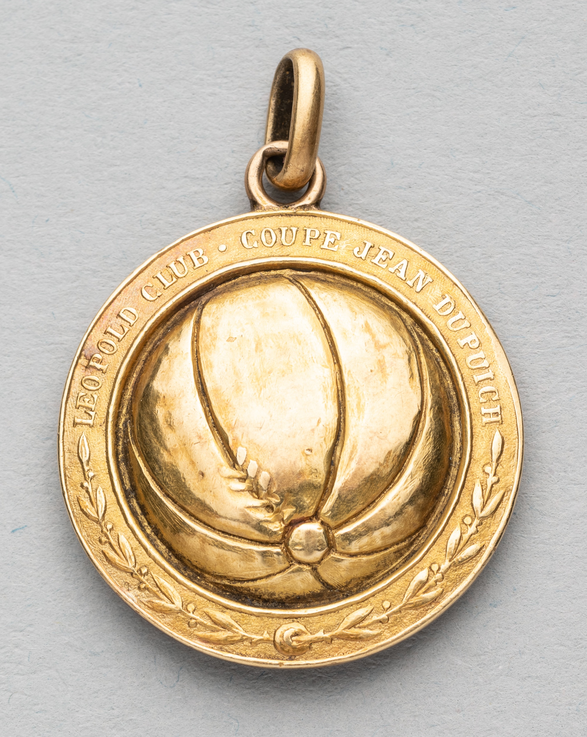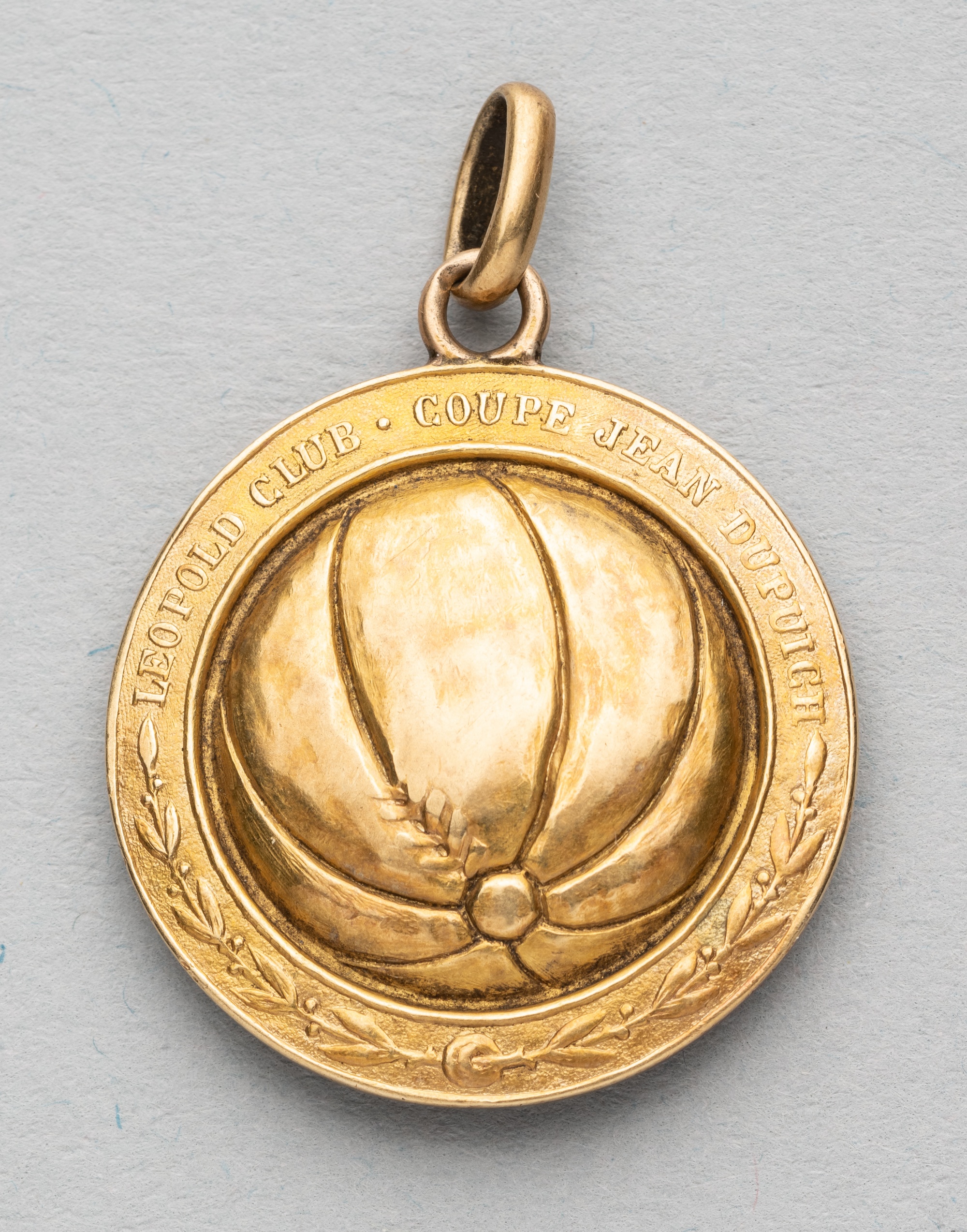 Leopold Club Coupe Jean Dupuich yellow metal medal, modelled with a central football with a border of laurel leaves and LEOPOLD CLUB COUPE JEAN DUPU