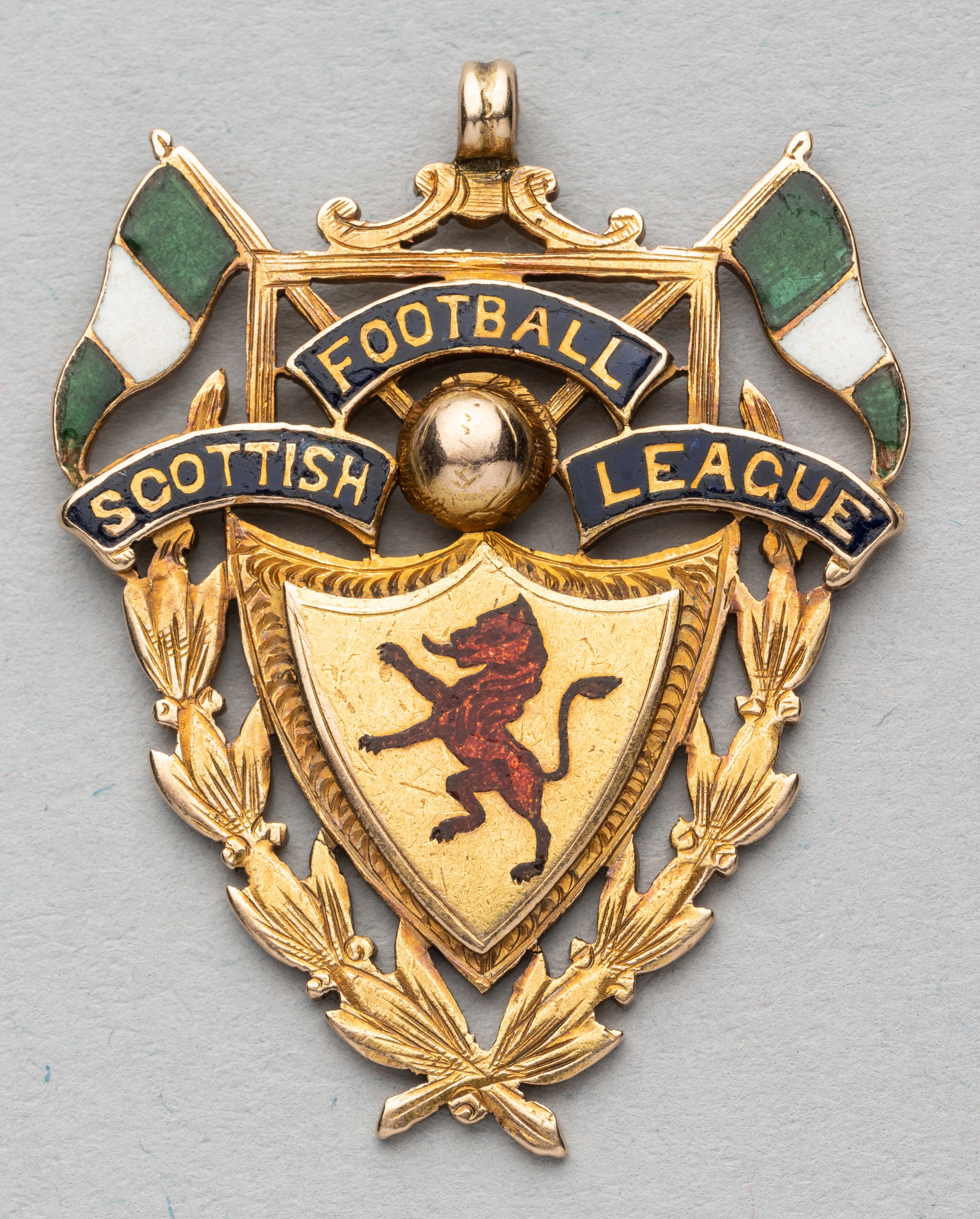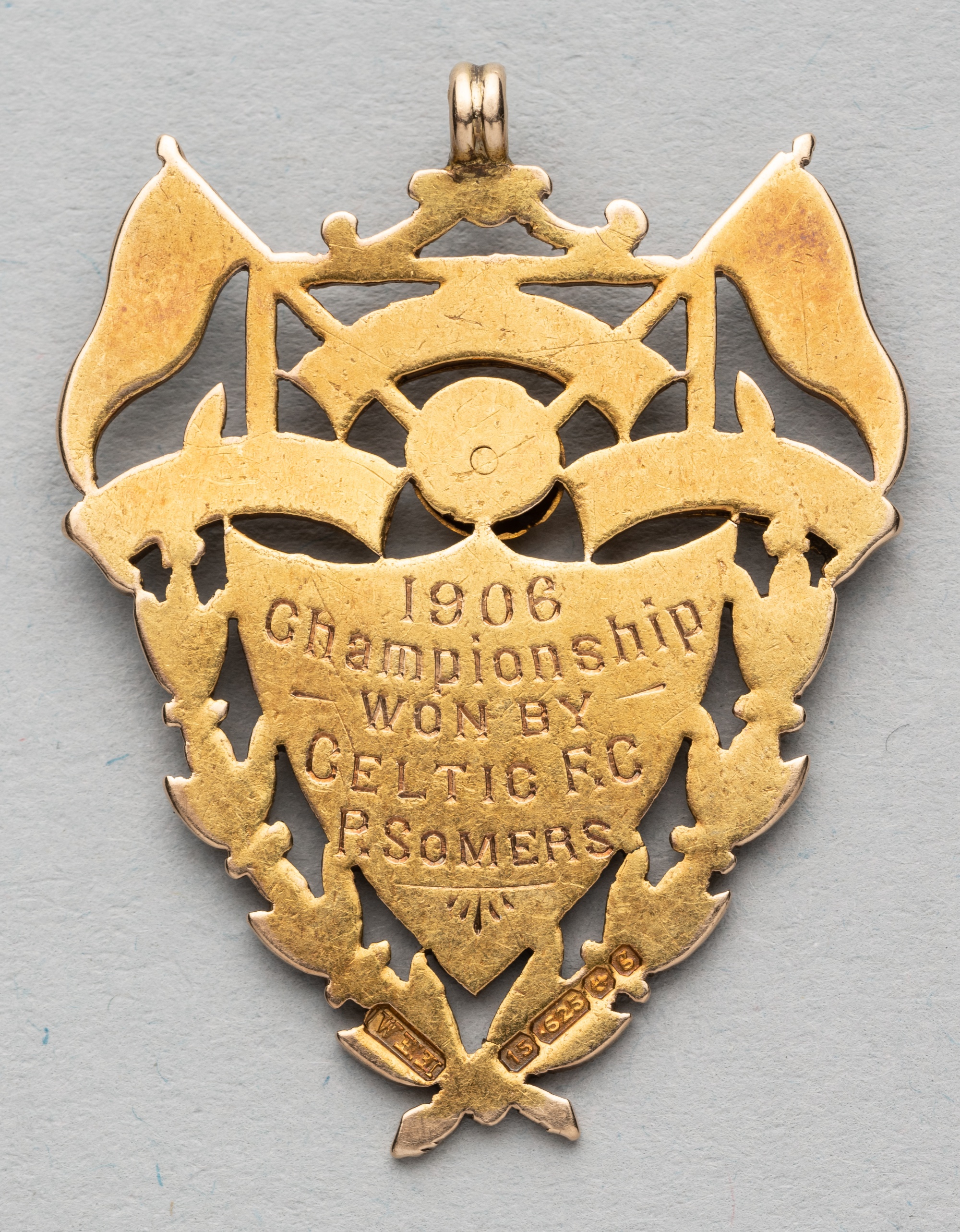 Scottish Football League championship winner's medal awarded to Celtic FC's Peter Somers, 1906, obverse with red enamelled lion rampant shield, with